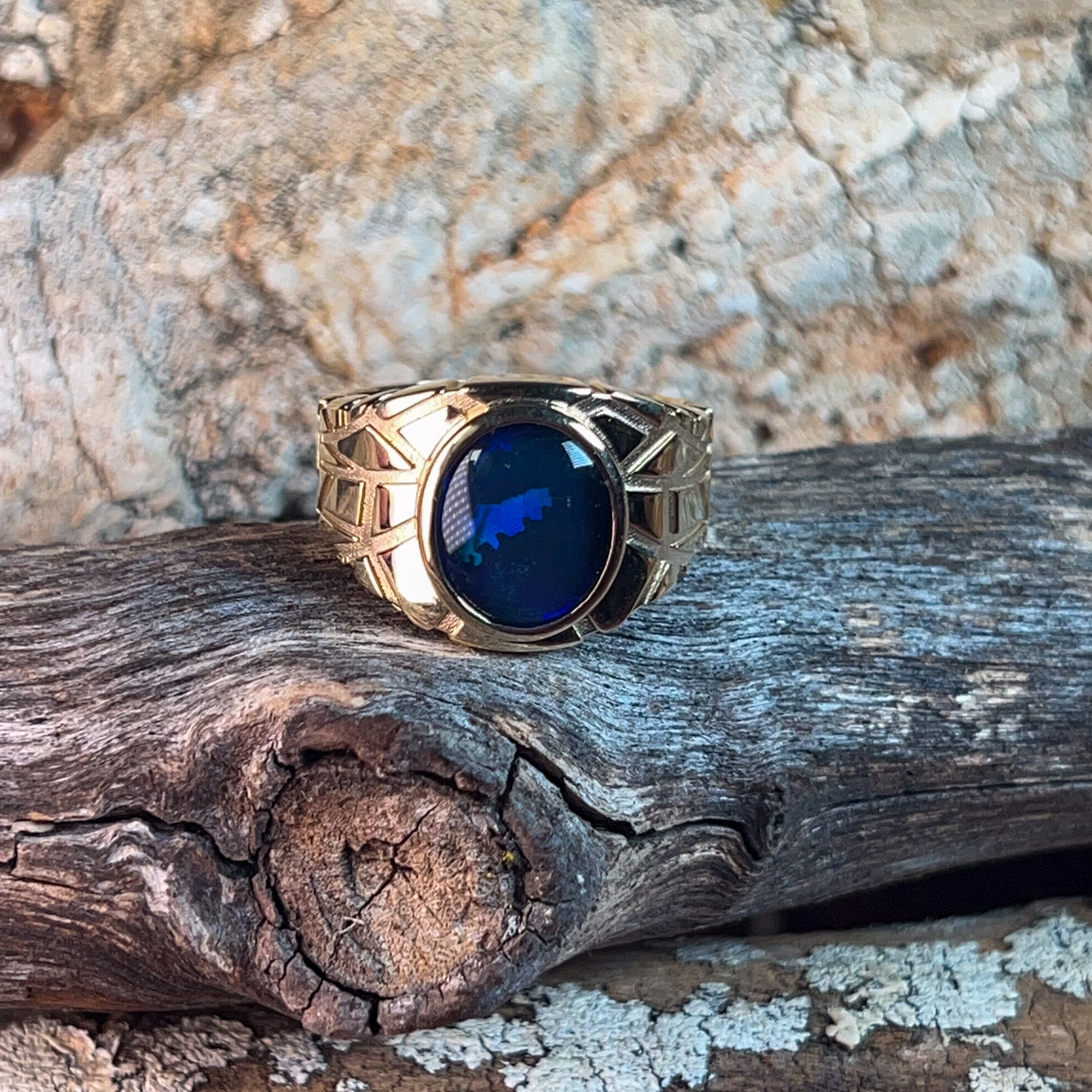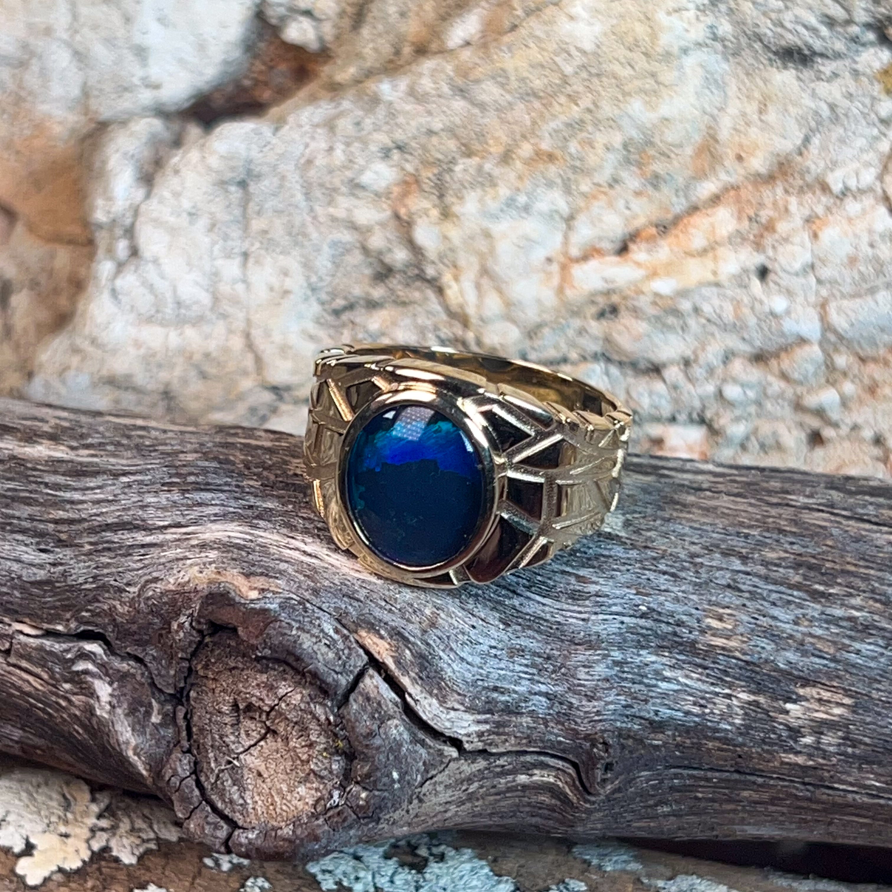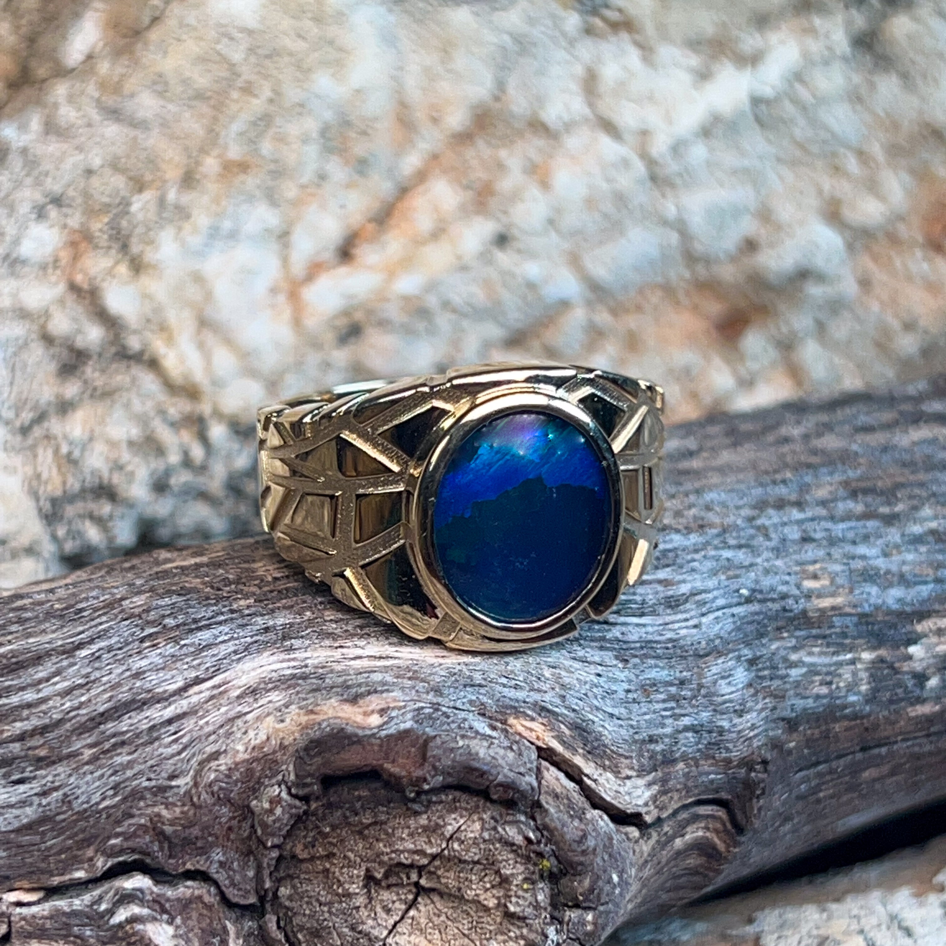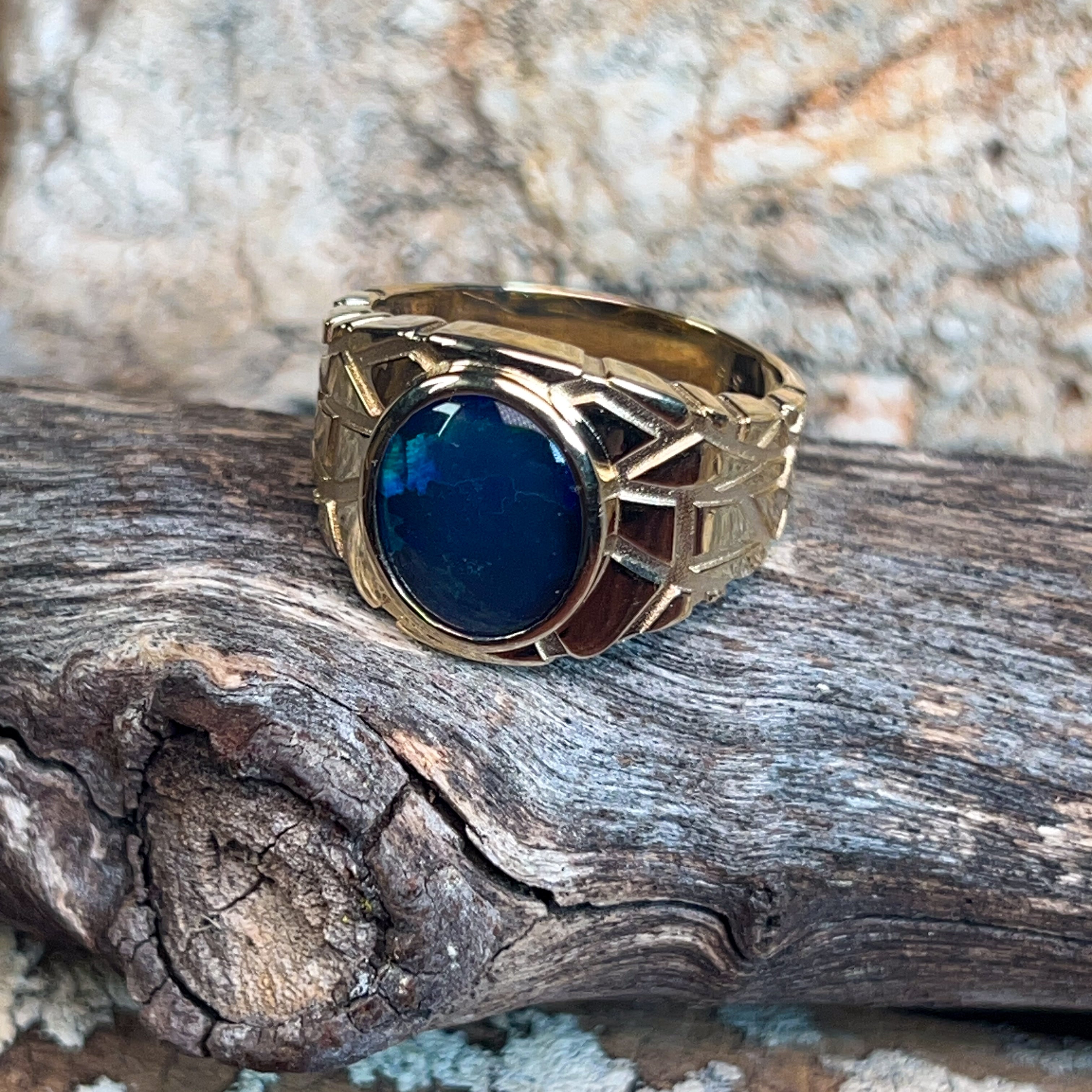 9kt Yellow Gold gents signet style ring with a 12x10mm Opal triplet bezel set