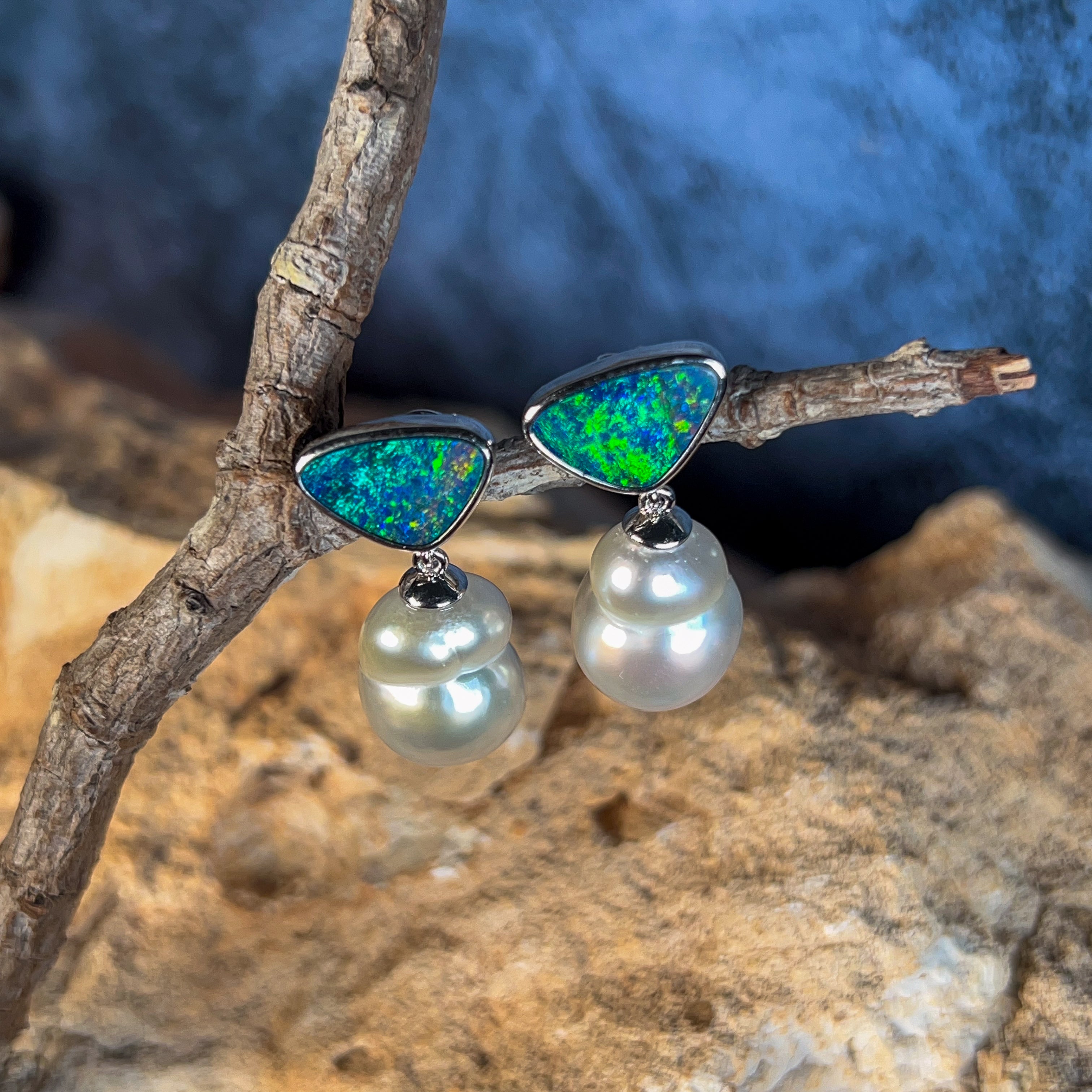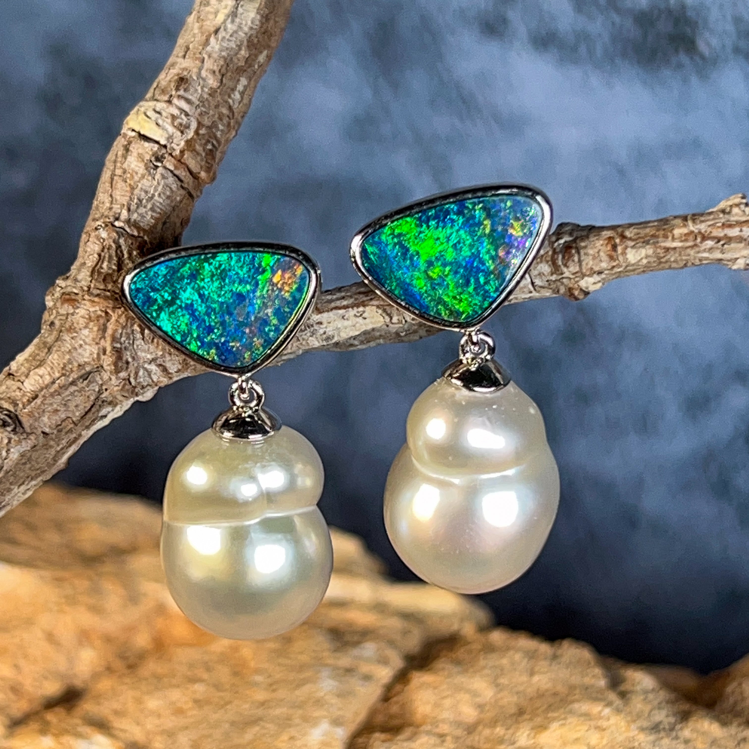 14kt White Gold South Sea Pearl and Opal dangling earrings