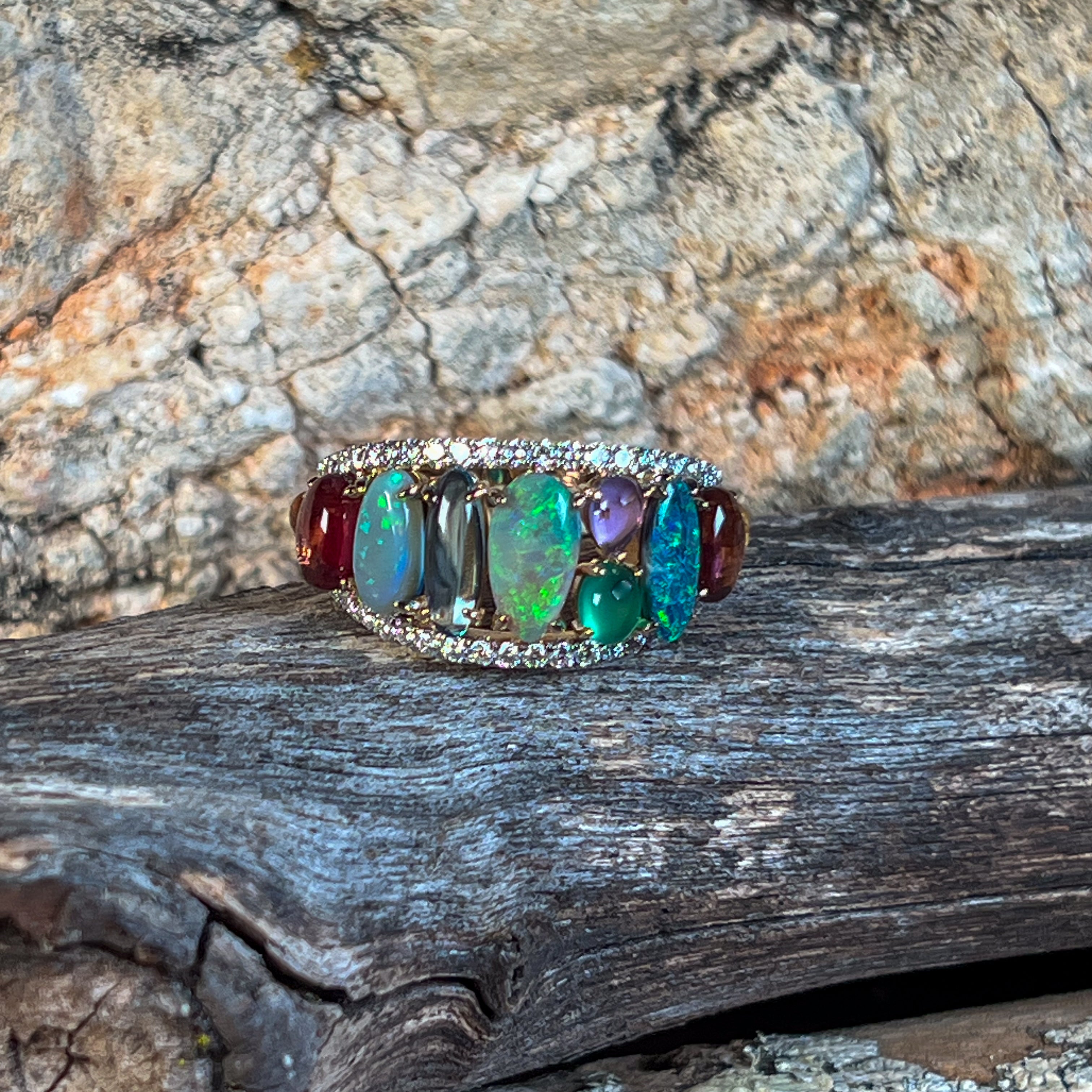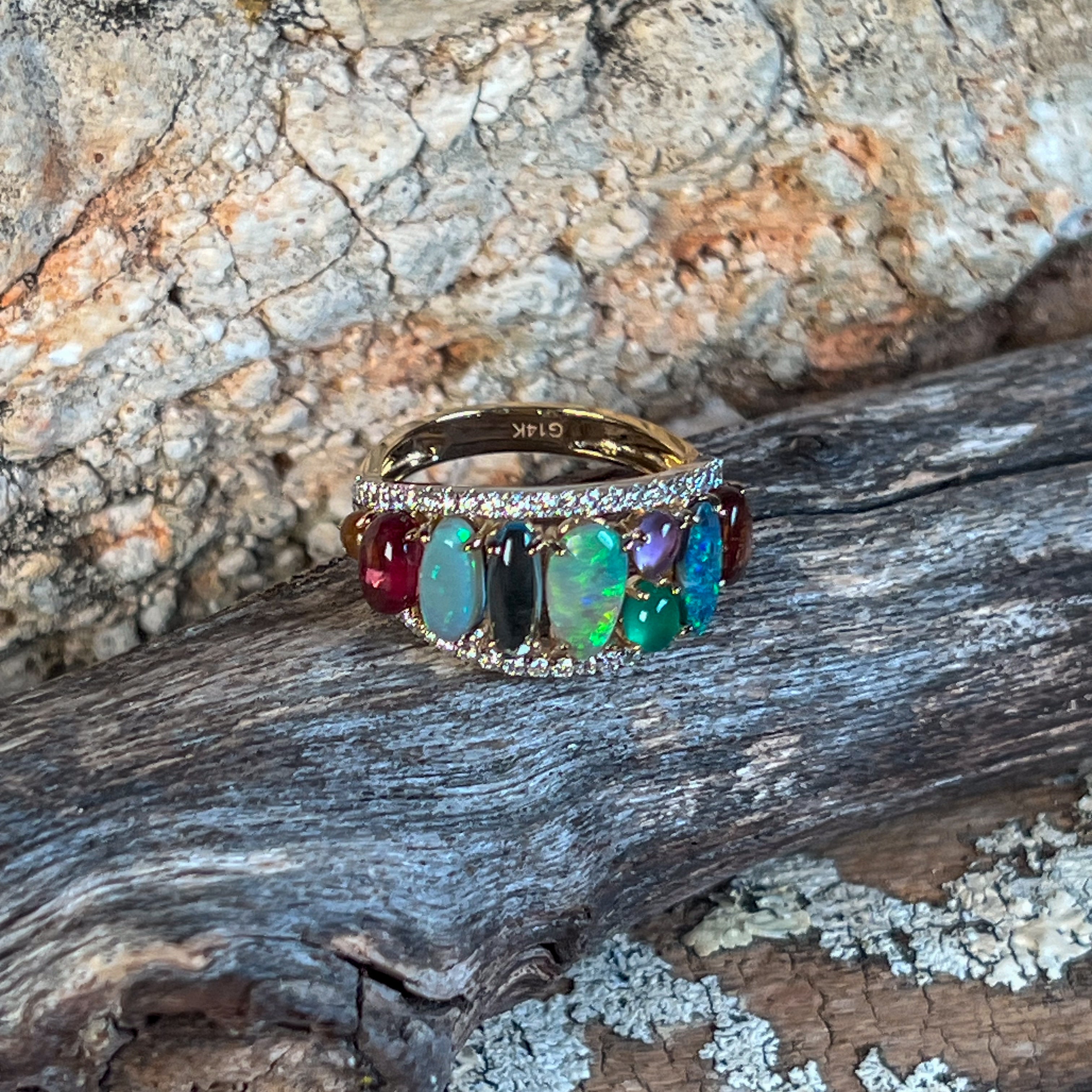 This stunning 14kt yellow gold eternity ring is where timeless elegance meets modern flair. The split band design creates an eye-catching silhouette, while a gorgeous opal takes centre stage surrounded by a rainbow of colourful gemstones. Perfect for those who refuse to choose between classic and bold, this designer piece celebrates individuality with every sparkle. A true masterpiece for the jewellery lover who wants their ring to do the talking.