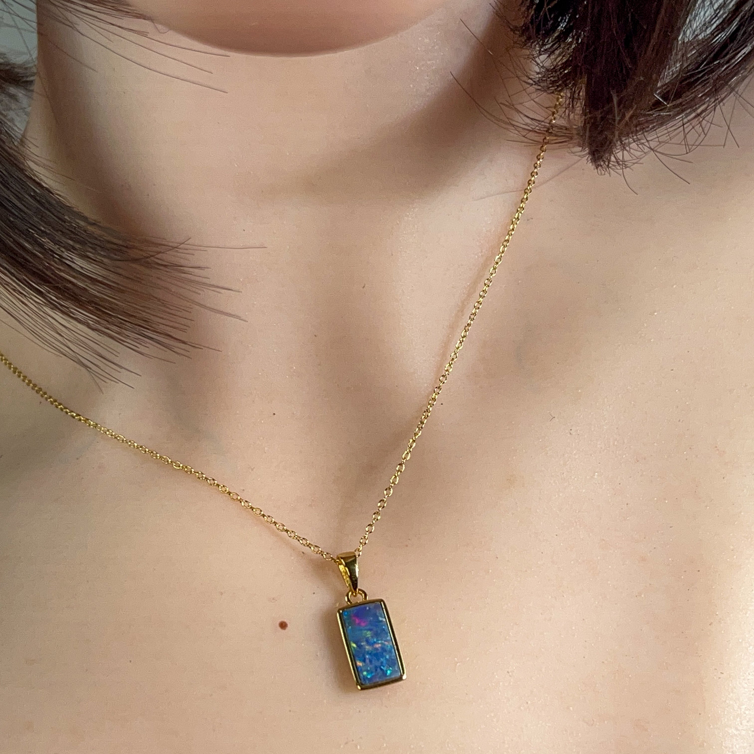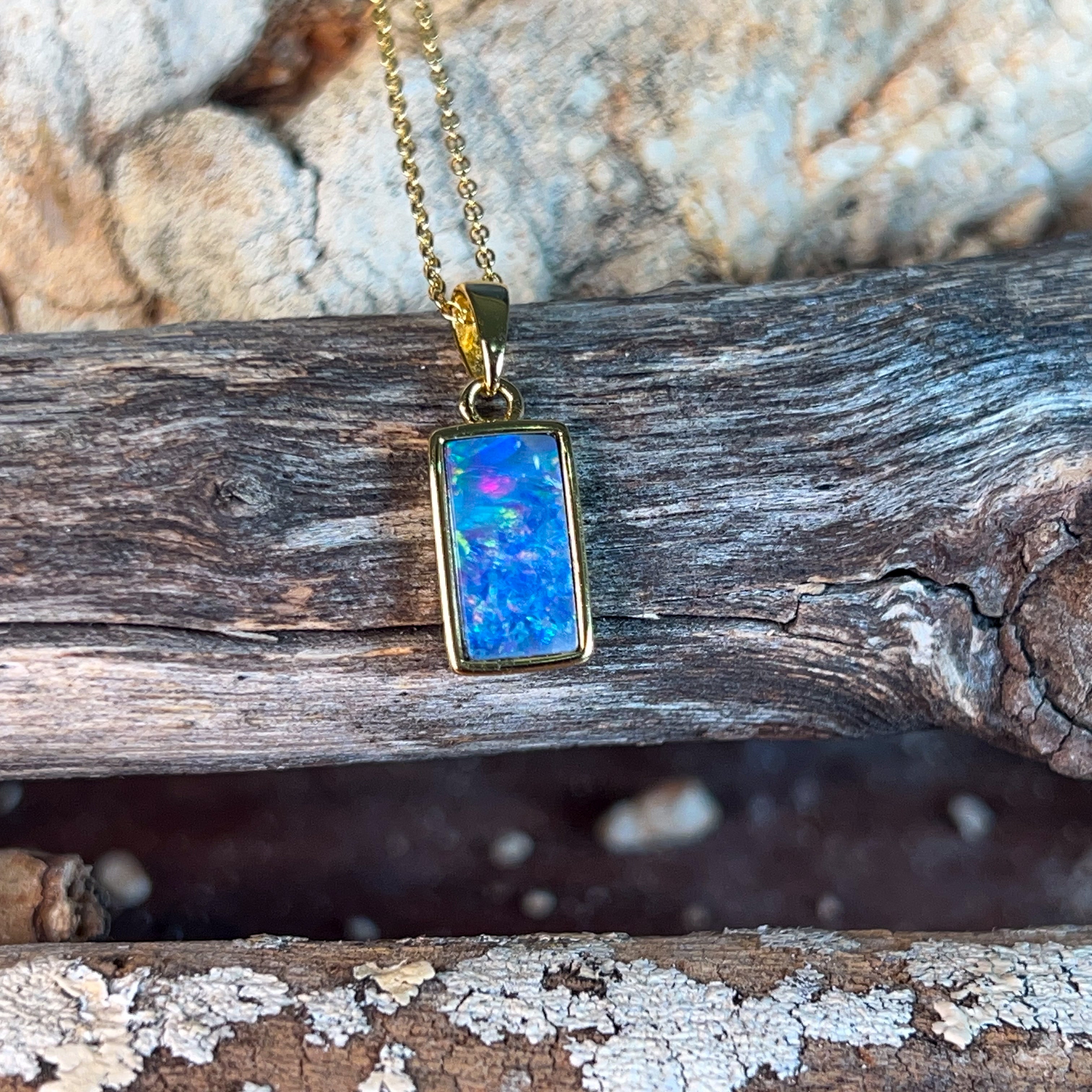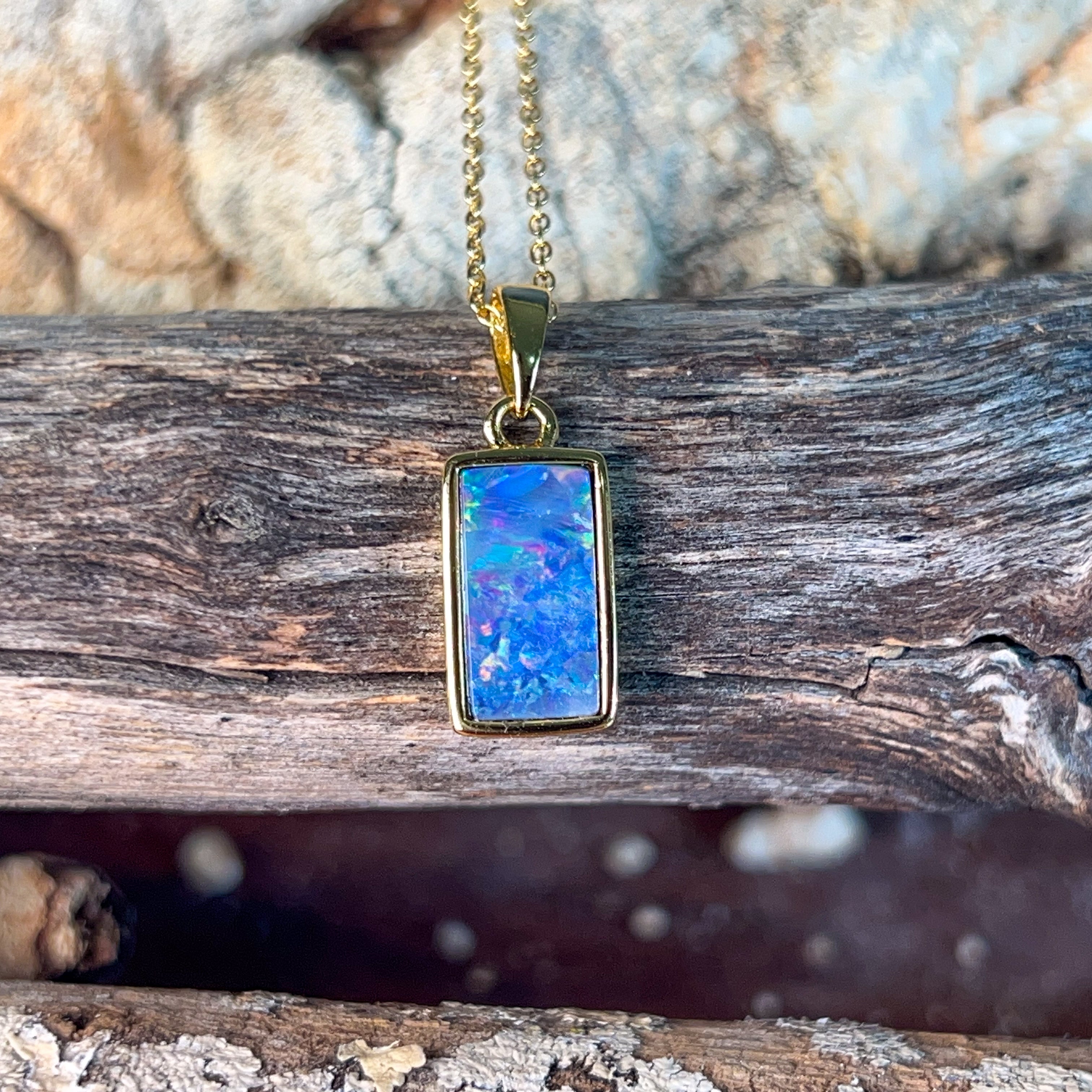 Elevate your everyday elegance with this striking gold-plated silver opal doublet pendant. The rectangular design showcases the mesmerizing play-of-colour unique to Australian opals, while the precious metal plating adds a luxurious finish that complements any complexion. Perfect for layering or wearing solo, this versatile piece transitions seamlessly from day to night. A contemporary take on timeless opal jewellery that captures light and attention with every movement.
