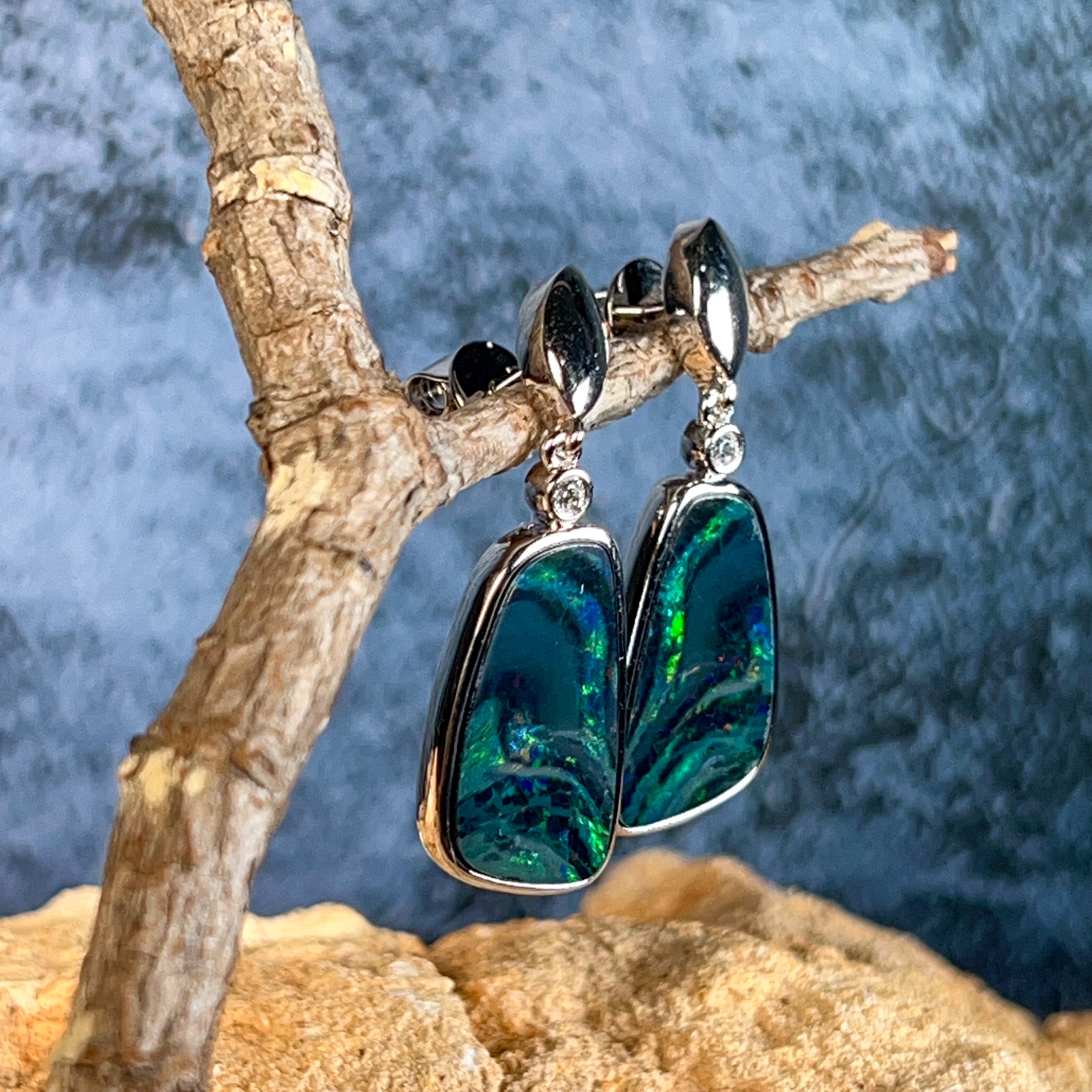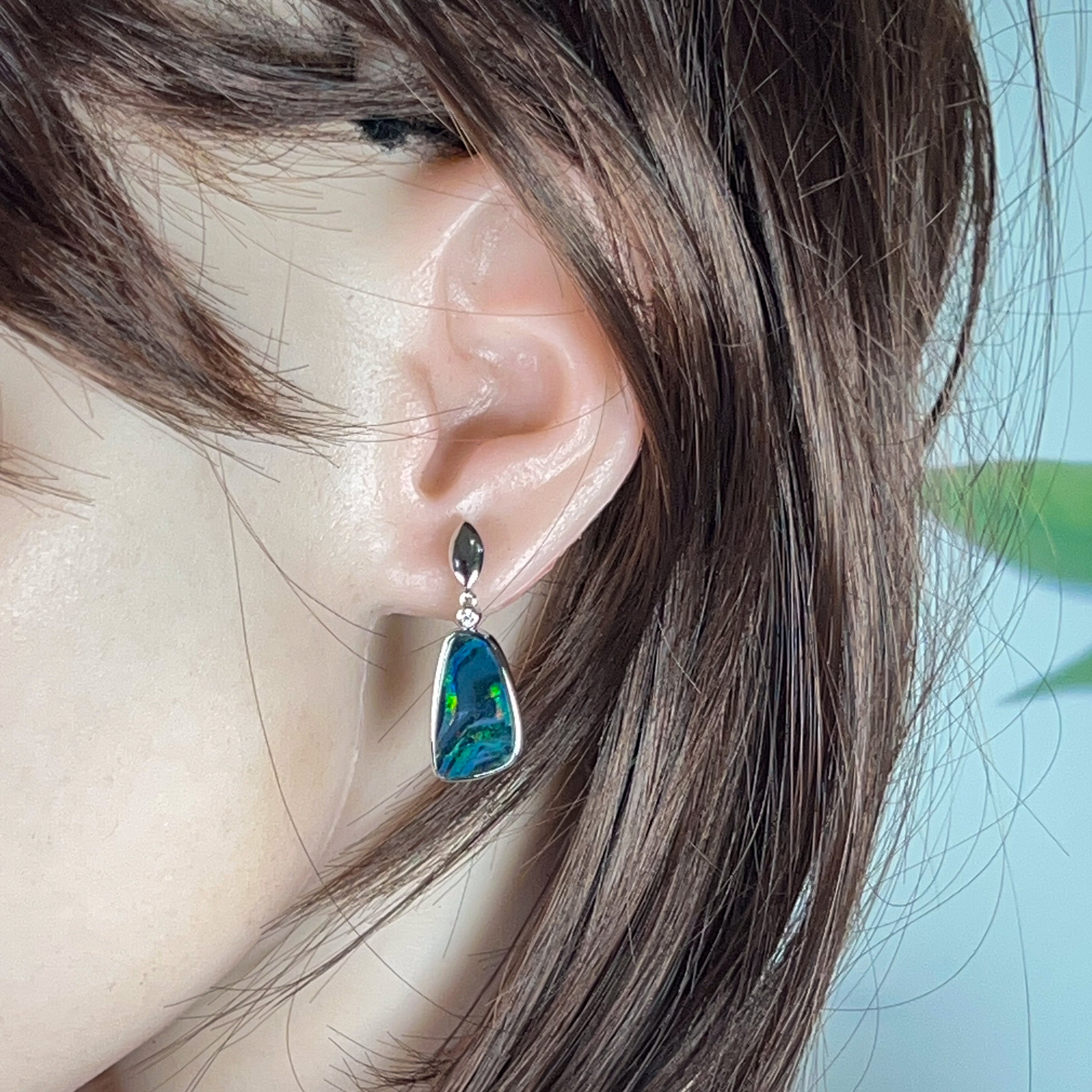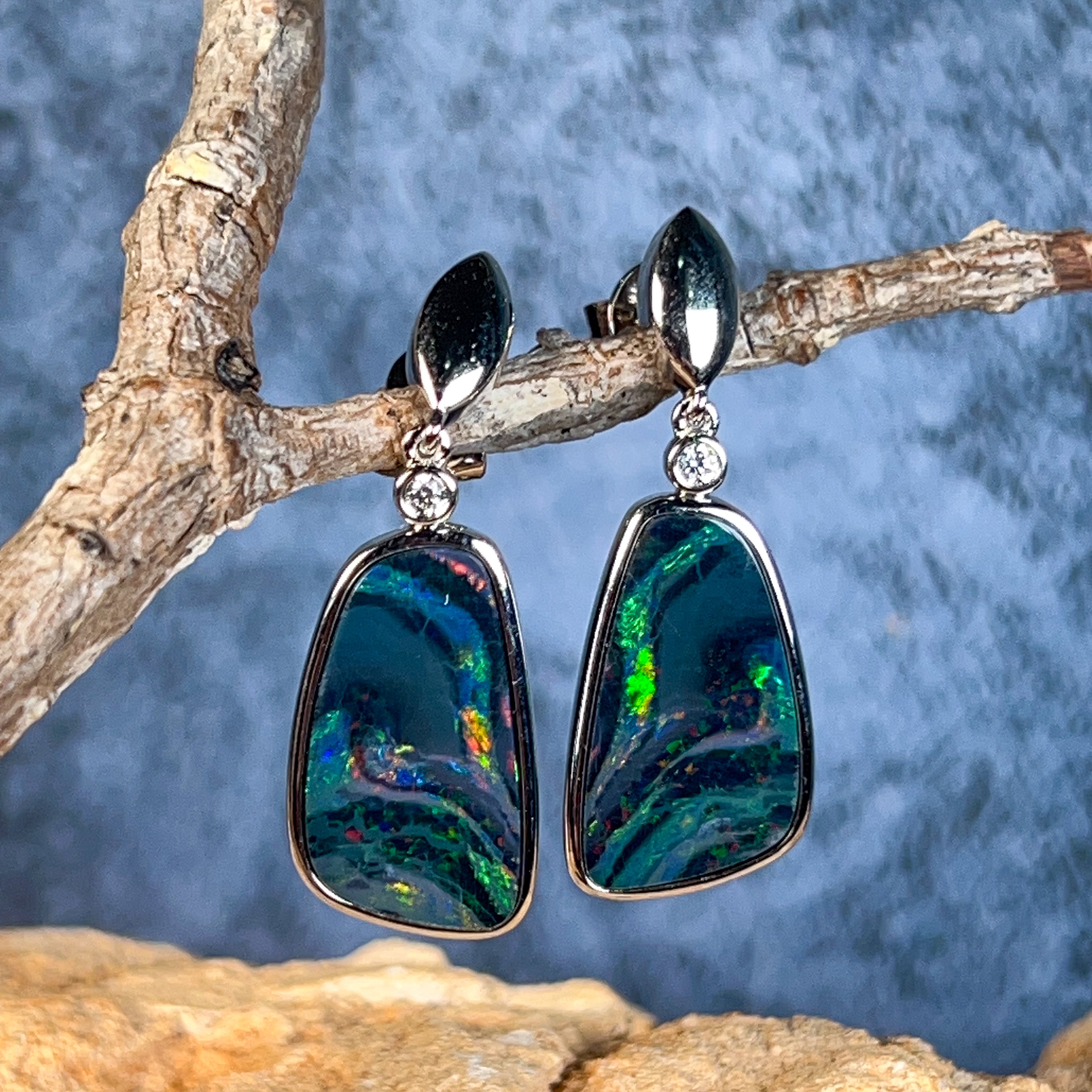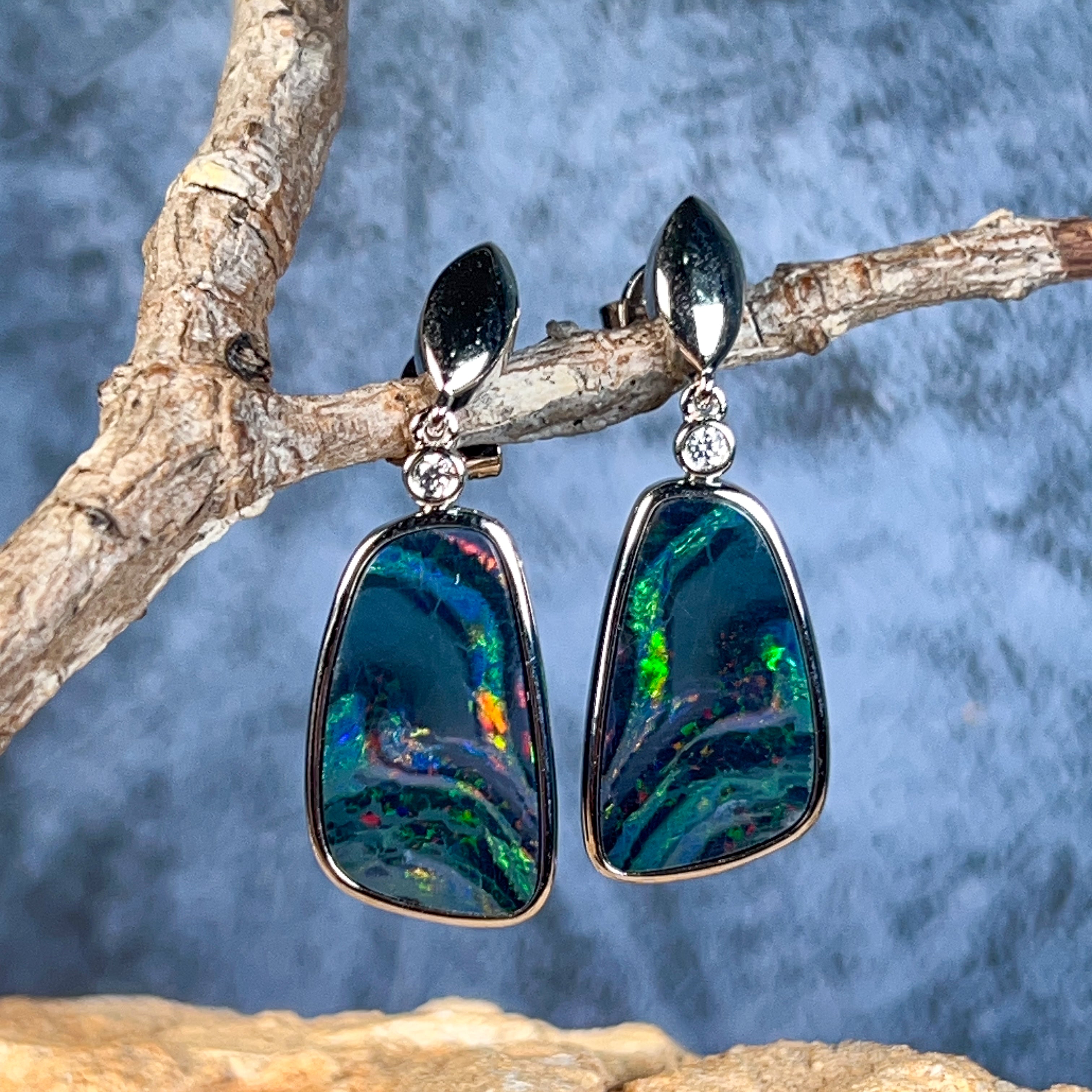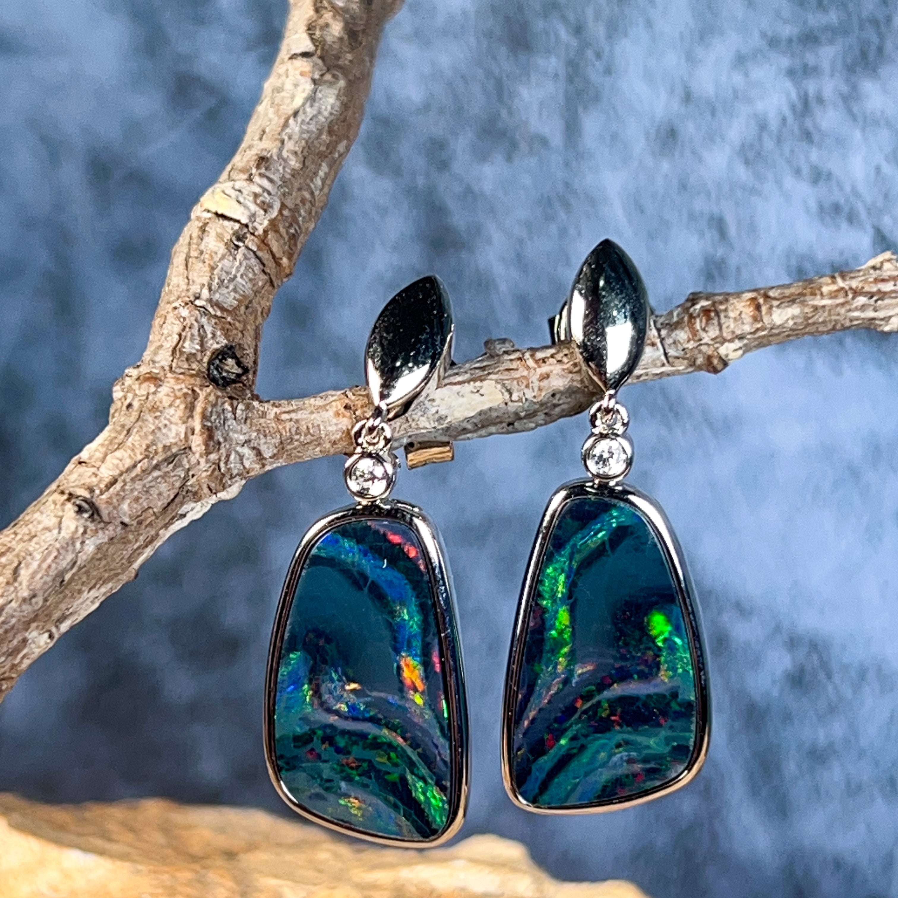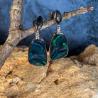 These sterling silver earrings showcase mesmerizing freeform opal doublets that dance with one-of-a-kind colour patterns. Each stone tells its own story through swirling hues of green, blue, orange, and gold that shift and shimmer as you move. At 8.4 carats total, these dangling beauties catch the light beautifully, making them perfect for adding a splash of natural wonder to any outfit. Playful, elegant, and utterly unique—no two pairs are ever quite the same.