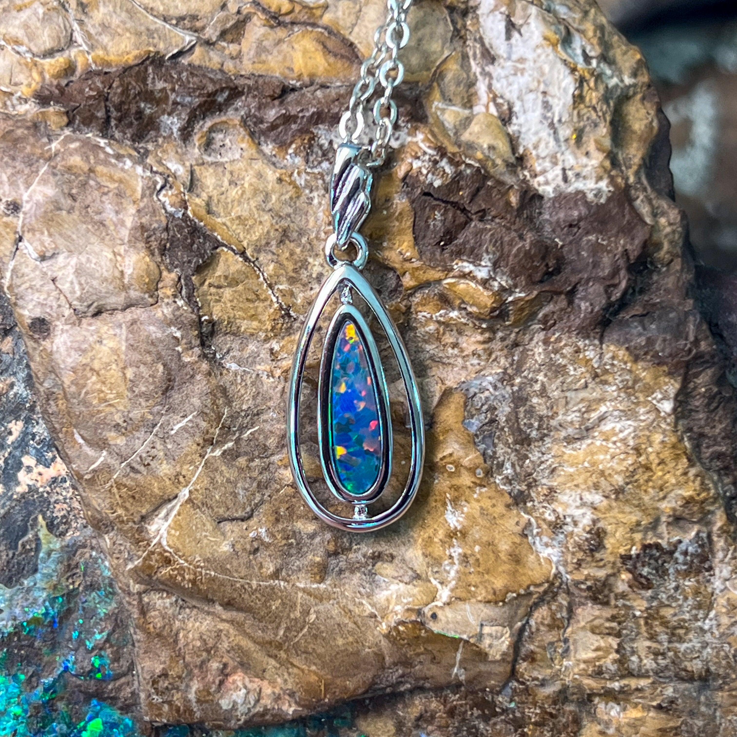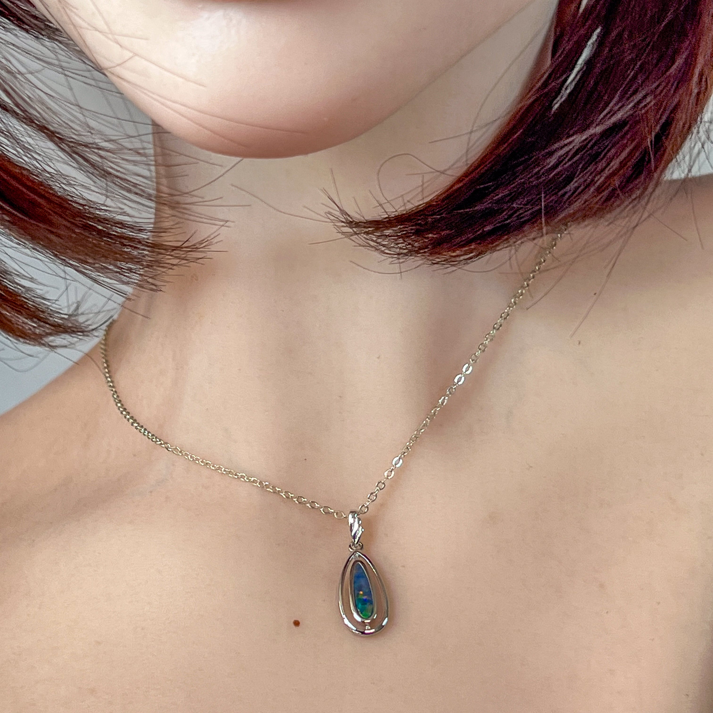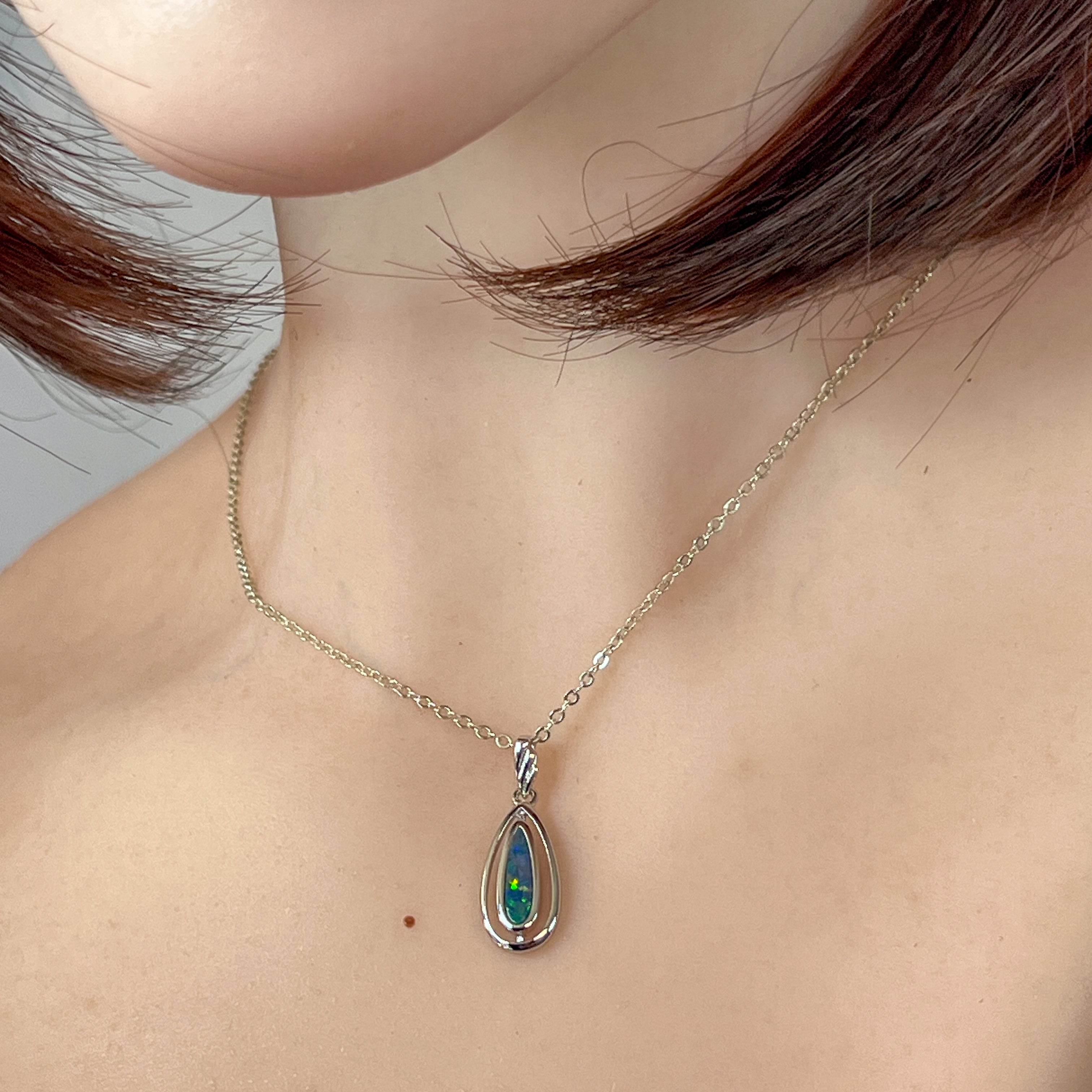 Elevate your elegance with this sterling silver teardrop opal doublet pendant. Its sleek, modern design highlights the opal’s vibrant play of color, making it a refined statement piece for any occasion. Crafted to complement both casual and formal attire, this pendant adds a touch of sophistication and timeless beauty to your jewelry collection.