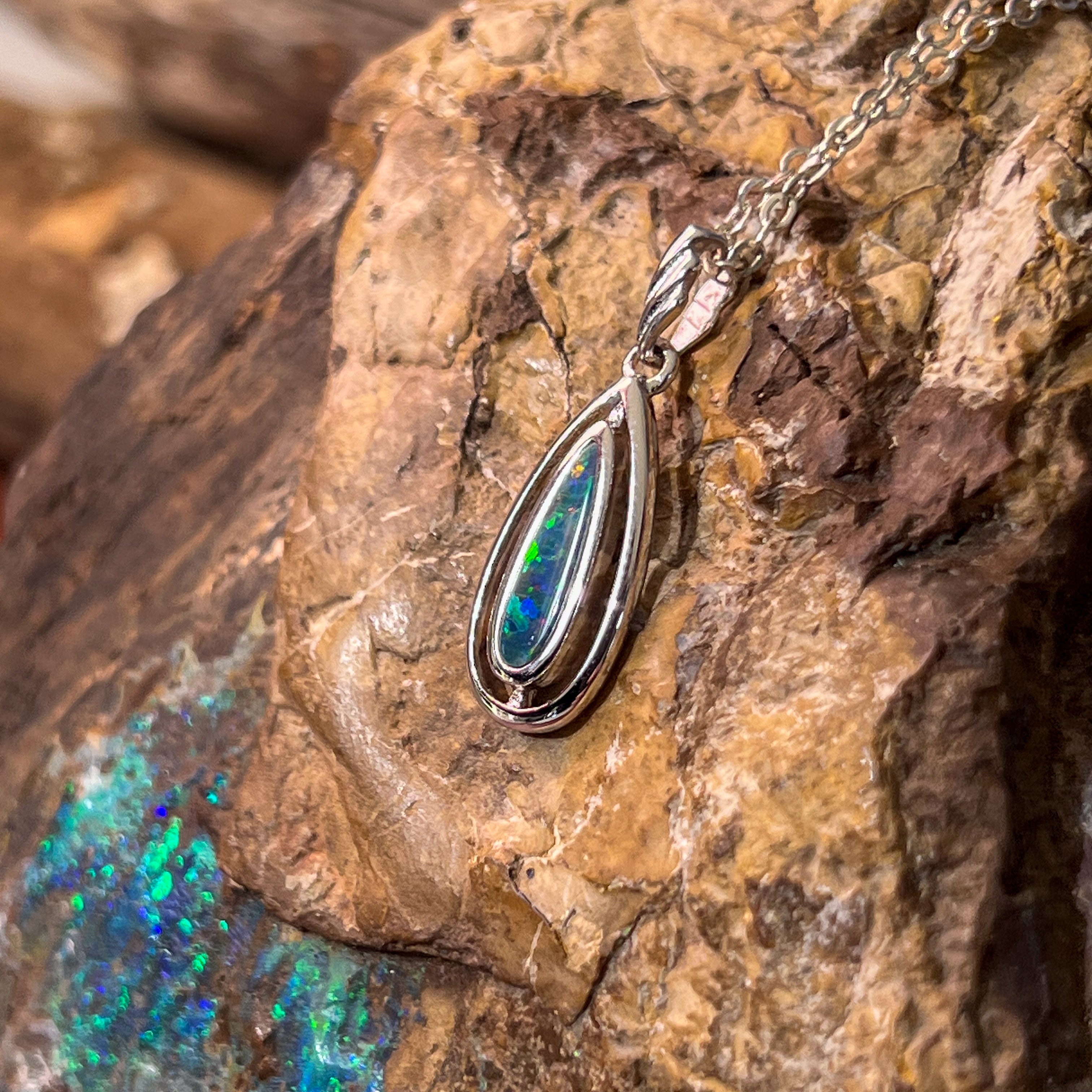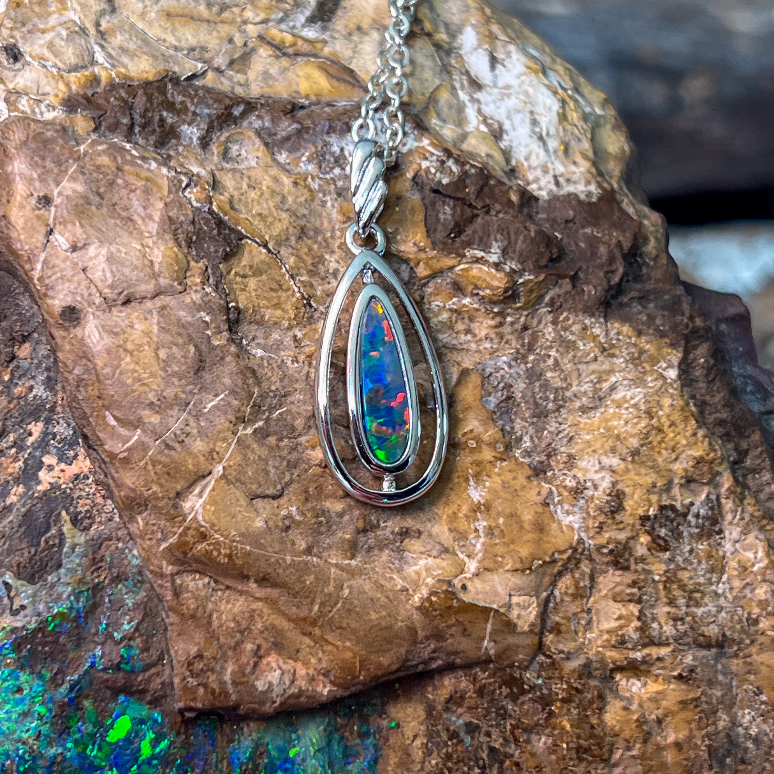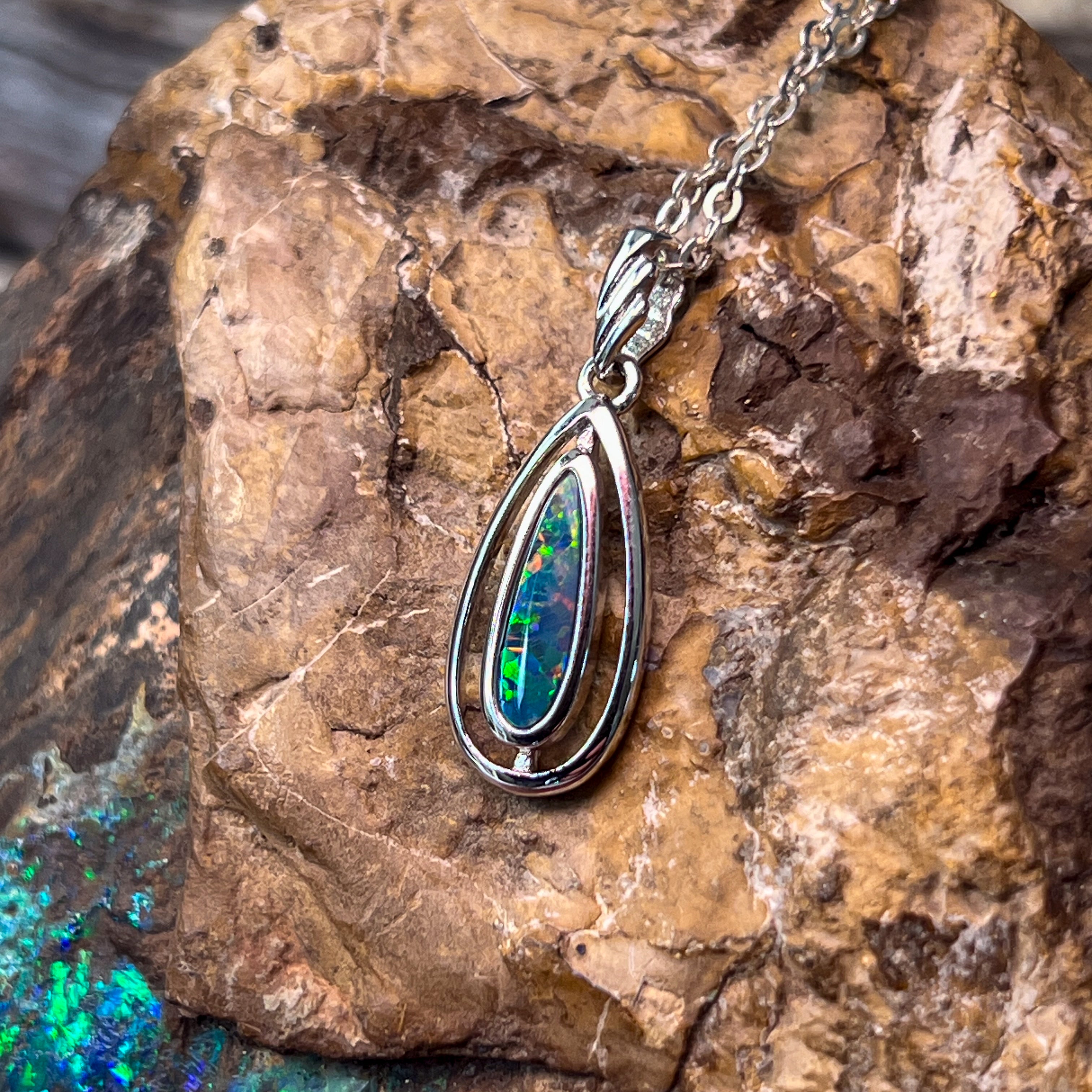 Elevate your elegance with this sterling silver teardrop opal doublet pendant. Its sleek, modern design highlights the opal’s vibrant play of color, making it a refined statement piece for any occasion. Crafted to complement both casual and formal attire, this pendant adds a touch of sophistication and timeless beauty to your jewelry collection.
