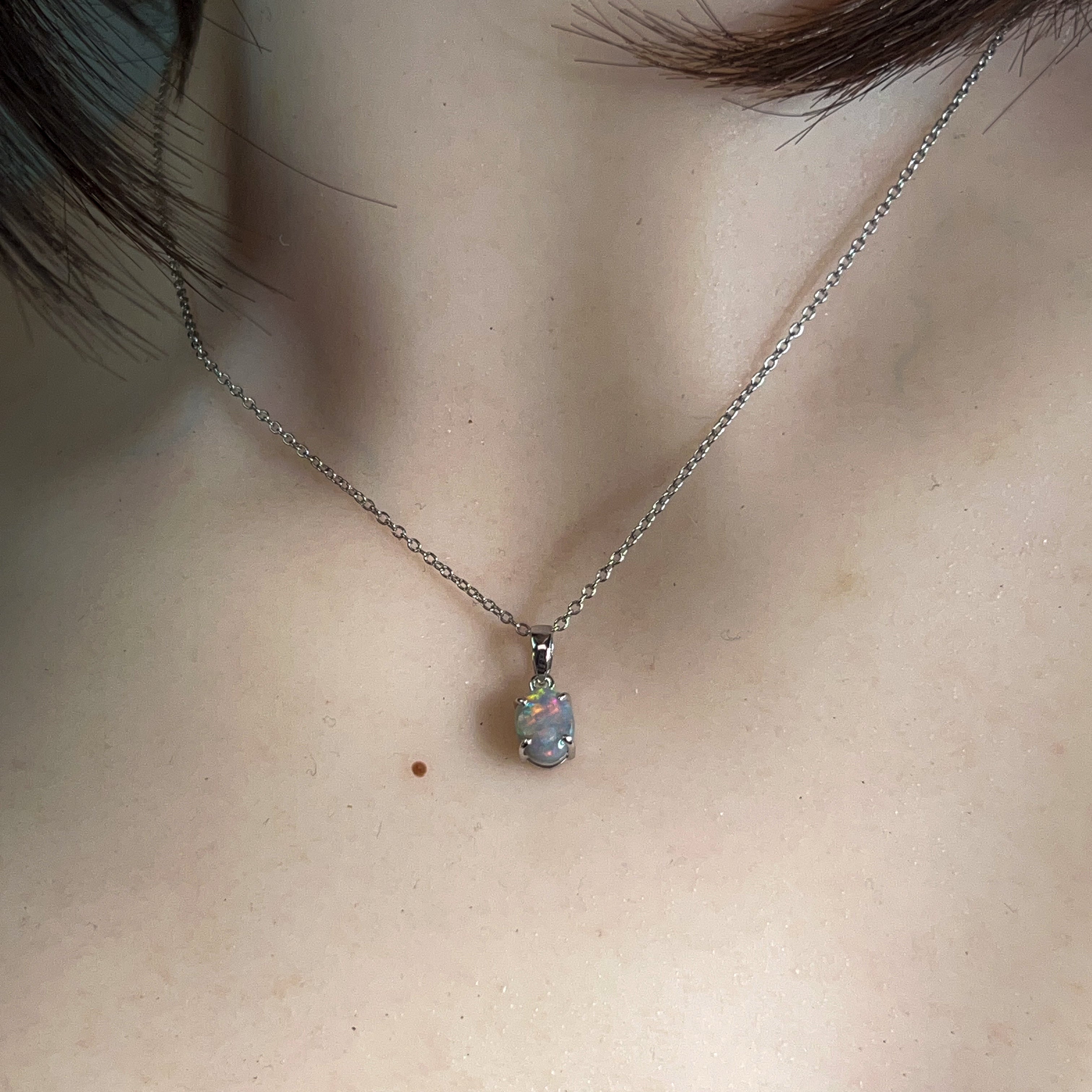 Elevate your everyday elegance with this exquisite 9kt white gold pendant featuring a stunning 0.5ct black opal. The delicate design showcases the opal's mesmerising play of colour against the lustrous white gold setting, creating a refined piece that transitions effortlessly from day to night. Perfect for those who appreciate understated sophistication, this dainty pendant captures the natural beauty of Australian black opal in a wearable work of art. A timeless investment that speaks volumes through its subtle charm.