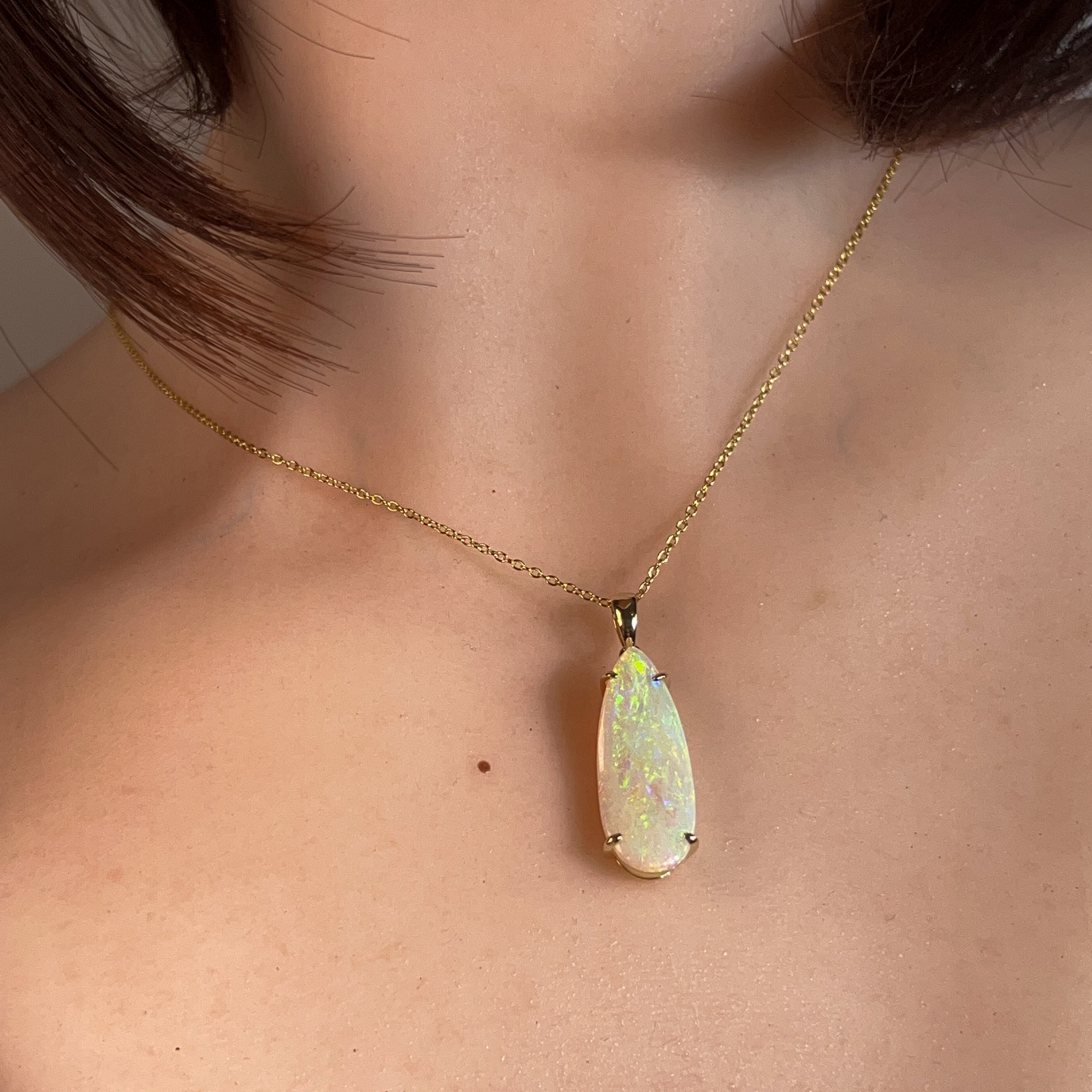 Wear a slice of Australian sunshine around your neck! This stunning 9kt yellow gold pendant showcases a radiant 6.3ct light opal that dances with mesmerizing flashes of colour. The warm glow of yellow gold perfectly complements the opal's ethereal play-of-colour, creating a piece that's equal parts elegant and enchanting. Perfect for those who love a touch of natural magic in their everyday style.