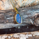 Elevate your everyday elegance with this stunning gold-plated silver opal pendant. Featuring a captivating 14x9mm doublet opal, this piece combines the mesmerizing play-of-colour that opals are renowned for with the timeless sophistication of precious metals. The doublet construction offers exceptional durability while maintaining that coveted opal brilliance. Perfect for layering or wearing solo, this pendant makes a refined statement that transitions effortlessly from day to night. A modern essential for opal lovers seeking quality craftsmanship and contemporary style.