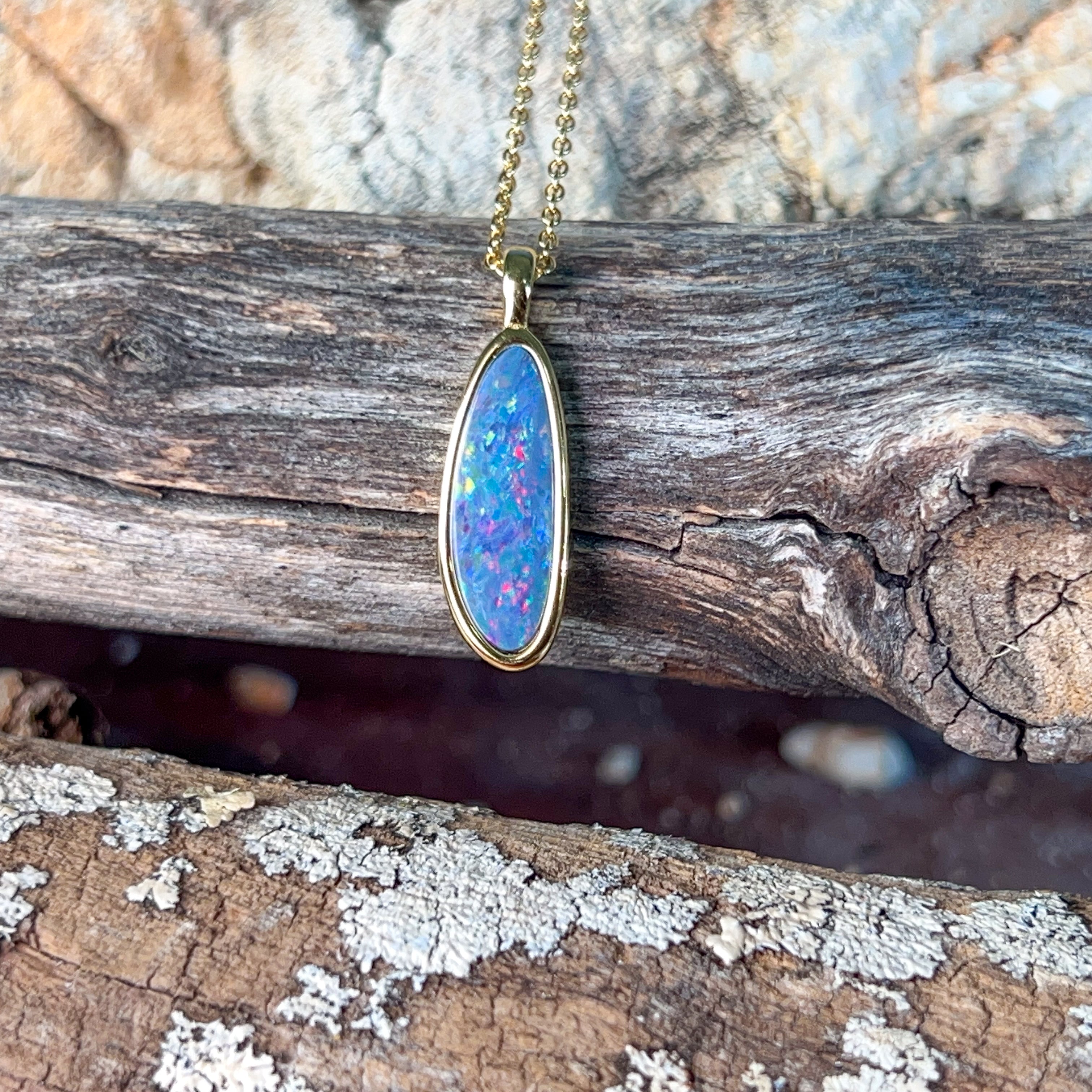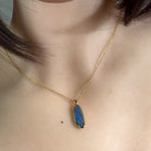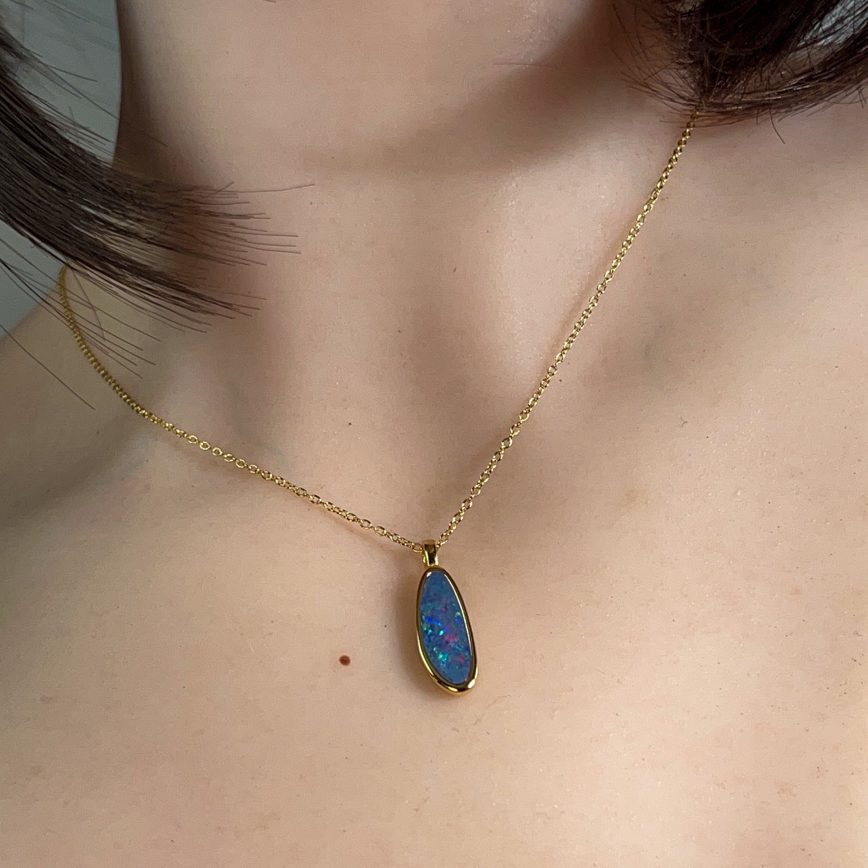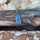 Elevate your jewellery collection with this stunning opal doublet pendant, expertly crafted from sterling silver and finished with luxurious gold plating. The generous 19x7mm opal doublet showcases mesmerizing colour play and natural beauty, making it an eye-catching statement piece for any occasion. Whether you're dressing up for a special event or adding everyday elegance to your look, this pendant combines timeless sophistication with the captivating allure of genuine opal. The durable gold-plated sterling silver setting ensures lasting quality and radiance. A versatile treasure that transforms any outfit into something truly extraordinary.