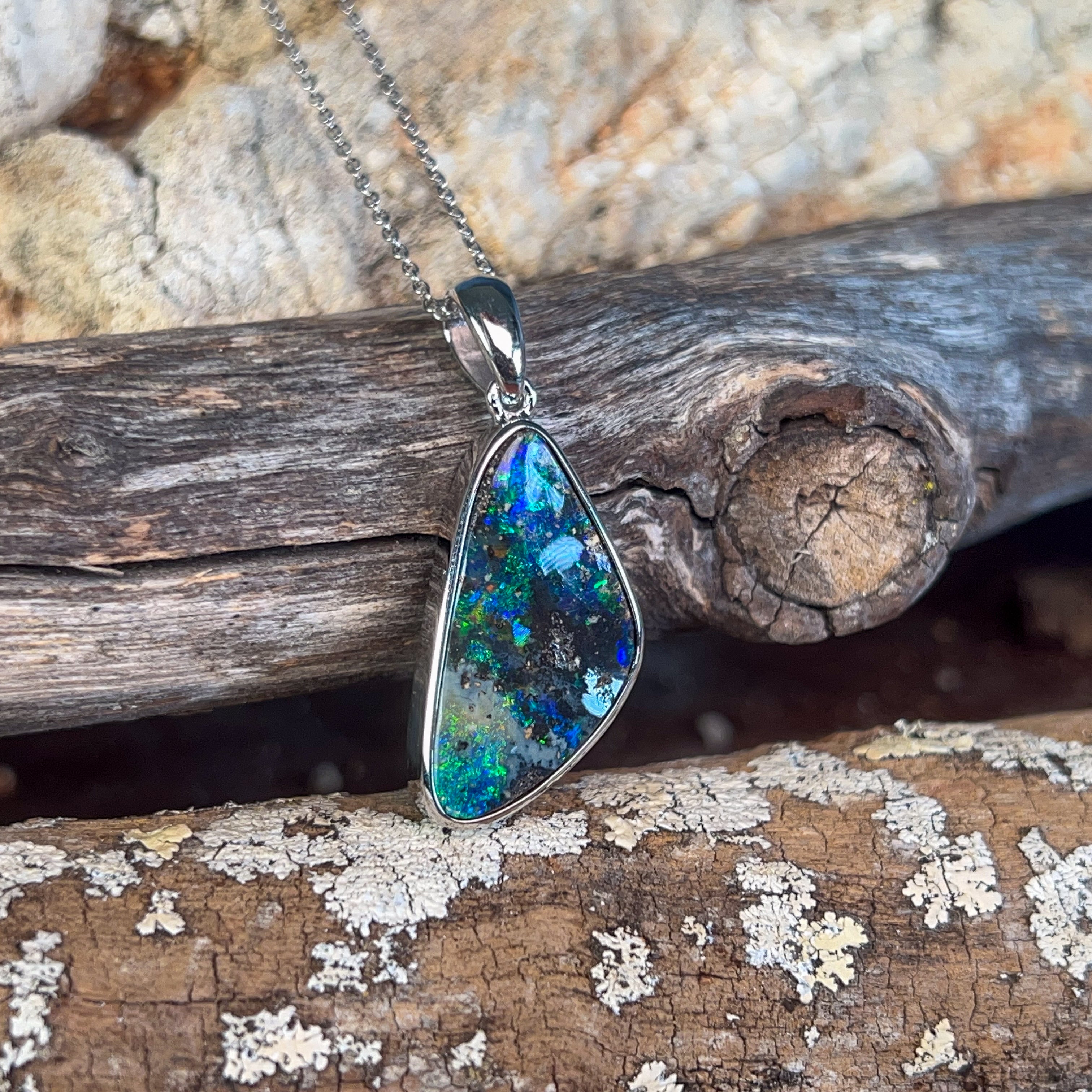 Sterling Silver Boulder Opal 10.3ct Pendant Showcase the raw beauty of nature with this striking boulder opal pendant, featuring a generous 10.3-carat stone set in lustrous sterling silver. Boulder opals are prized for their mesmerizing play-of-colour and unique patterns, making each piece truly one-of-a-kind. The substantial carat weight ensures a bold, eye-catching presence that commands attention, while the classic sterling silver setting provides timeless elegance and durability. Perfect for those who appreciate authentic gemstones with character and depth, this pendant transforms any outfit into a statement of sophistication and natural wonder.