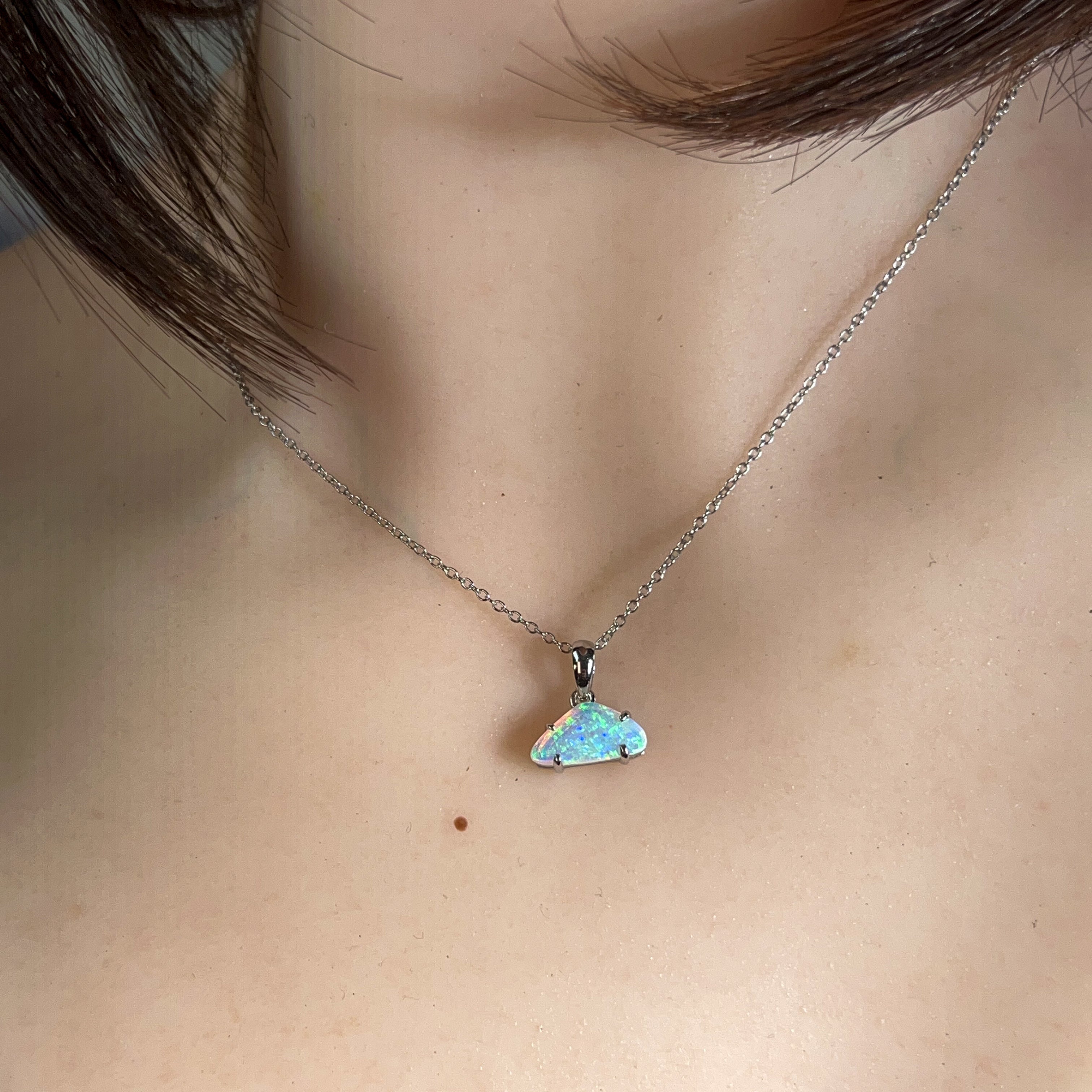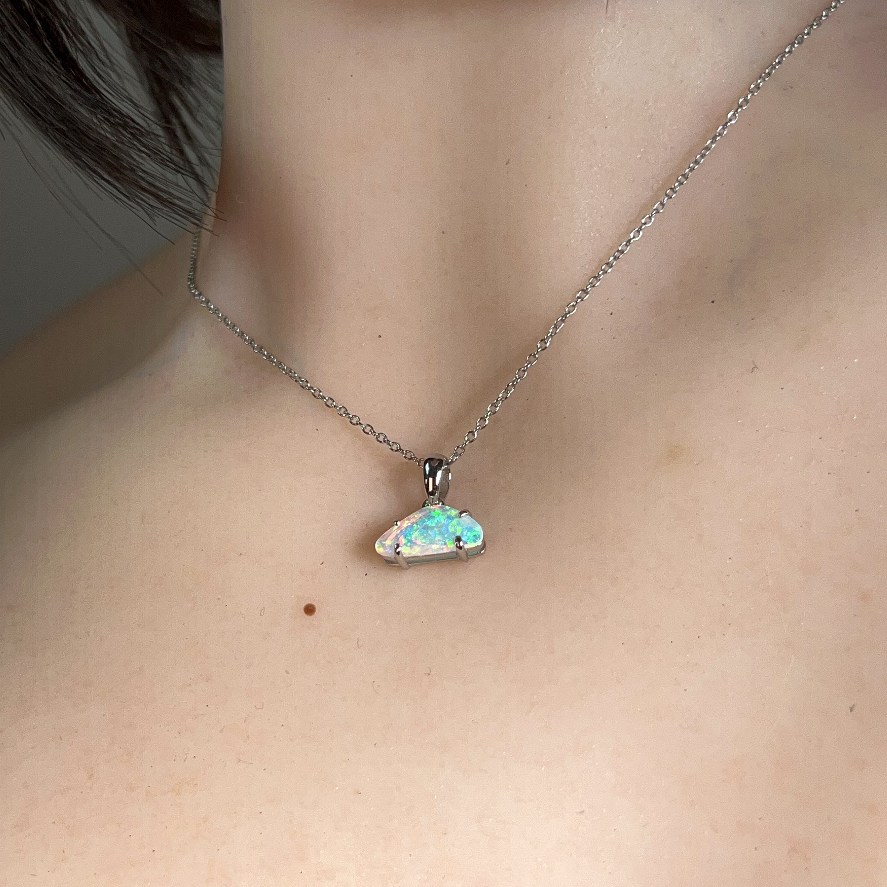 Elevate your everyday elegance with this exquisite sterling silver pendant featuring a stunning 0.9ct triangular crystal opal. The delicate design showcases the opal's mesmerizing play of colour in a refined, understated setting that complements any style. Perfect for layering or wearing solo, this dainty piece captures light beautifully while maintaining an effortlessly sophisticated aesthetic. A timeless investment in natural beauty that transitions seamlessly from day to night.