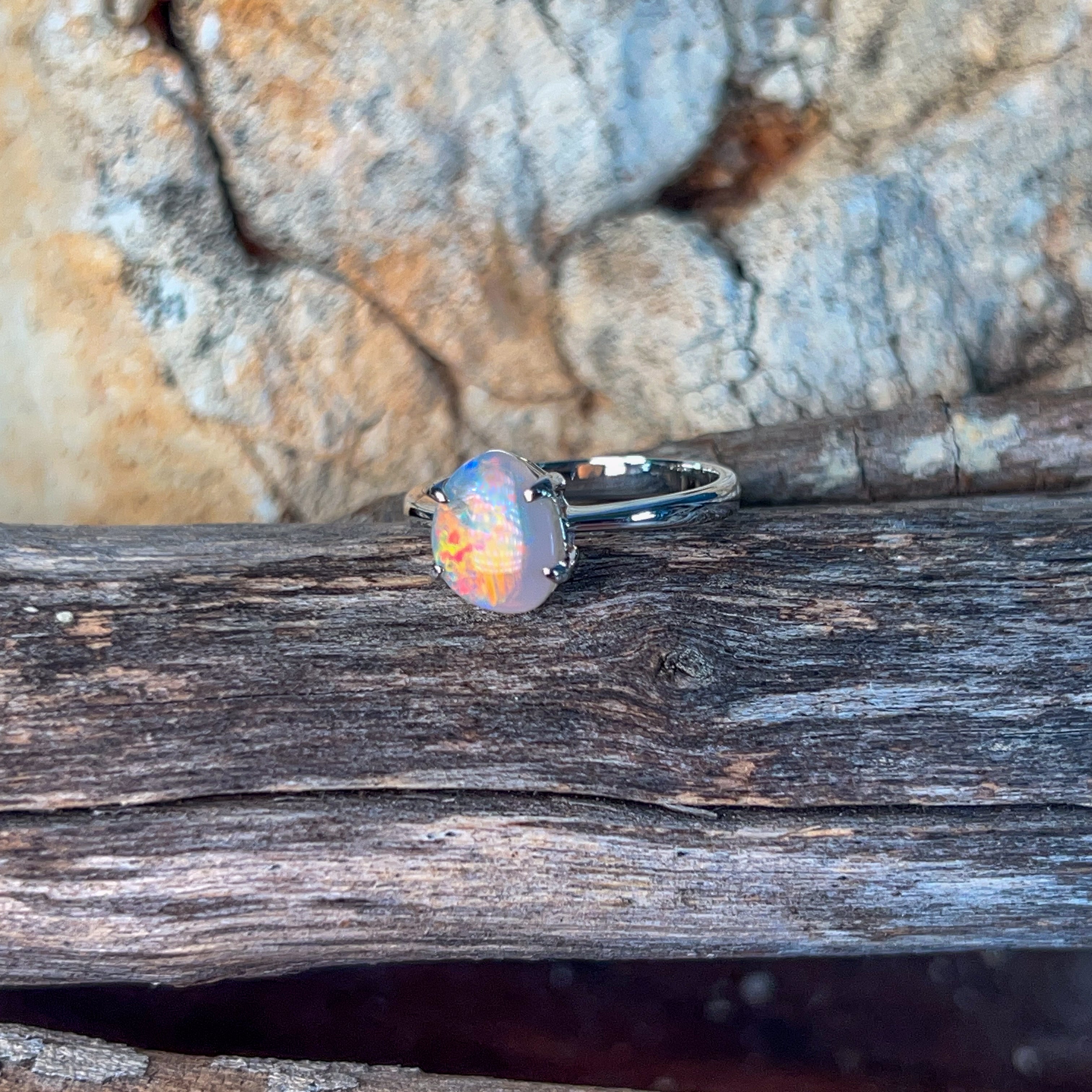 Ignite your finger with this stunning 14kt white gold ring, where a mesmerizing black opal takes centre stage. Watch as fiery reds, oranges, and golden yellows dance across the stone's surface, creating a spectacular light show with every movement. The cool elegance of white gold perfectly frames the opal's warm, vibrant hues, making this 1ct beauty a true showstopper. Perfect for those who dare to wear nature's most dazzling gemstone.