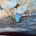 Elevate your everyday elegance with this stunning solitaire ring, featuring a captivating 16x11mm opal doublet set in lustrous gold-plated silver. The play-of-colour unique to opal creates an mesmerising focal point that catches light beautifully, making this piece perfect for those who appreciate timeless sophistication with a modern twist. The secure solitaire setting showcases your opal's natural beauty while the precious metal base ensures durability and lasting shine. A versatile treasure that transitions seamlessly from casual wear to special occasions, this ring is an investment in wearable art that you'll treasure for years to come.