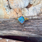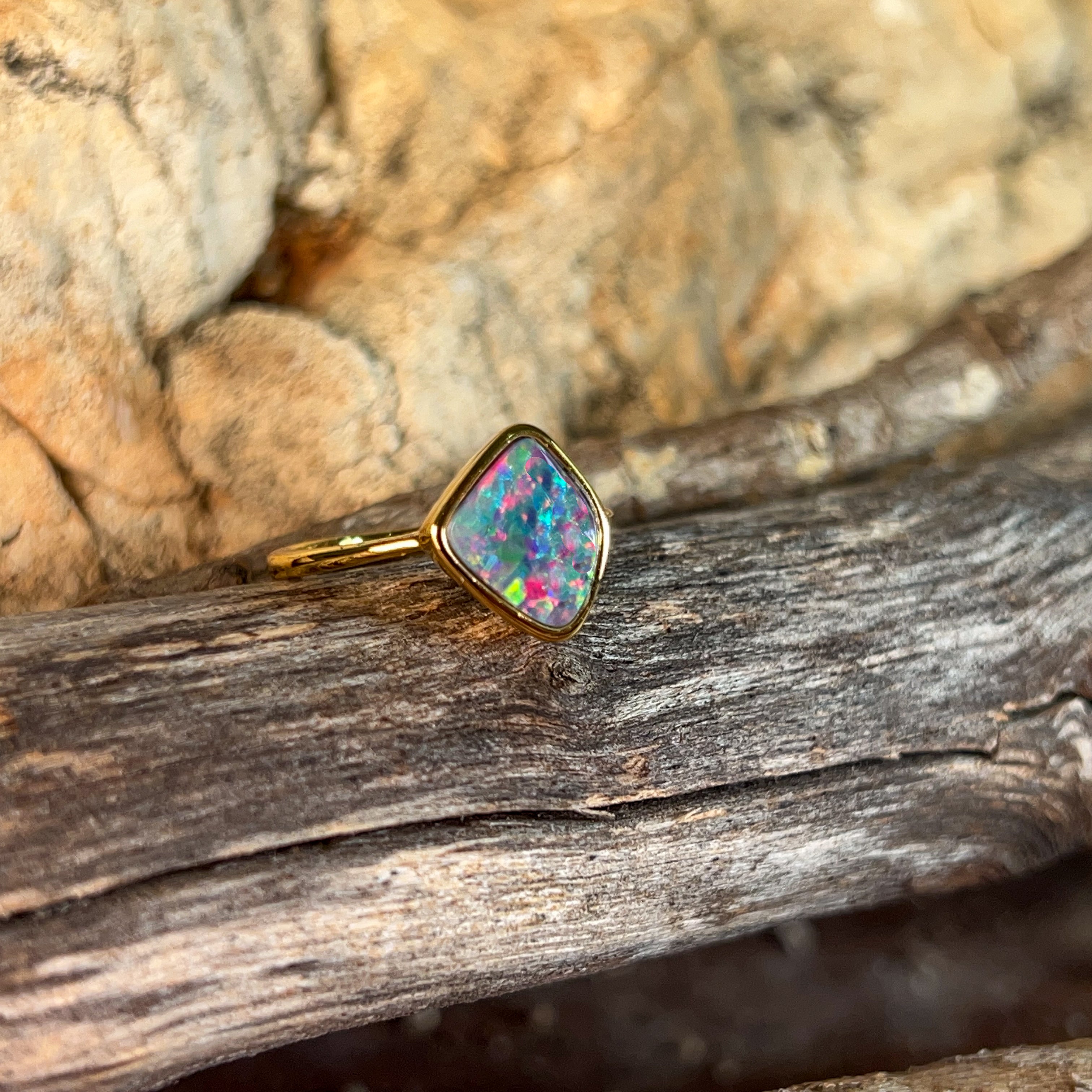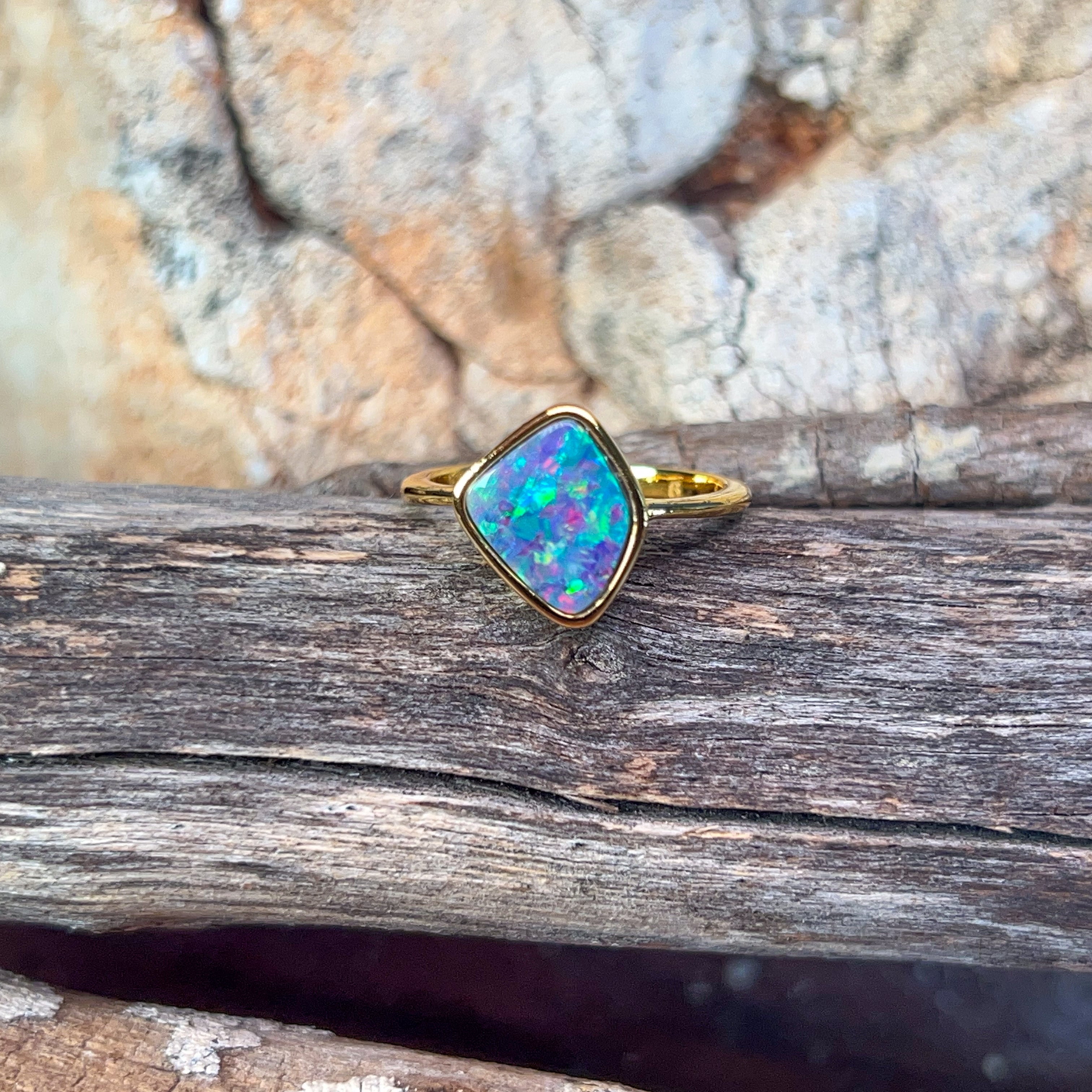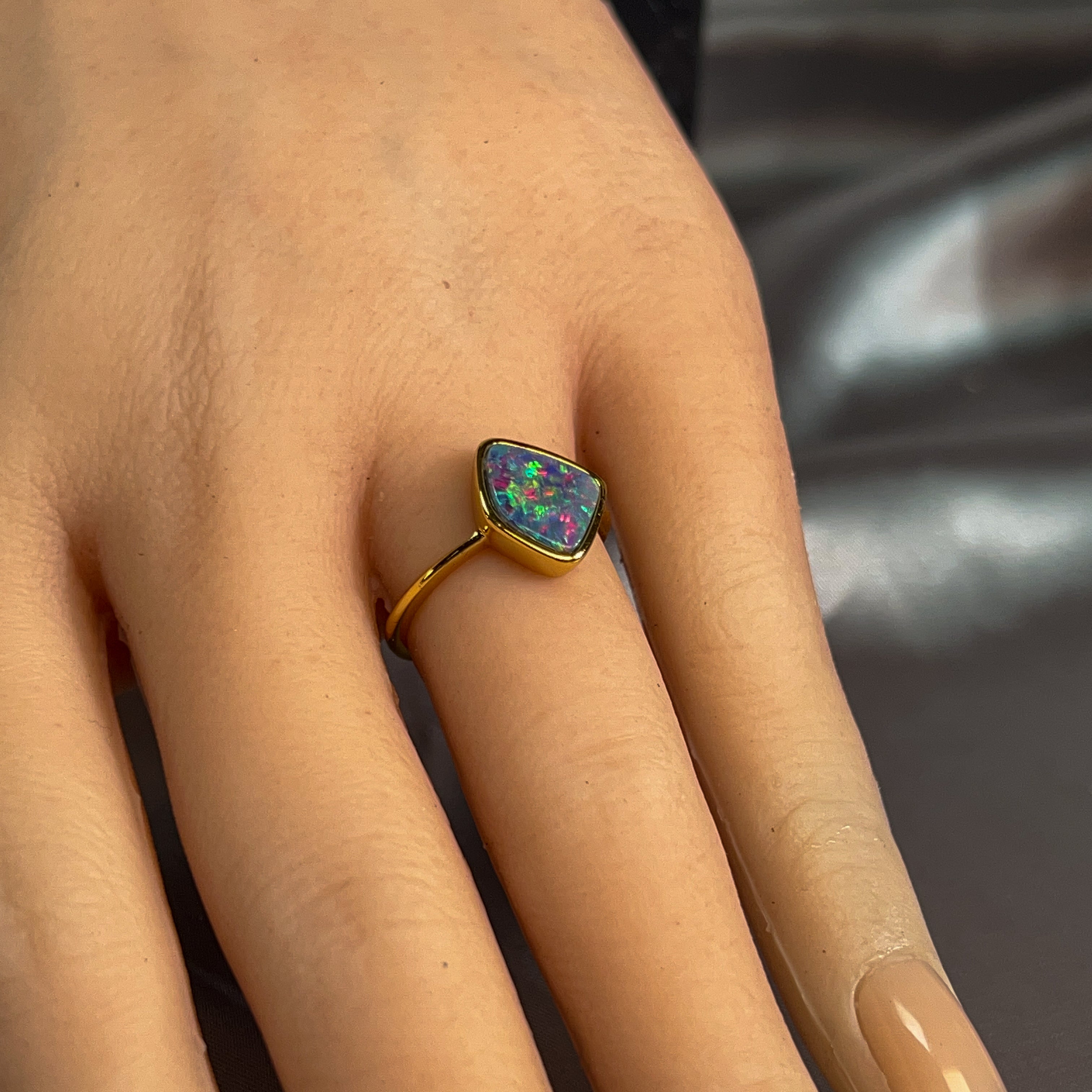 Elevate your everyday elegance with this stunning solitaire ring, featuring a radiant 12x11mm opal doublet set in lustrous gold-plated silver. The play-of-colour opal catches the light beautifully, creating a mesmerising display that draws admiration. Perfect for those seeking timeless sophistication without compromise, this piece combines the warmth of gold plating with the durability of silver, making it an ideal choice for daily wear or special occasions. A true showstopper that lets your opal take centre stage.