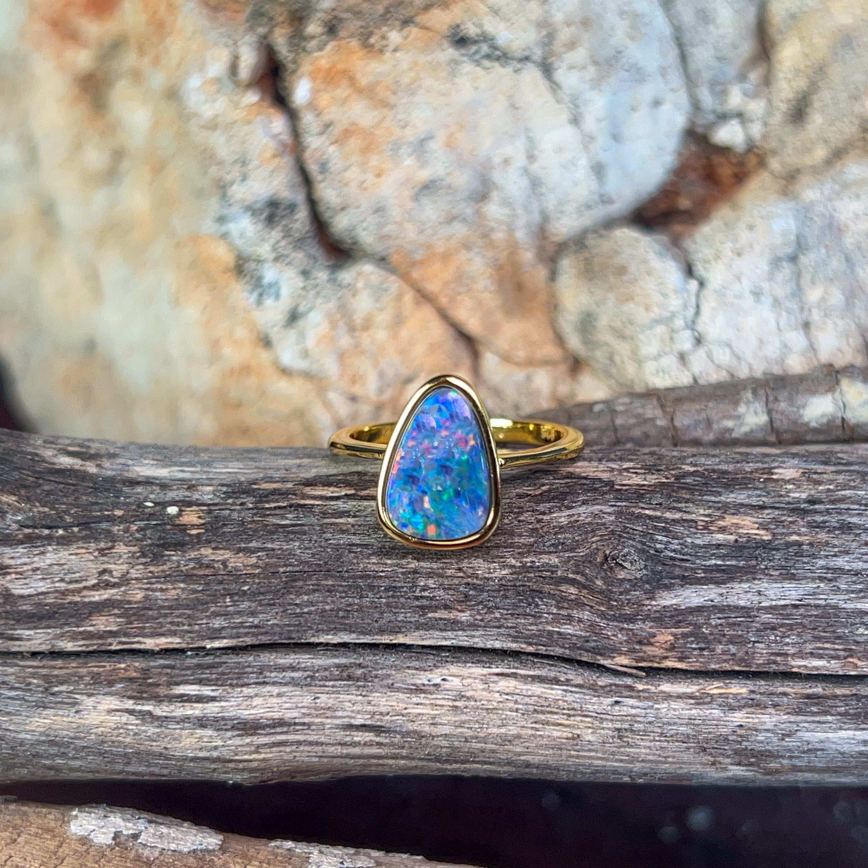 Elevate your everyday elegance with this stunning opal doublet ring, where timeless sophistication meets modern design. Featuring a captivating 12x9mm opal stone layered with precious metals, this piece showcases the mesmerising play of colour that makes opals truly unforgettable. The gold plating over silver creates a luxurious finish that complements any skin tone, while the doublet construction ensures durability and lasting brilliance. Perfect for those who appreciate fine jewellery with genuine character, this ring makes an exceptional statement piece or a meaningful gift for someone special.