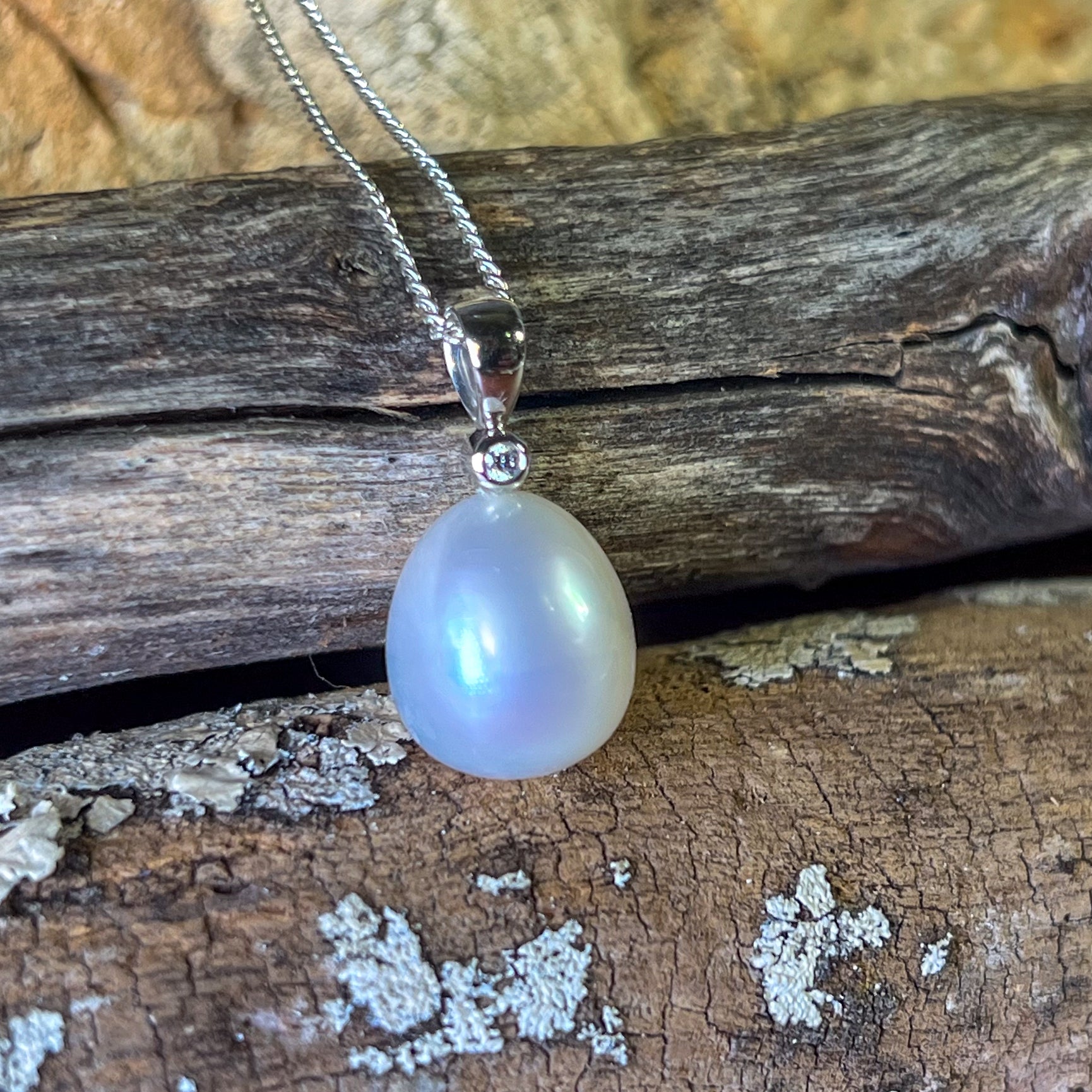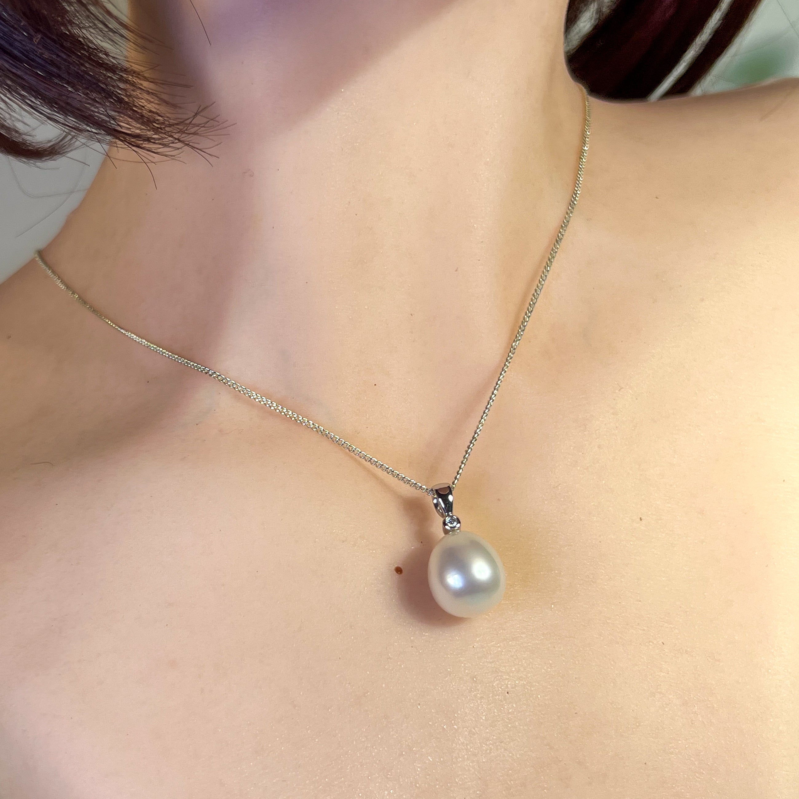 Sparkle and shine with this 18kt white gold pendant featuring a stunning 12.5mm South Sea pearl. The large, off round oval shape adds a unique touch, while the dazzling diamonds add a touch of luxury. Elevate any outfit with this elegant piece.