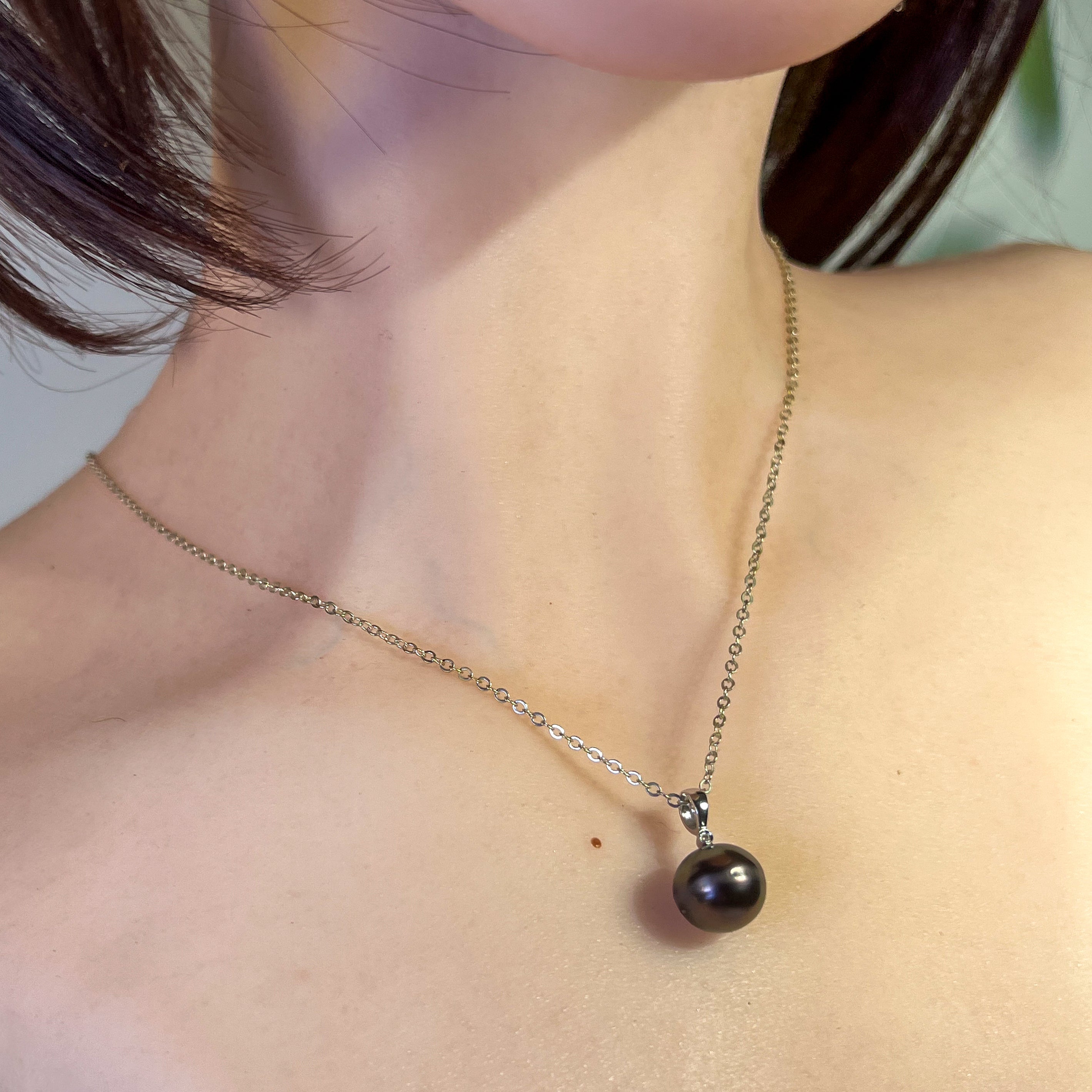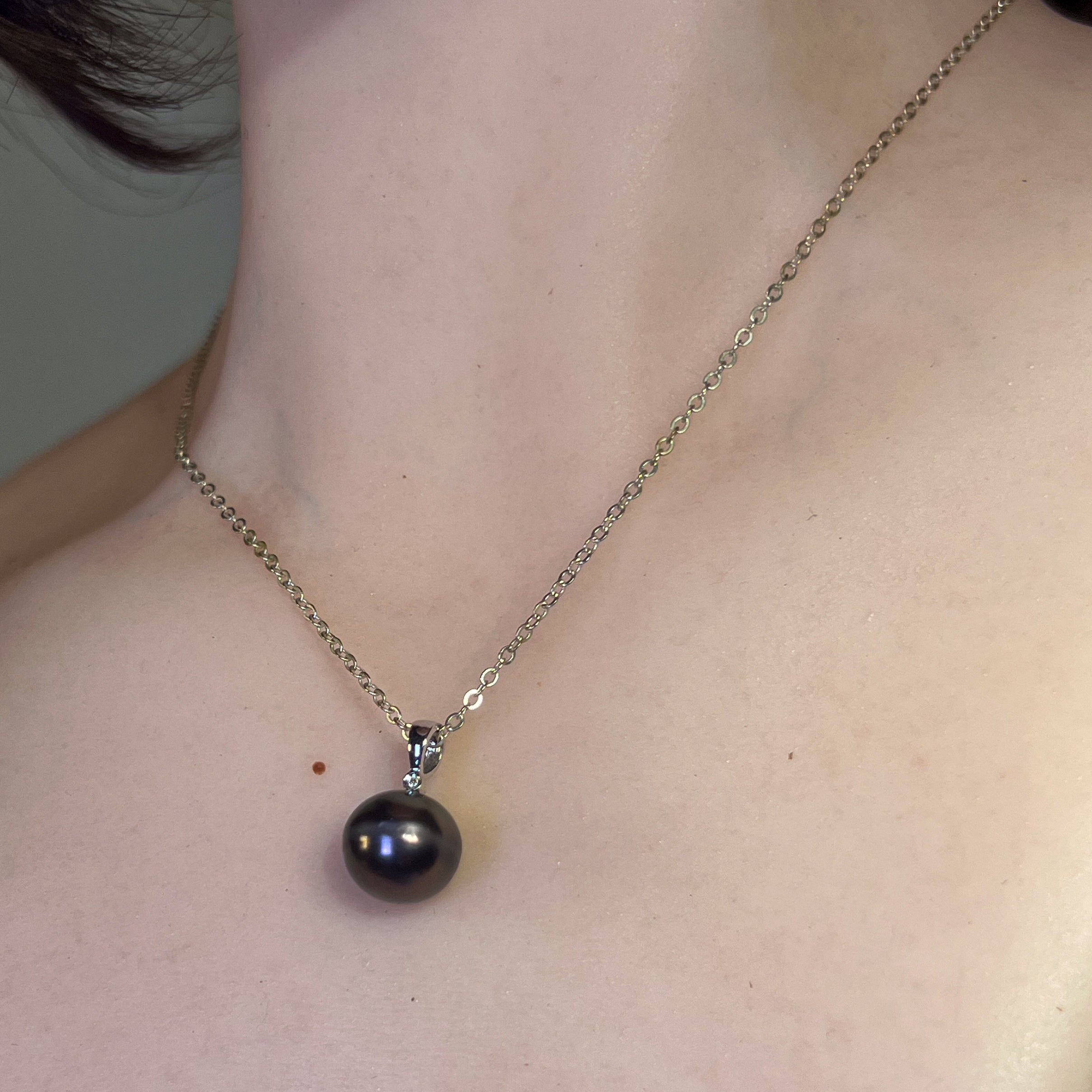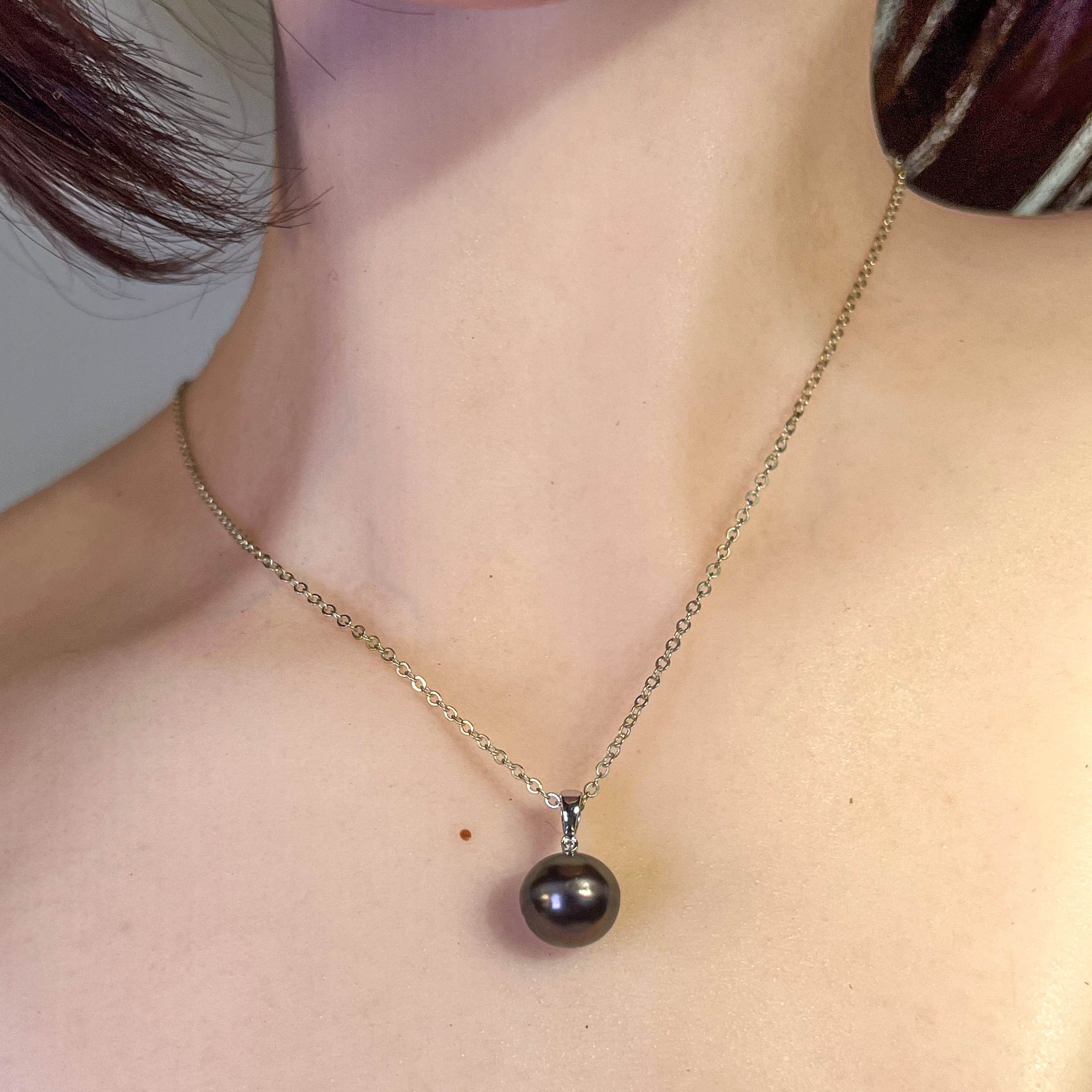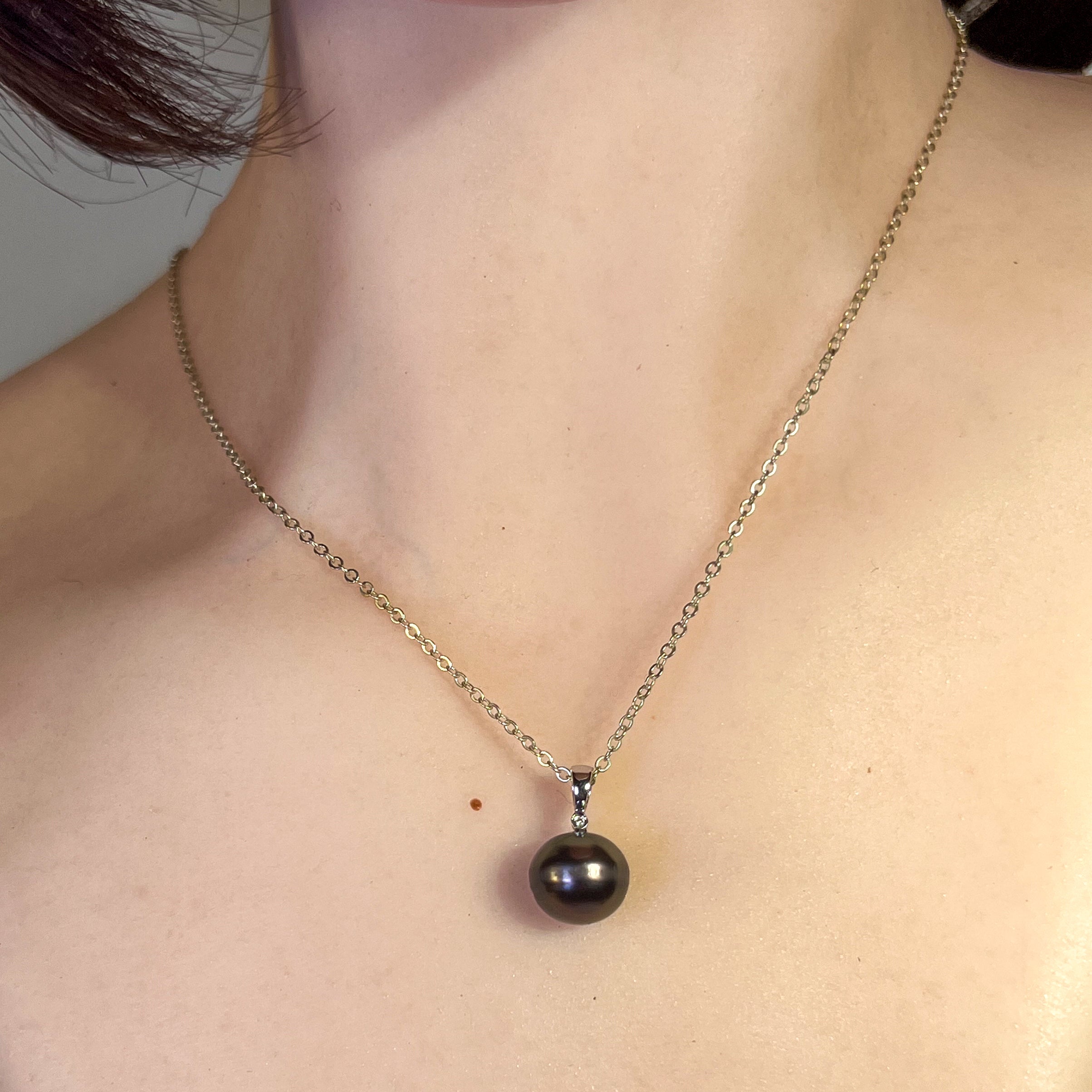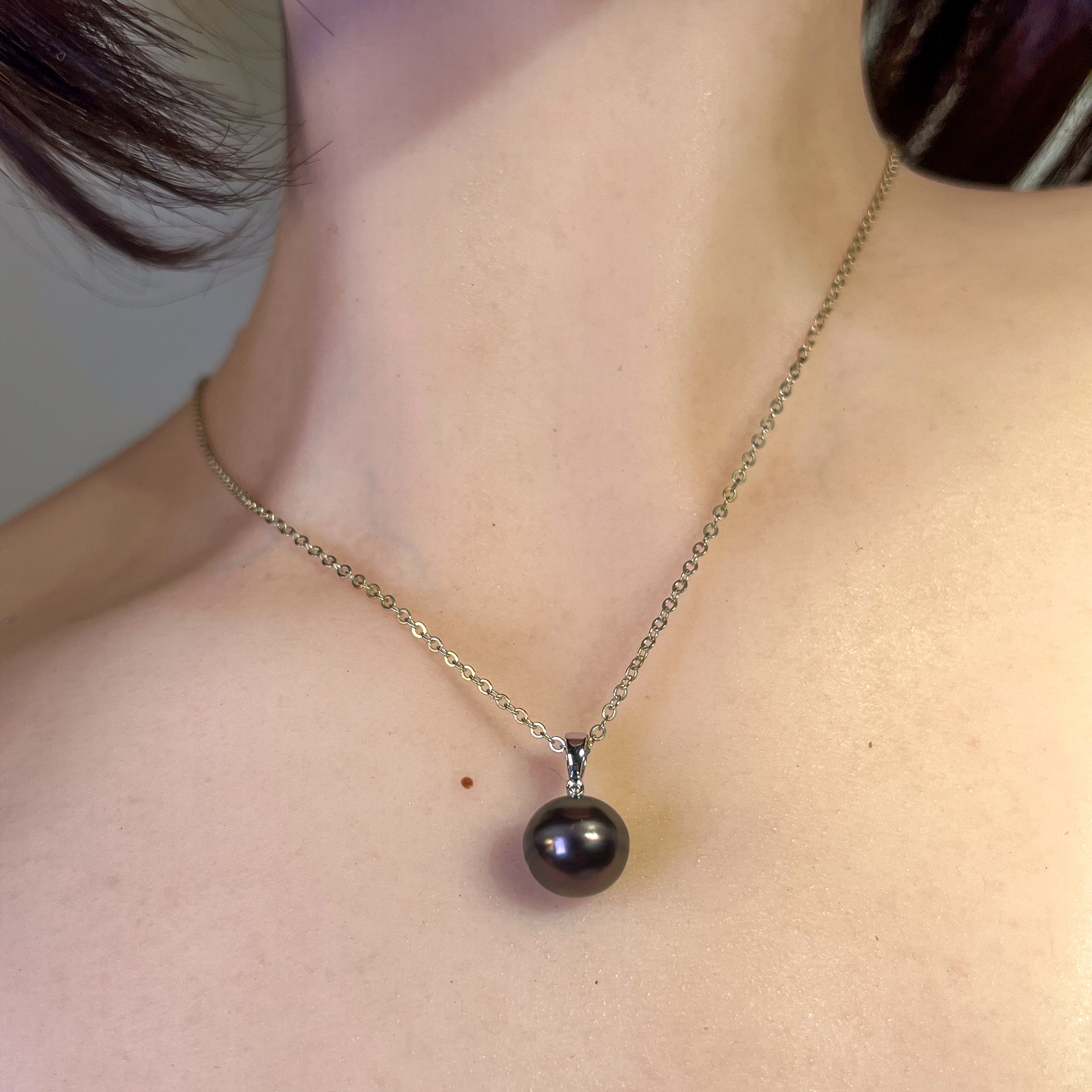 Embrace timeless elegance with our 18kt White Gold Tahitian Black Pearl 11-11.5mm and diamond pendant. The classic simplicity of this pendant exudes sophistication and style, making it the perfect accessory for any occasion. Elevate your look with the natural beauty and effortless luxury of this stunning piece.