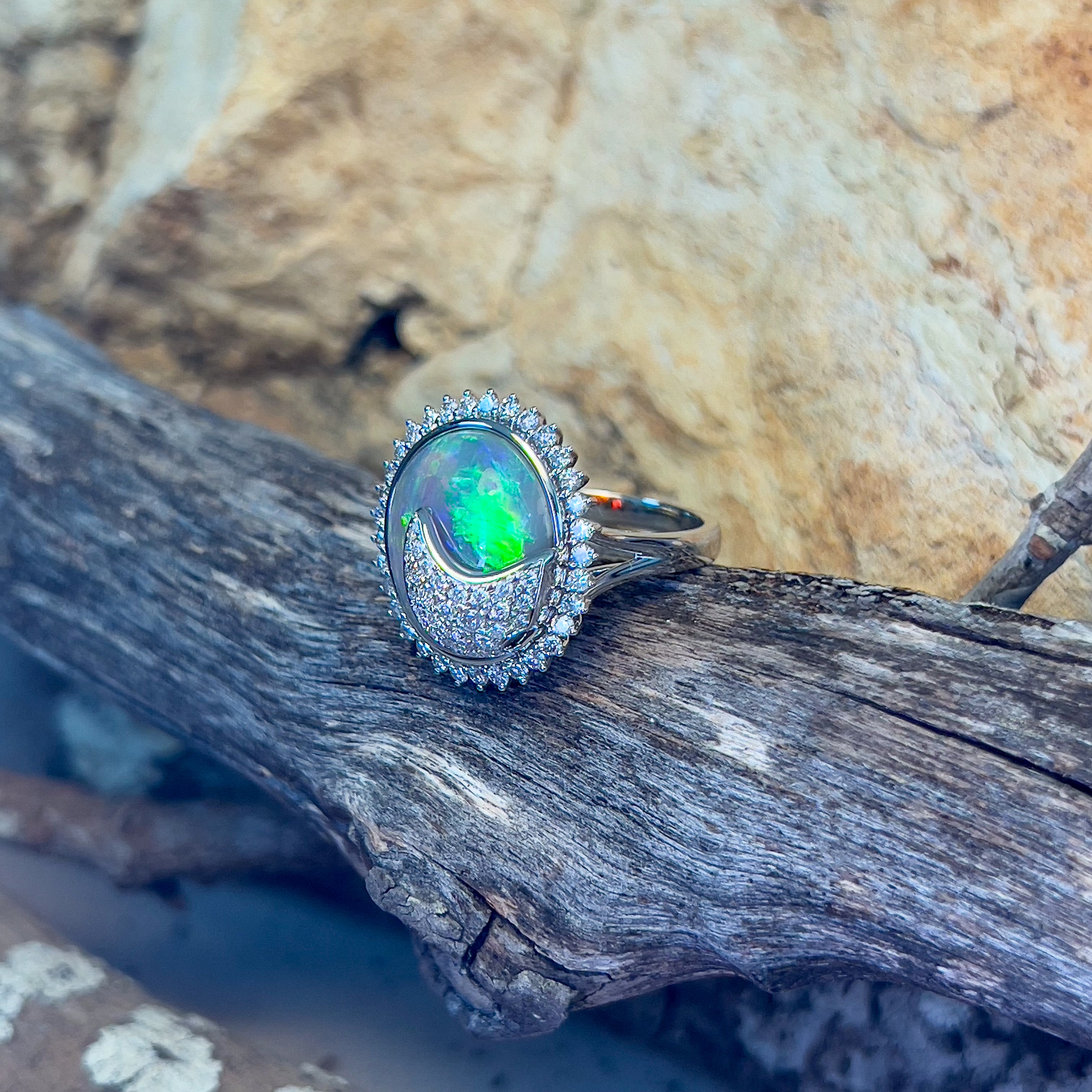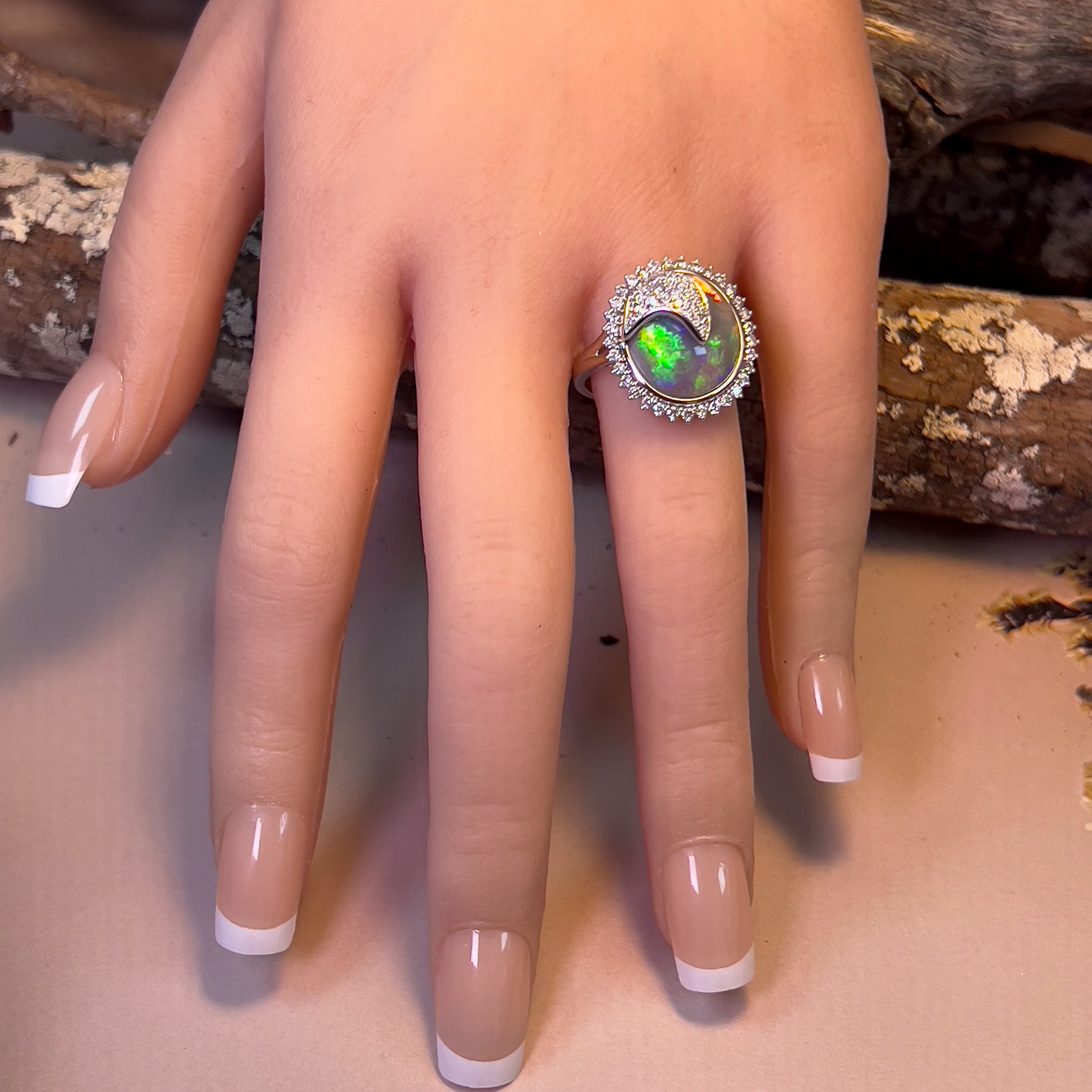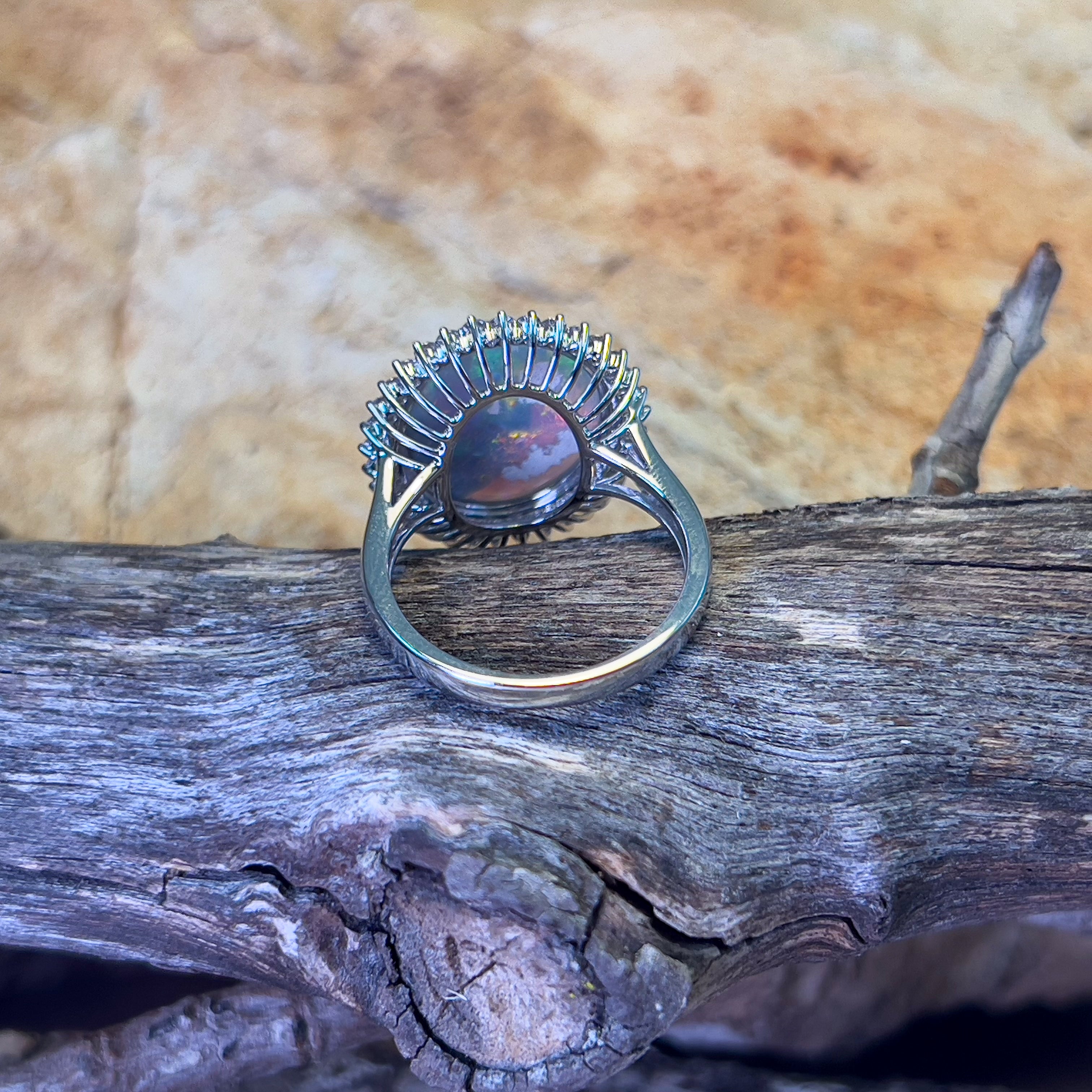 Indulge in timeless elegance with our 18kt White Gold cluster design Black Opal 4.94ct and Diamond ring. This luxurious black opal ring for women showcases a stunning 4.94ct black opal surrounded by sparkling diamonds, making it the perfect statement piece for any occasion. Elevate your style with this exquisite and exclusive ring.