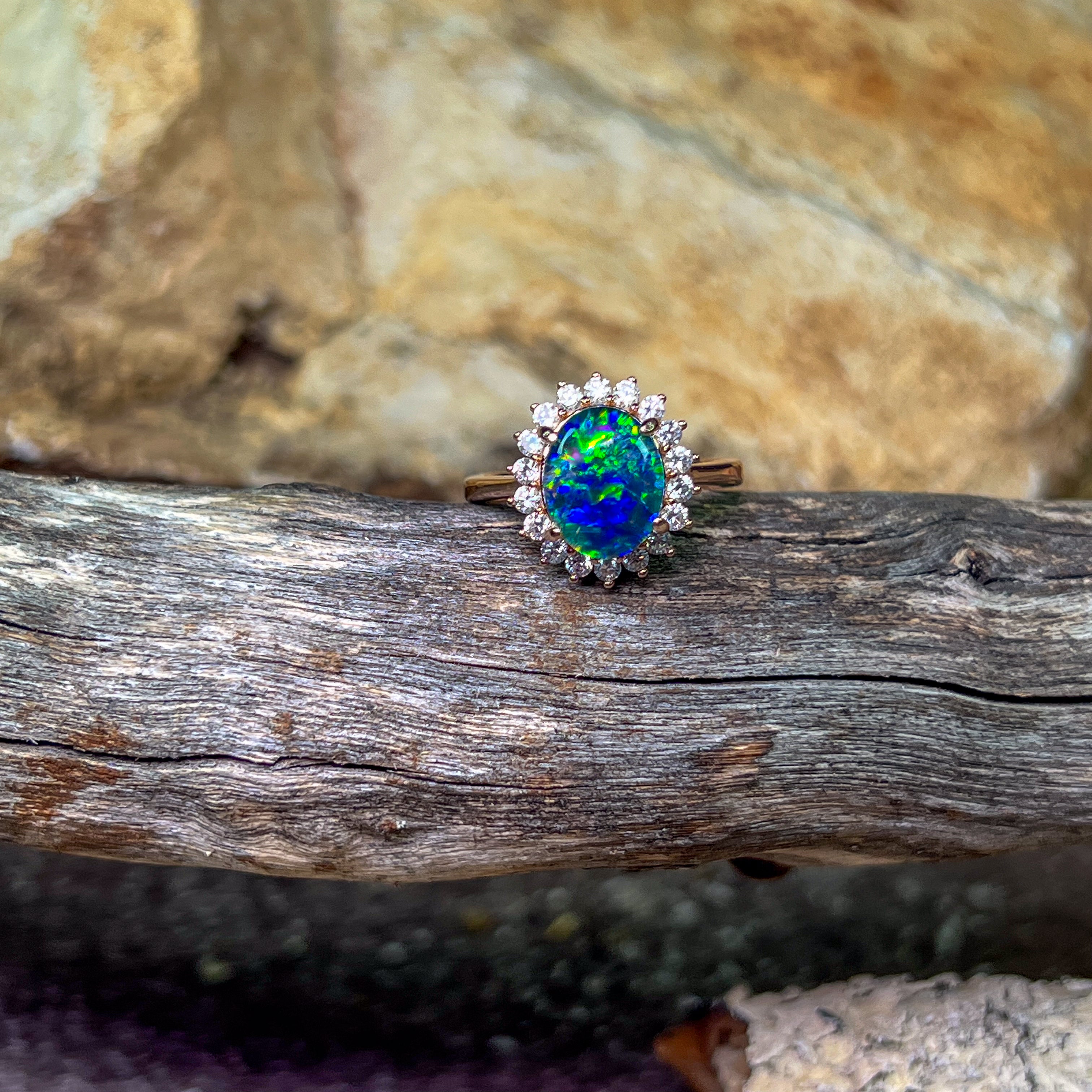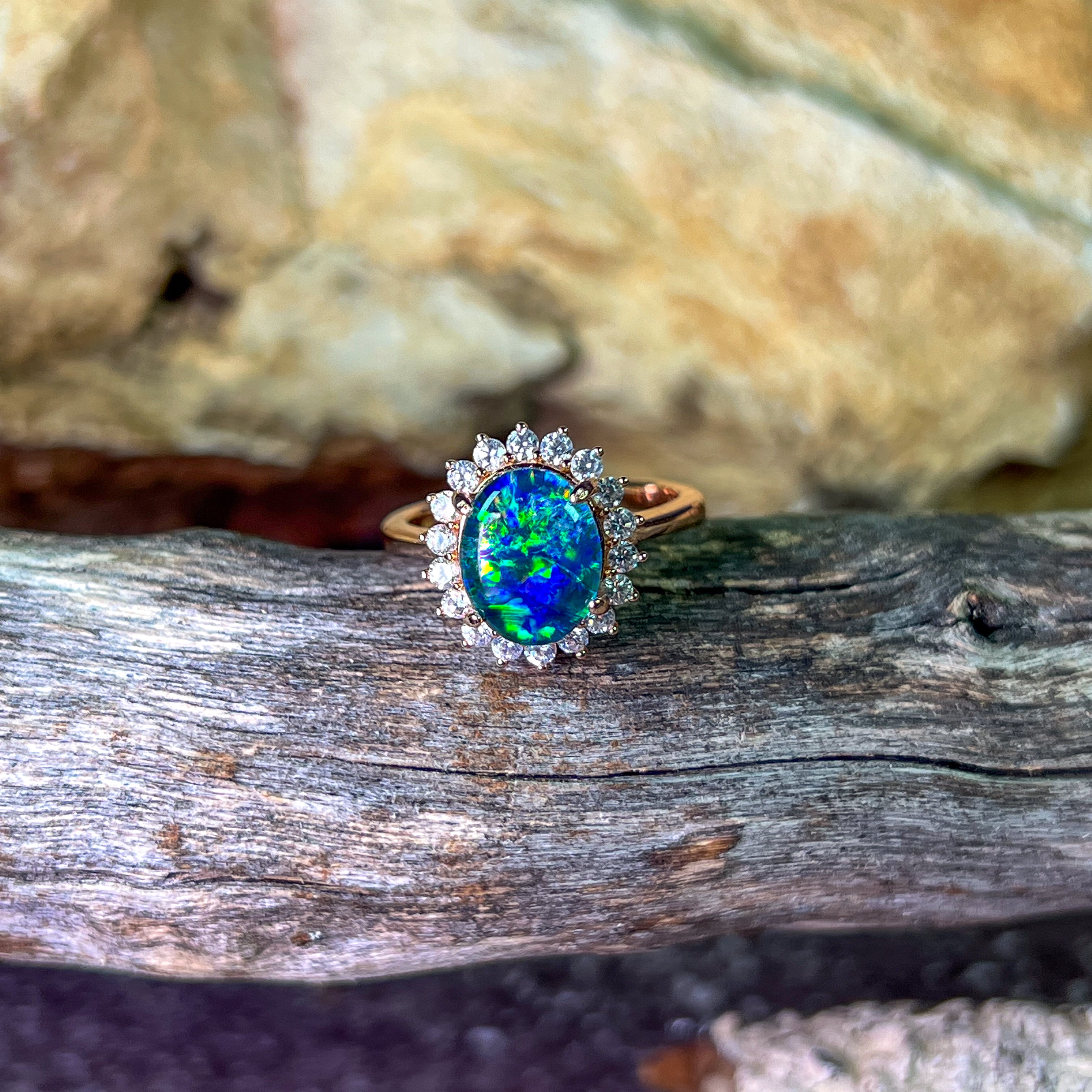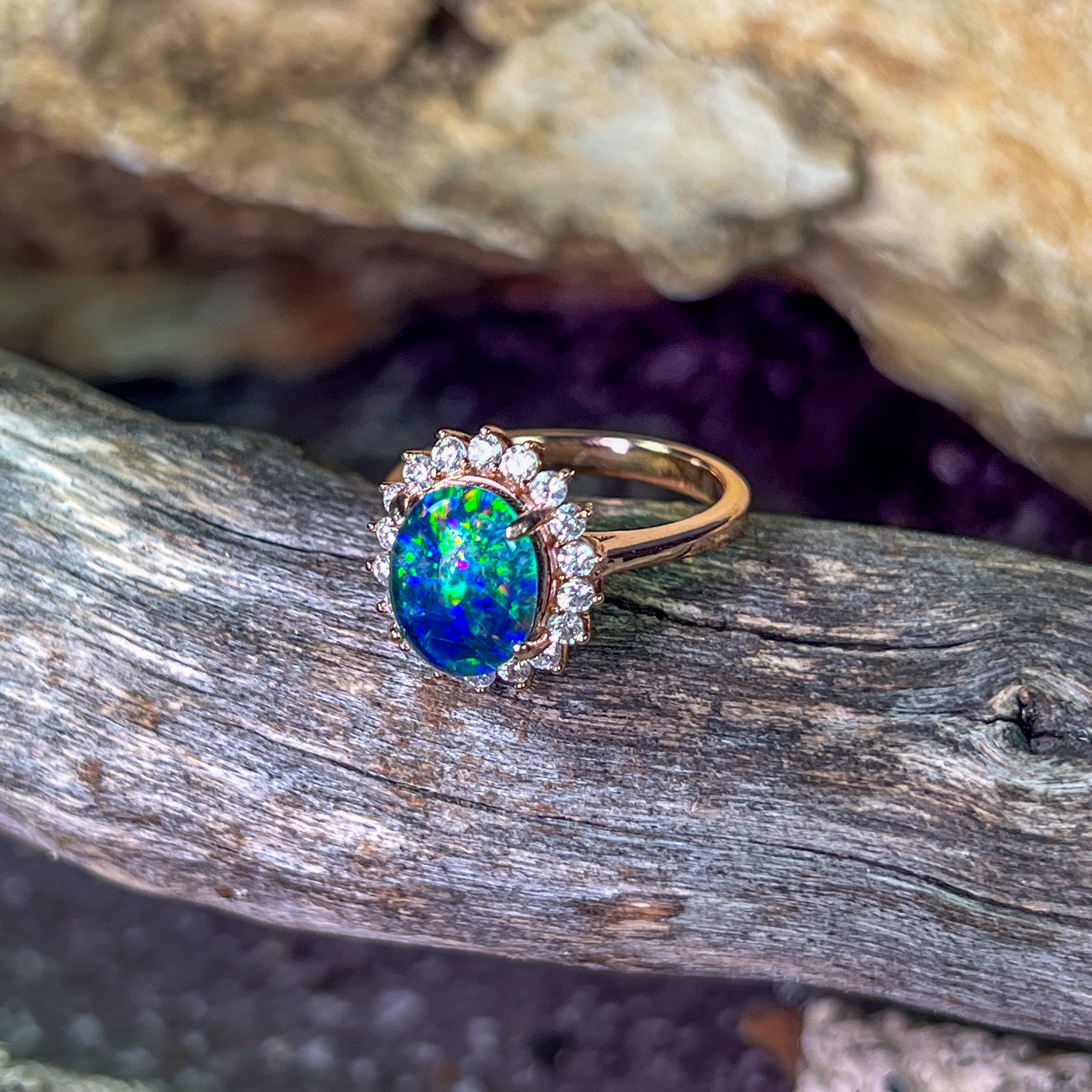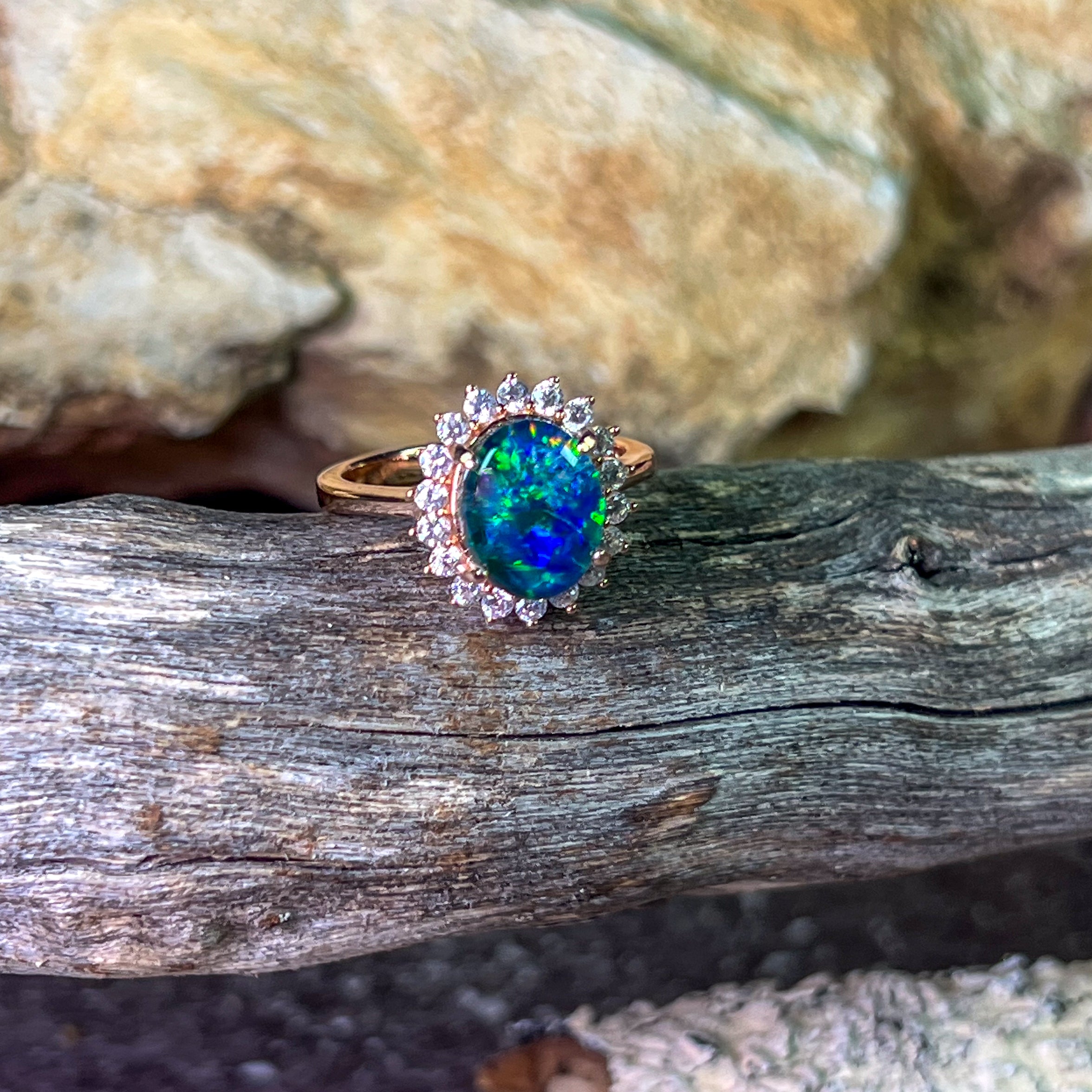 This exquisite One Rose gold plated Opal triplet 10x8mm cluster ring is perfect for engagements or special occasions. The opal stone adds a touch of elegance to the rose gold plated band. This stunning piece of opal jewelry will make a lasting impression and is sure to become a treasured addition to any jewelry collection.