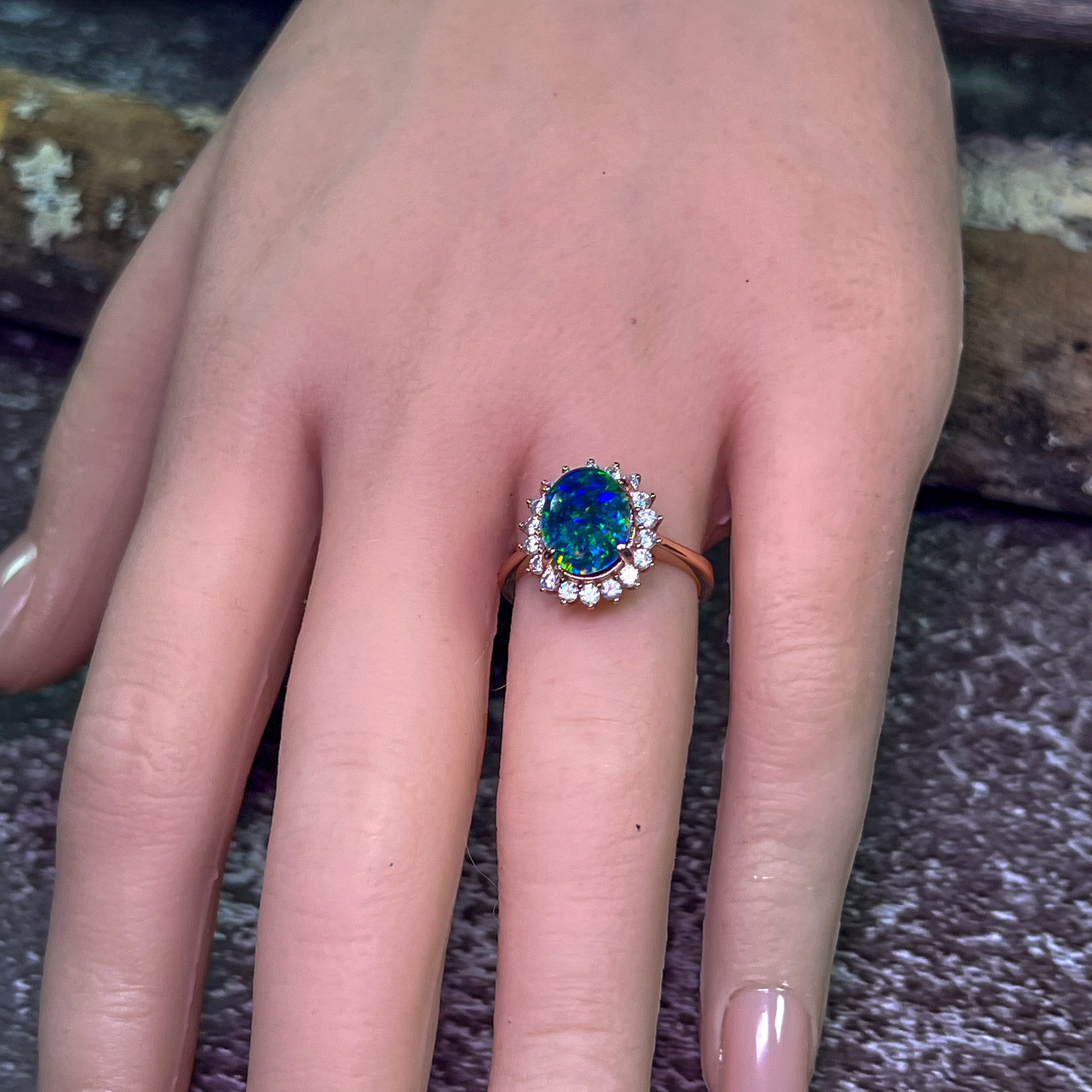 Rose gold plated Opal triplet 10x8mm cluster ring