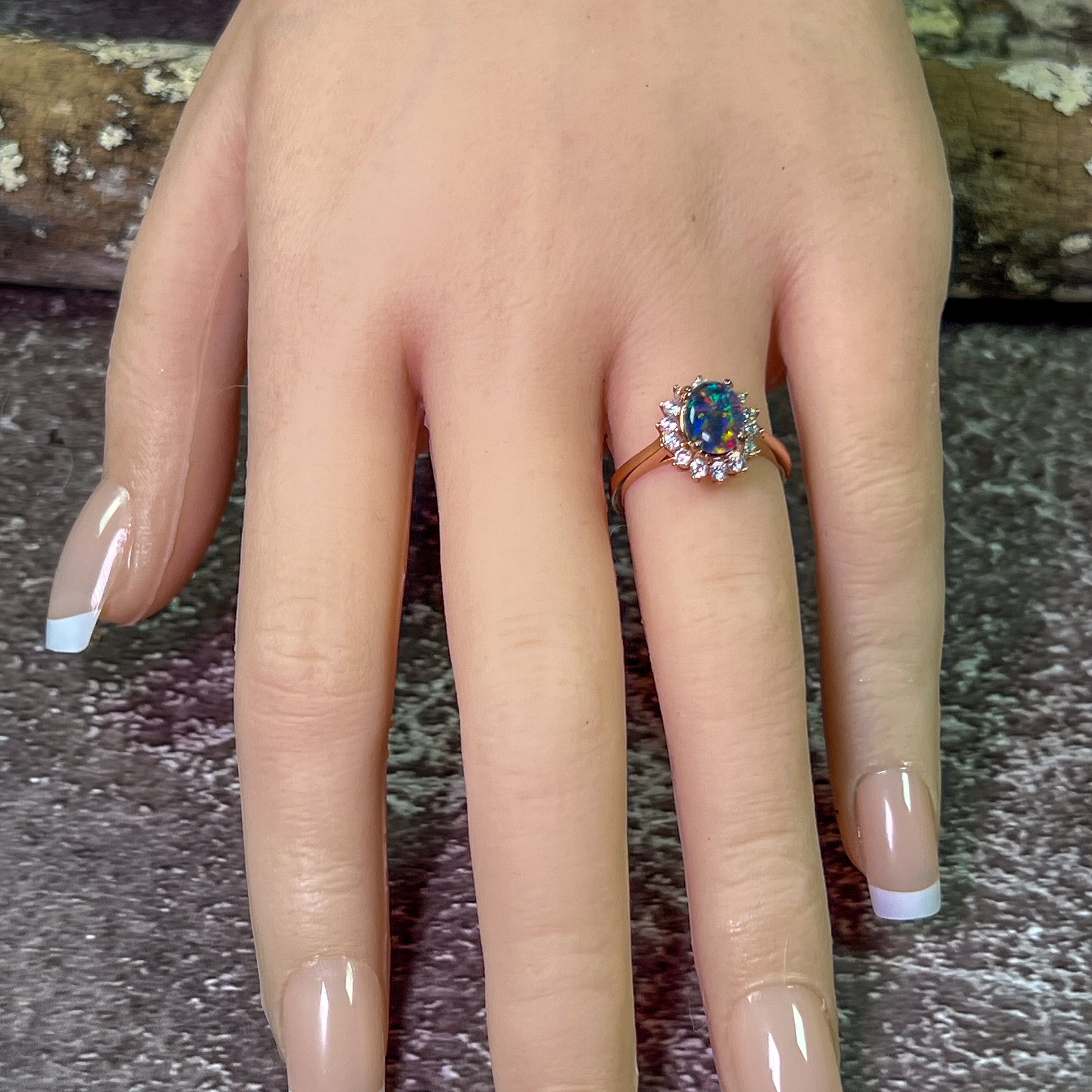 Indulge in luxury with our Rose Gold plated sterling silver 8x6mm cluster ring. Featuring a stunning gold opal birthstone, this ring exudes elegance and sophistication. Elevate any outfit with its unique and timeless design. Fall in love with the beauty and exclusivity of this piece.