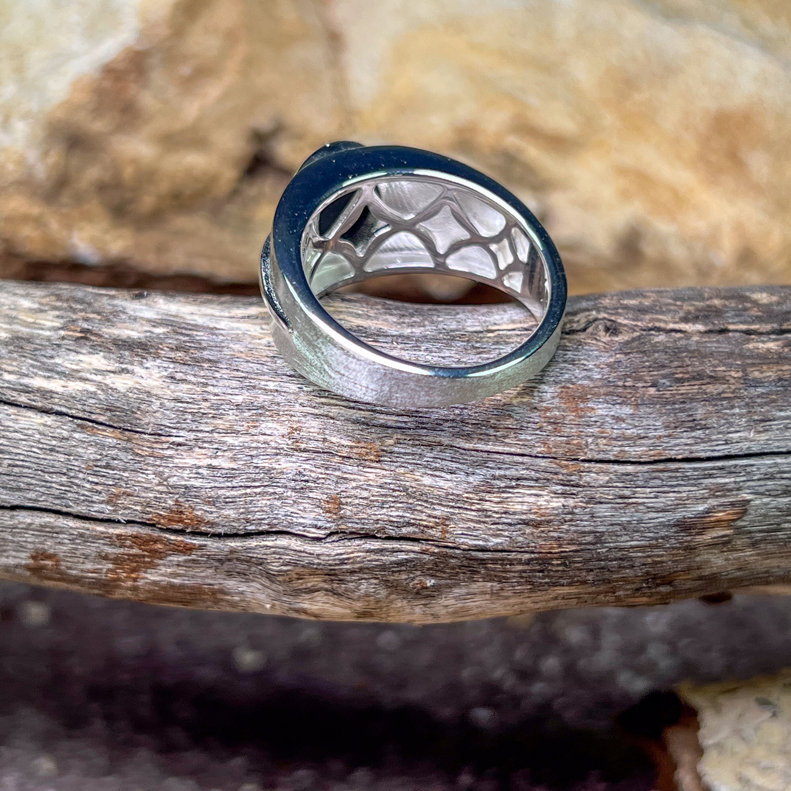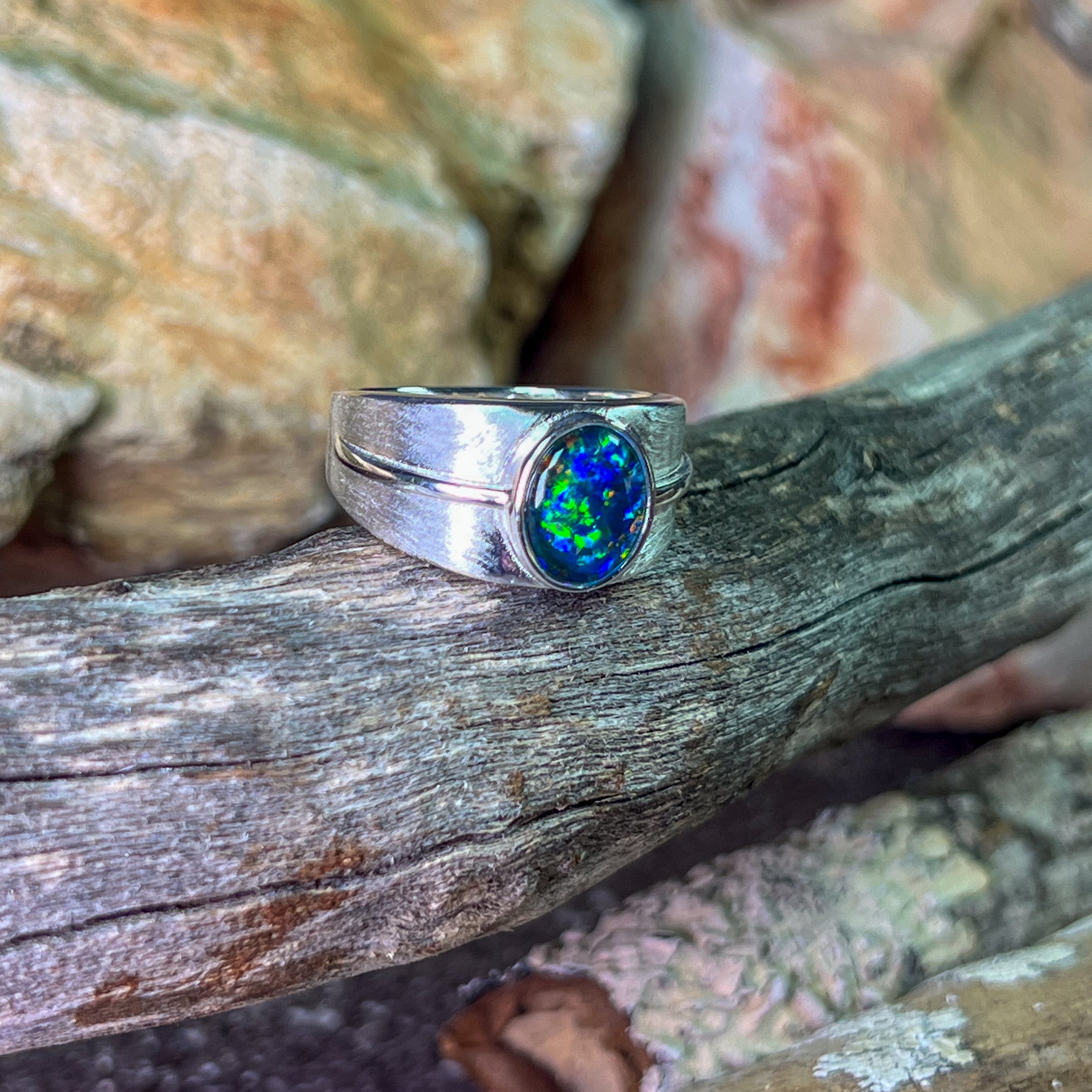 Upgrade your style with our Sterling Silver matte finish 10x8mm Opal triplet ring. This unique men's ring features a stunning opal triplet, adding a touch of sophistication to any outfit. Crafted with high-quality silver, this ring is the perfect addition to any jewelry collection.