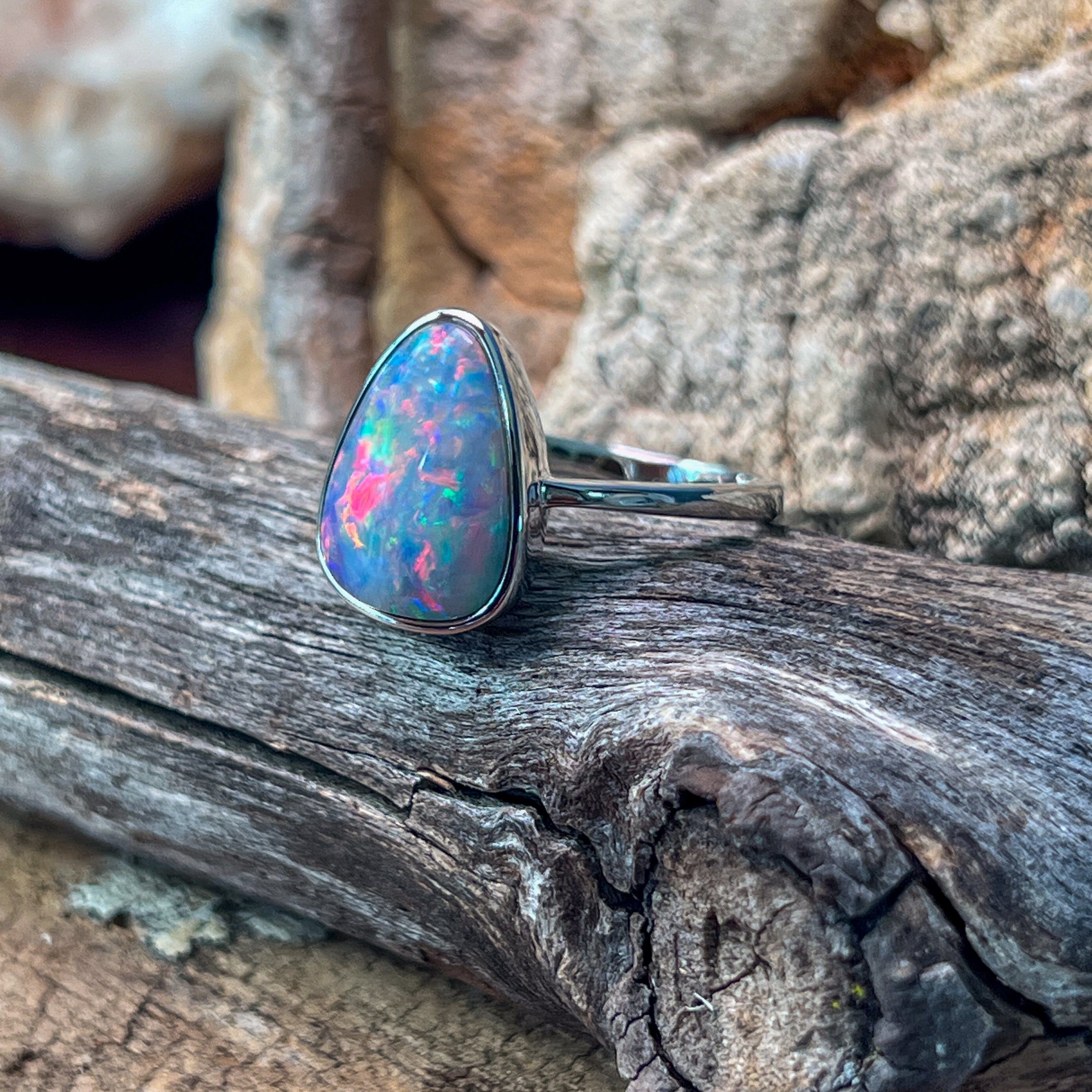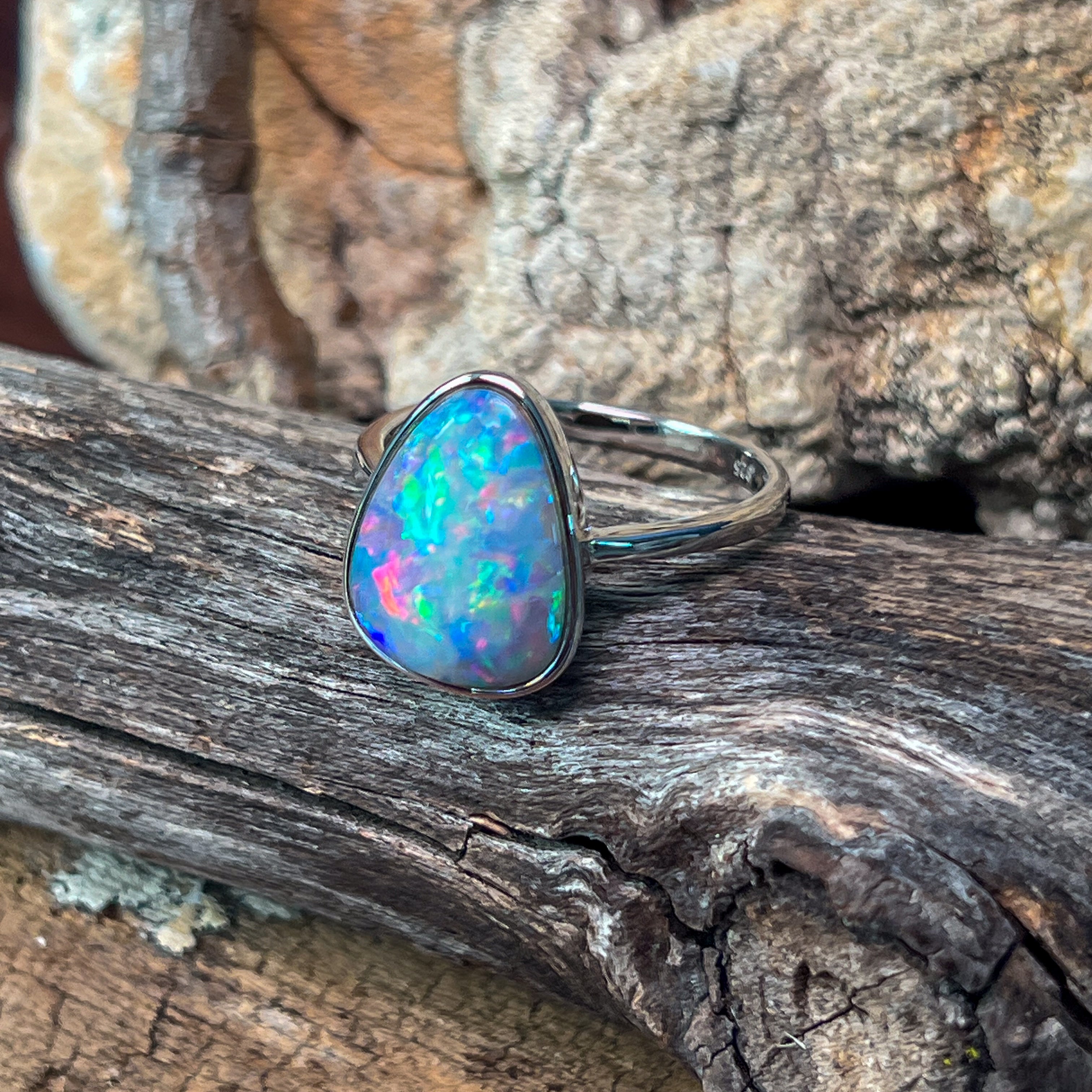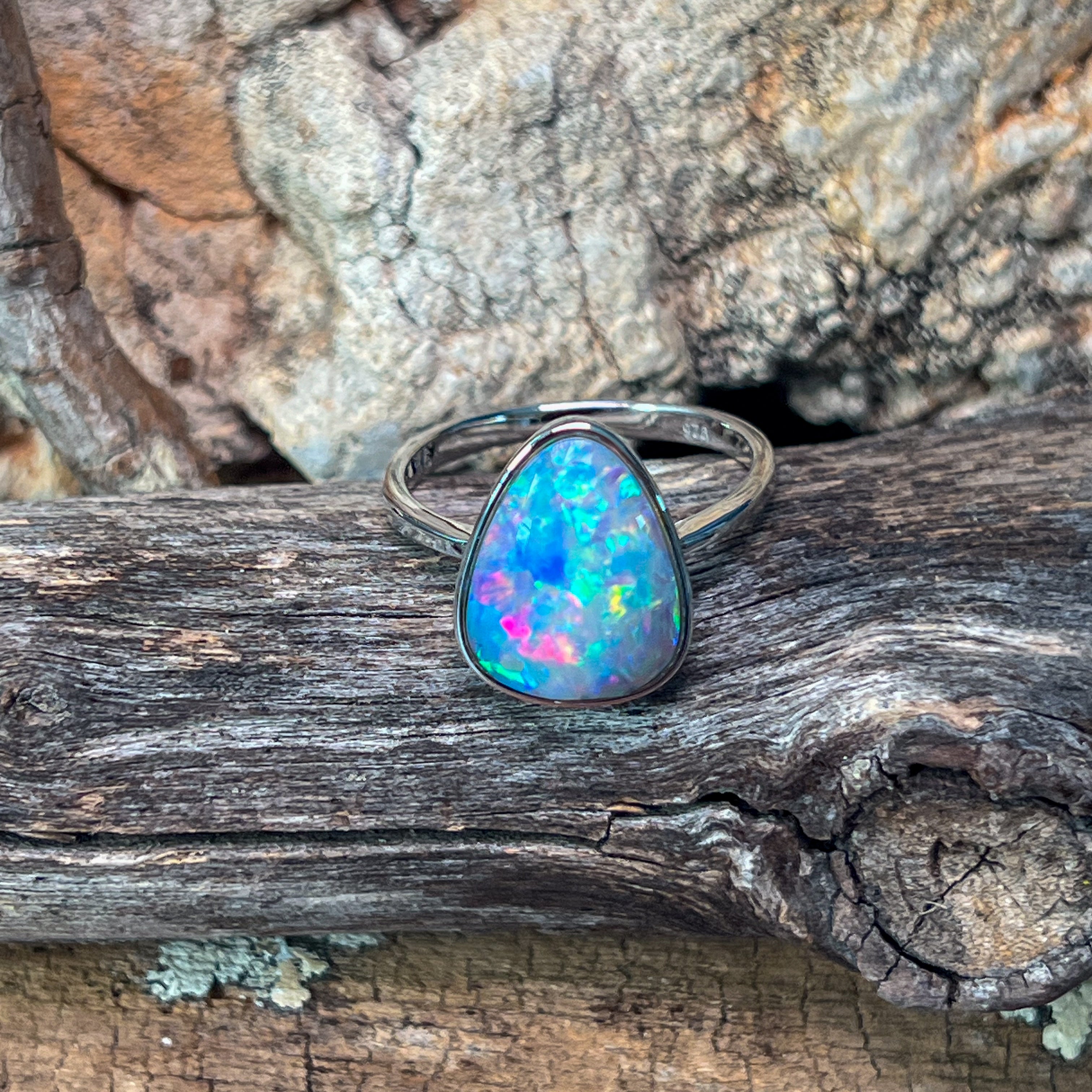 Sterling Silver bezel set Opal Doublet curved solitaire triangle shape ring