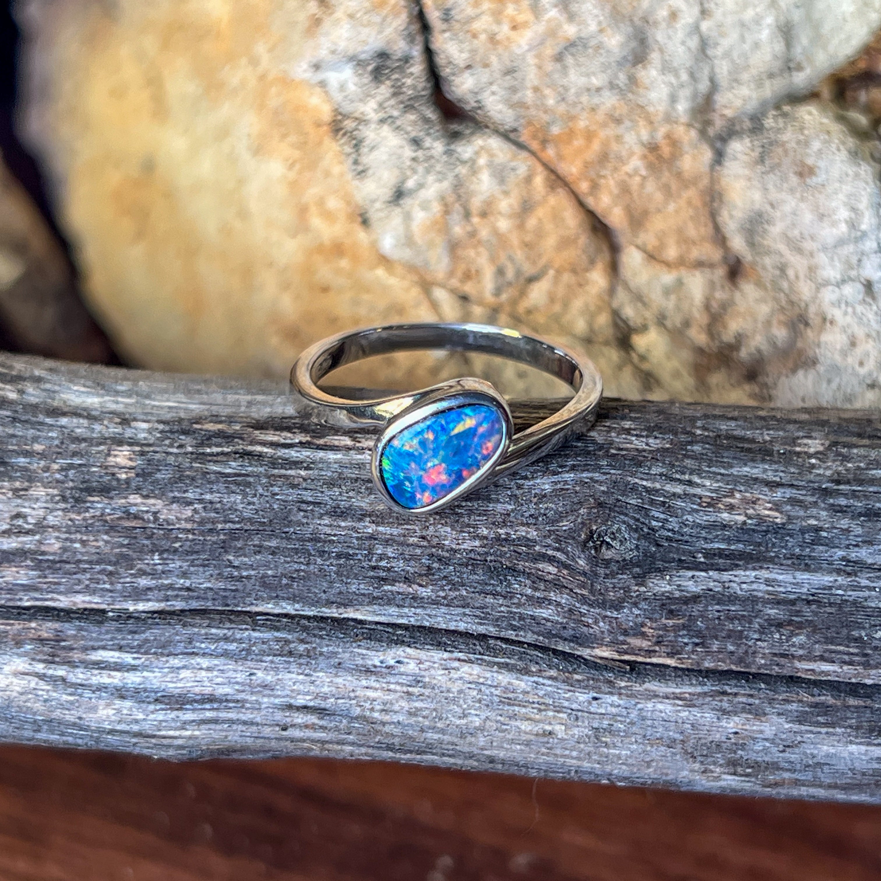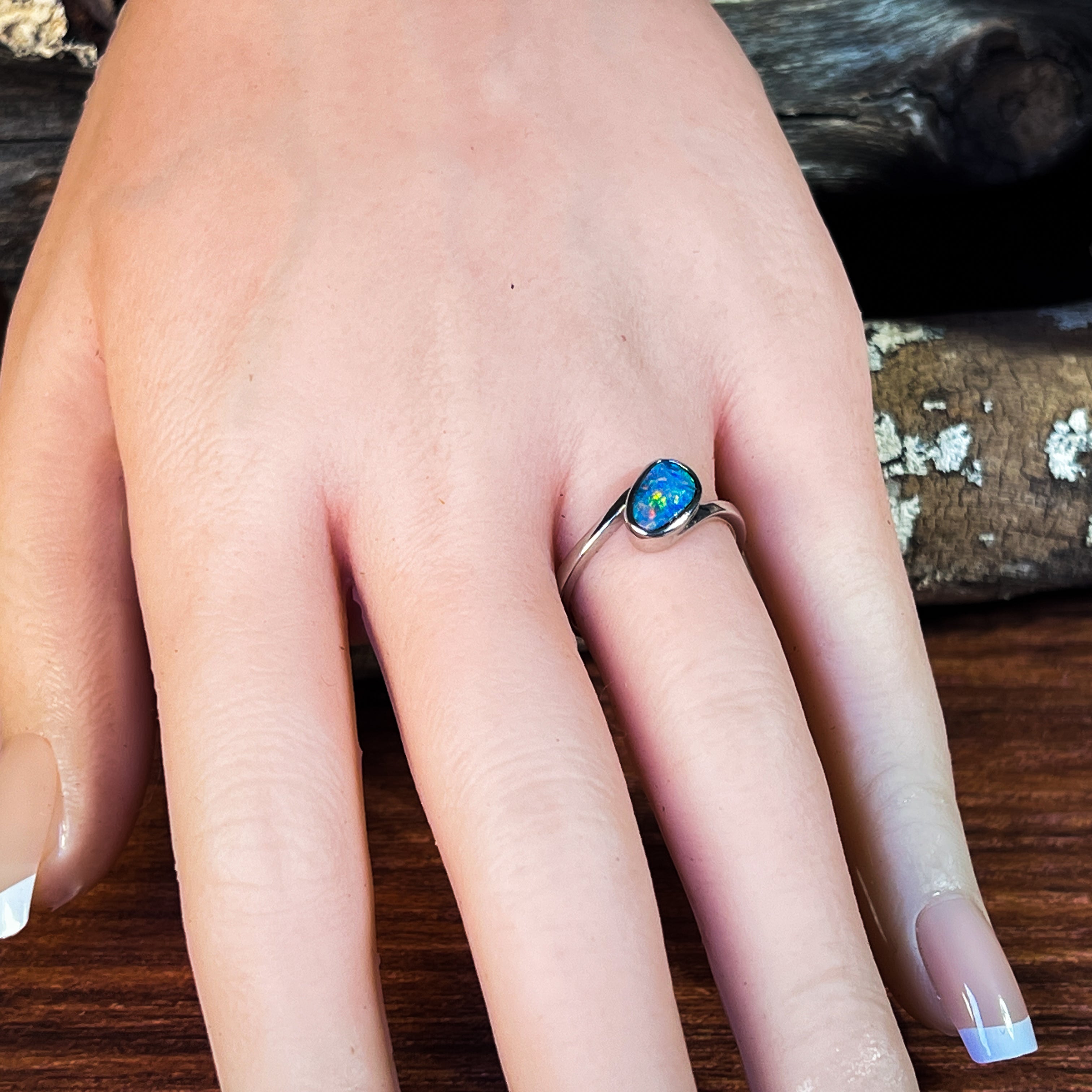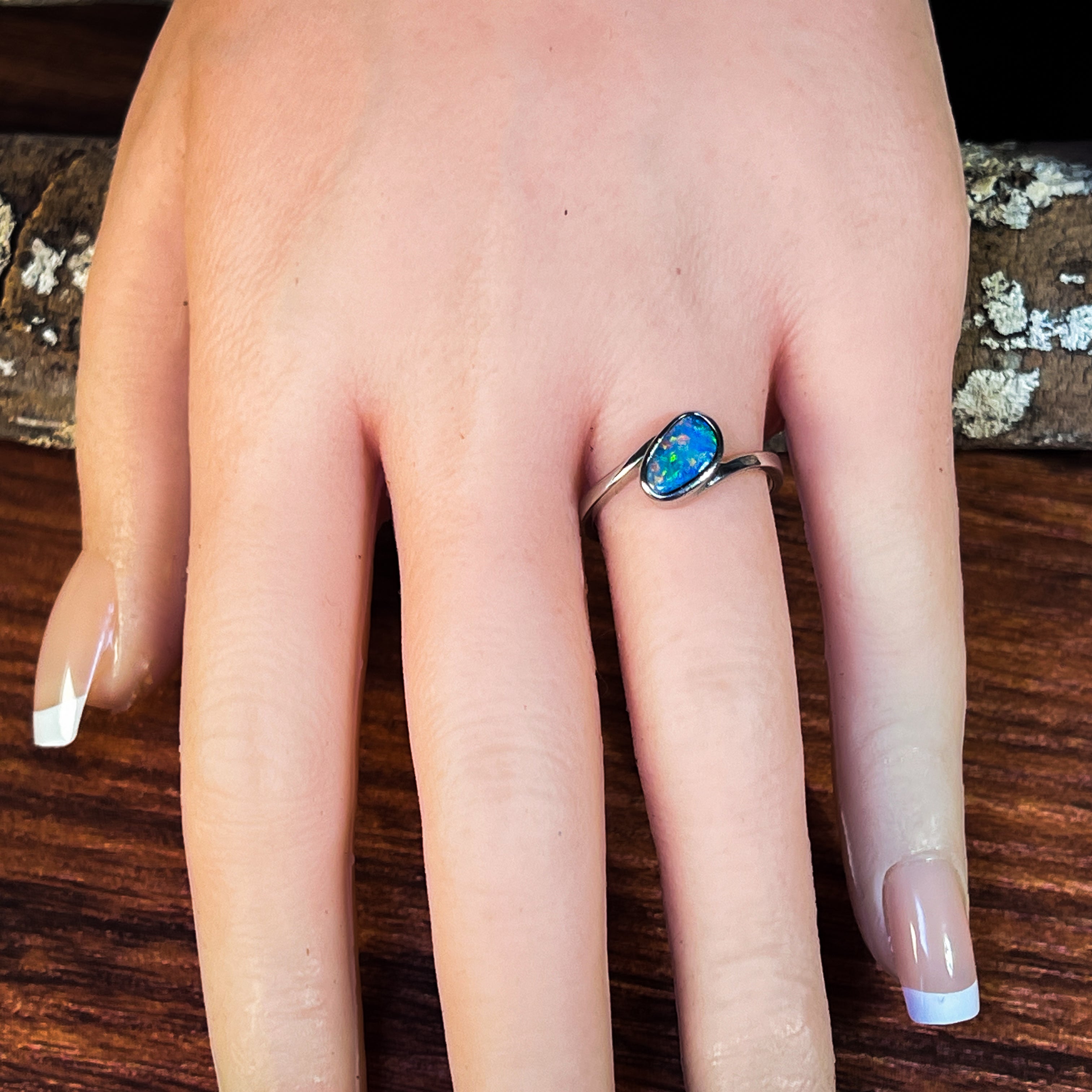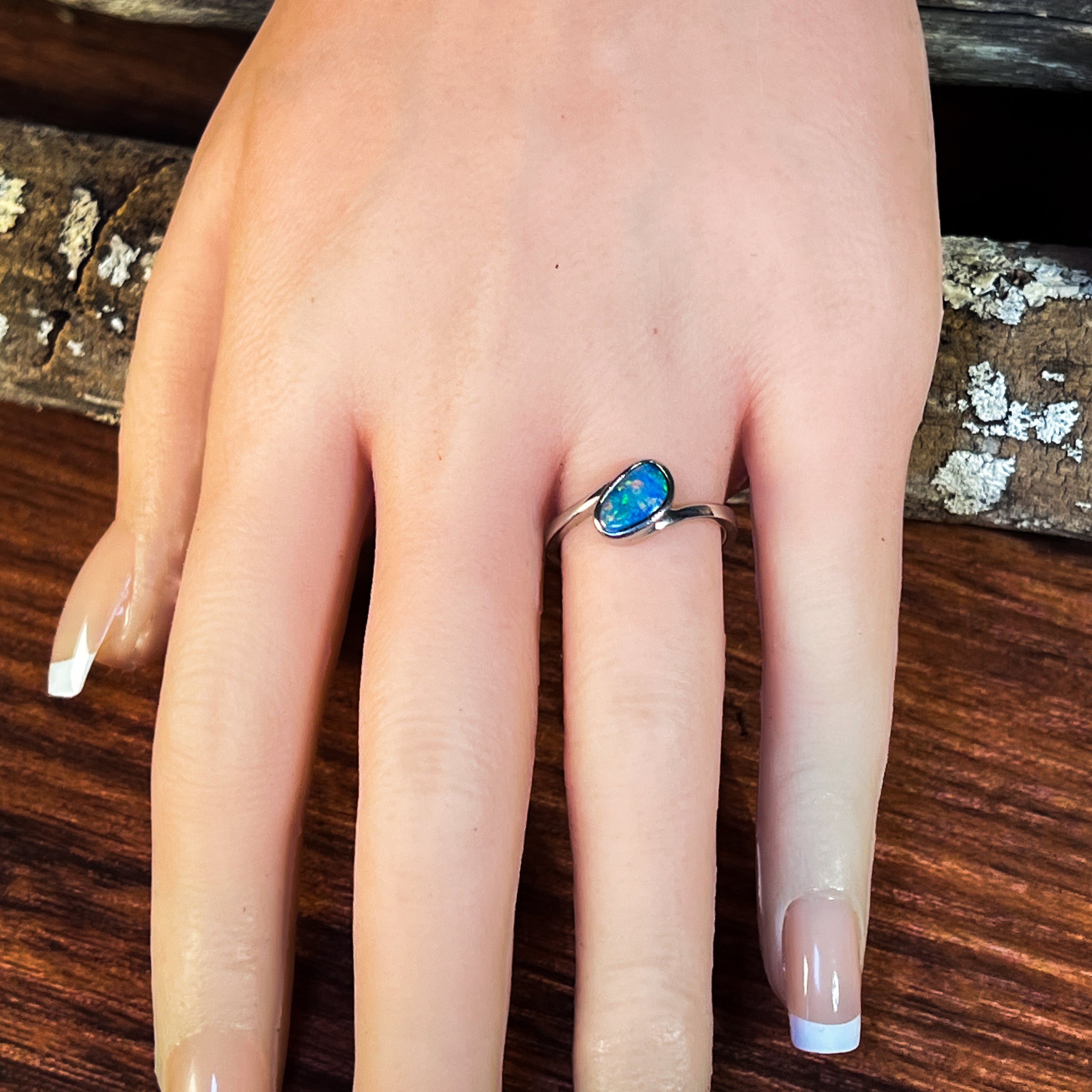 Experience the stunning beauty and versatility of our Sterling Silver cross over Opal doublet ring. Featuring a multi-color design, this ring will add a touch of elegance to any outfit. Embrace the unique and vibrant colors of opal while making a bold fashion statement. Perfect for any occasion!