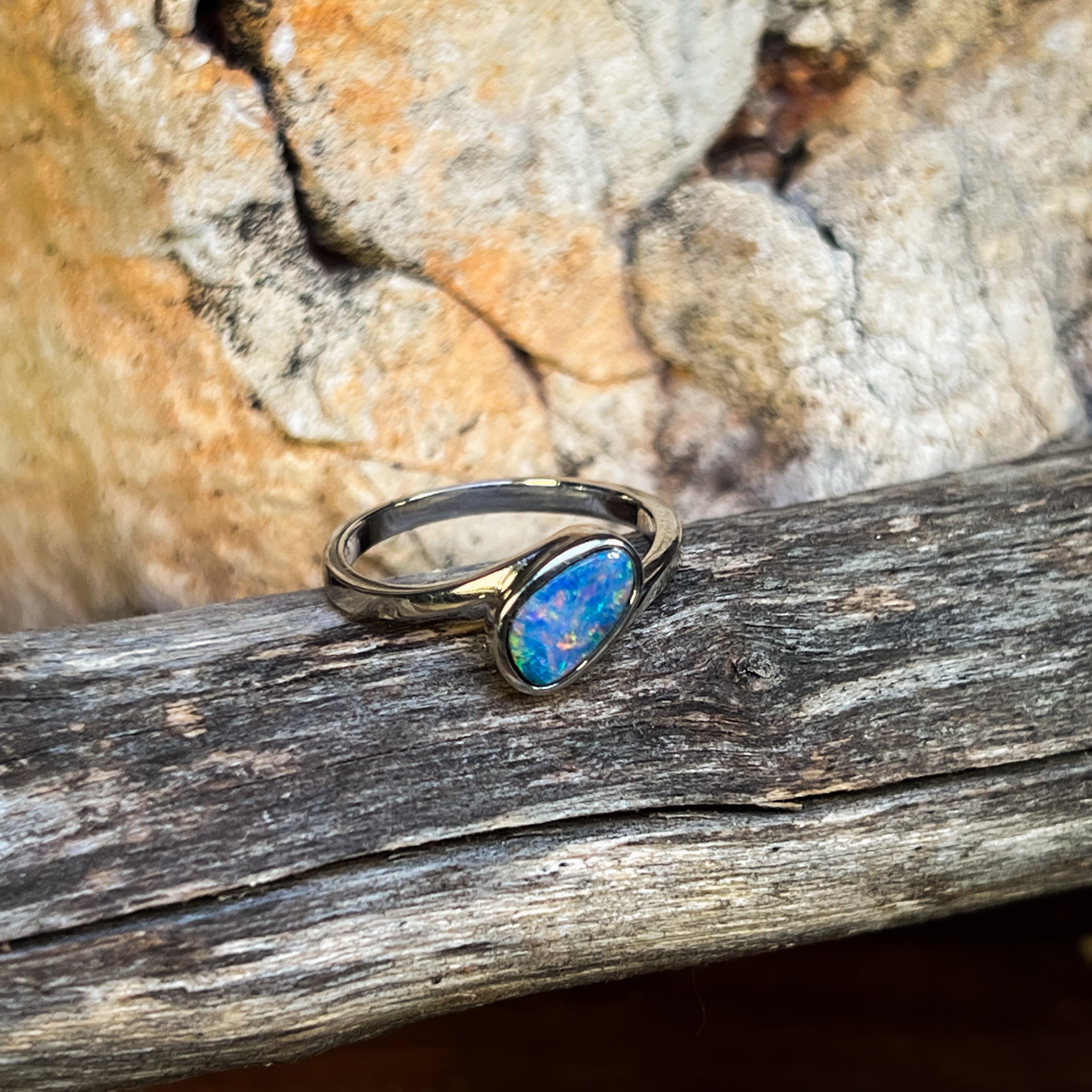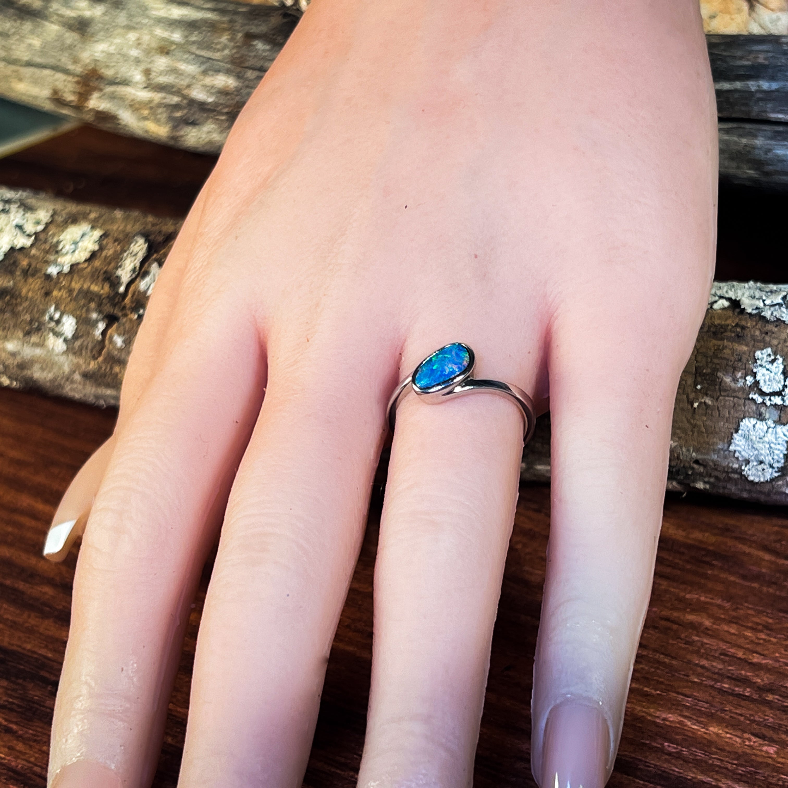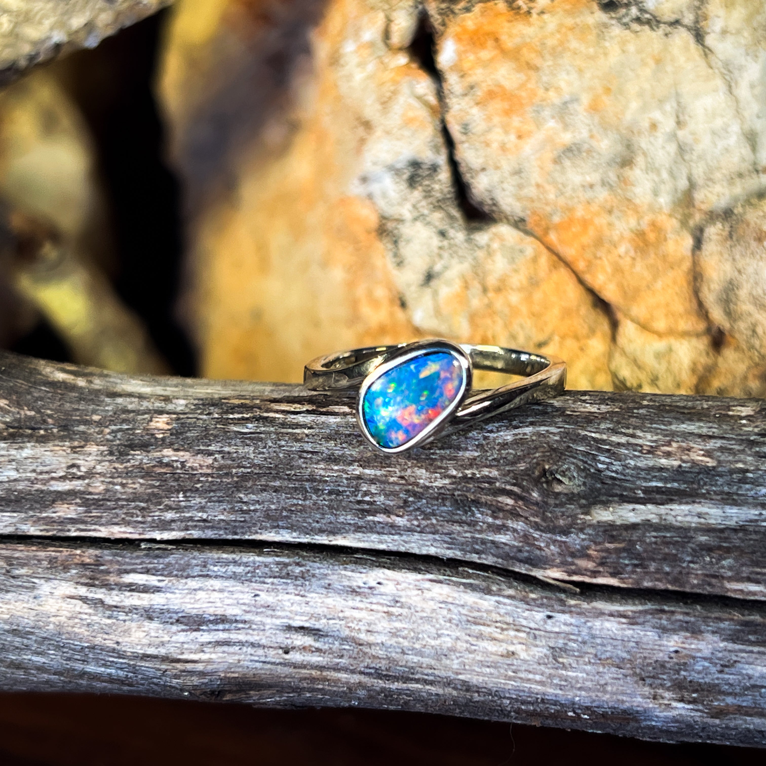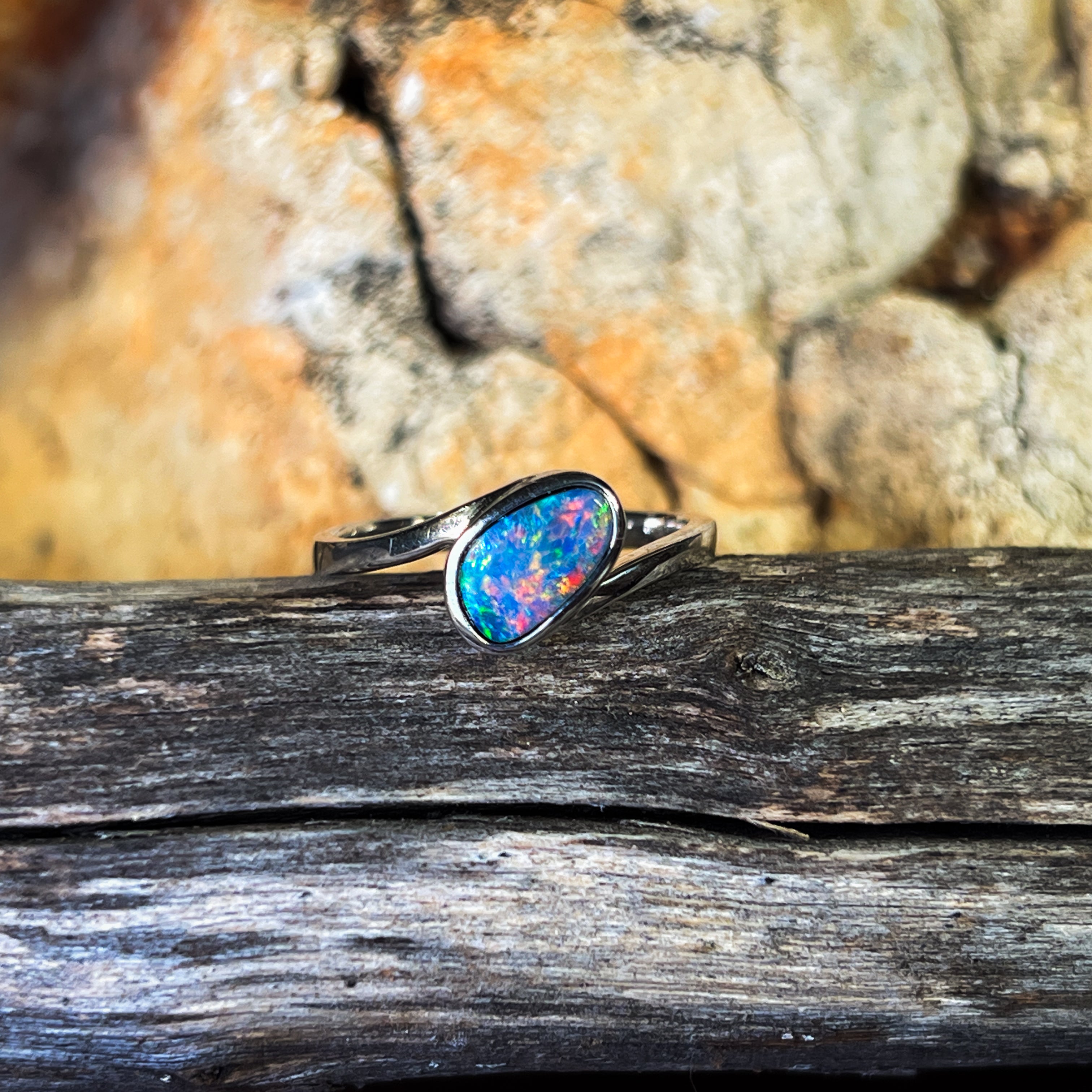 Experience the stunning beauty and versatility of our Sterling Silver cross over Opal doublet ring. Featuring a multi-color design, this ring will add a touch of elegance to any outfit. Embrace the unique and vibrant colors of opal while making a bold fashion statement. Perfect for any occasion!