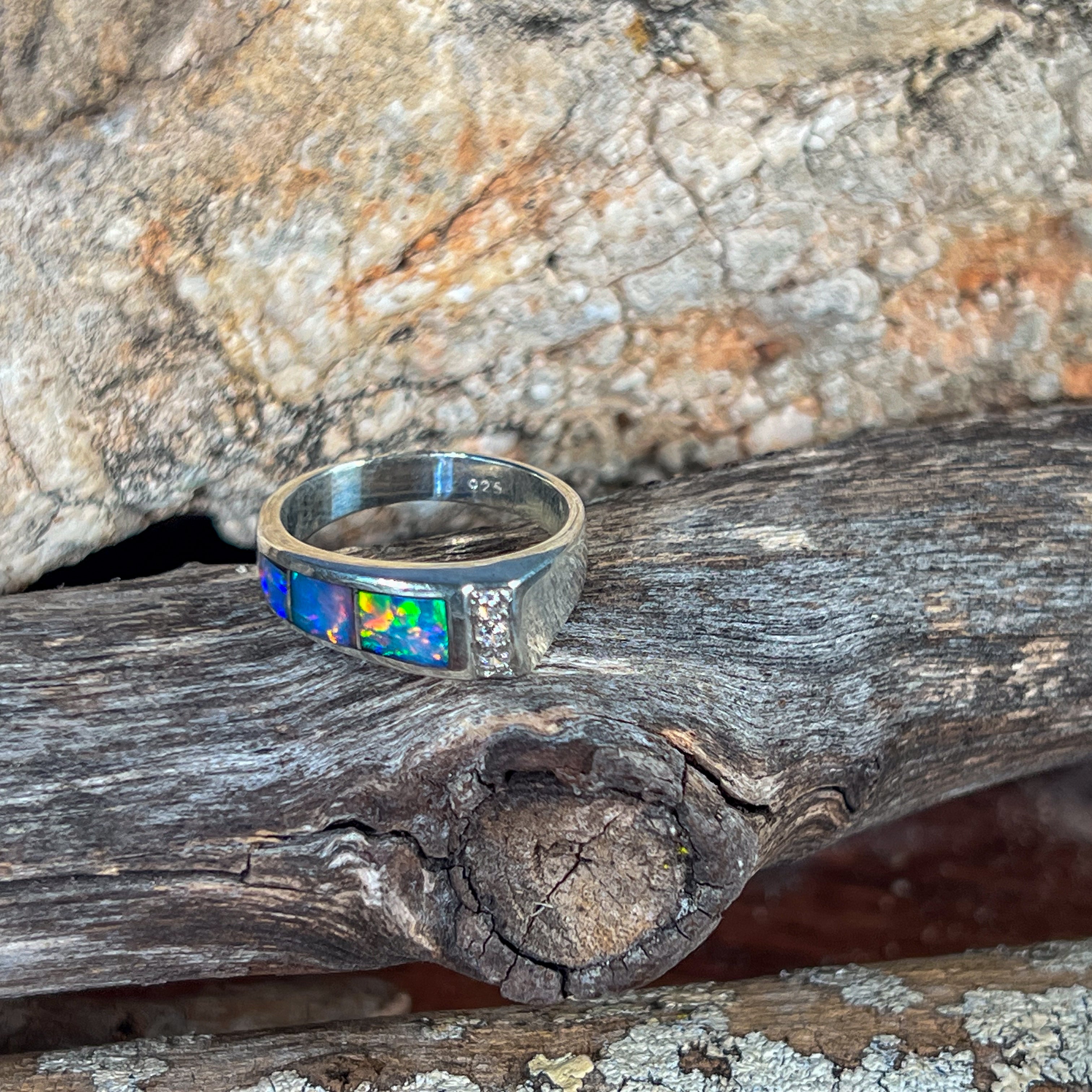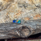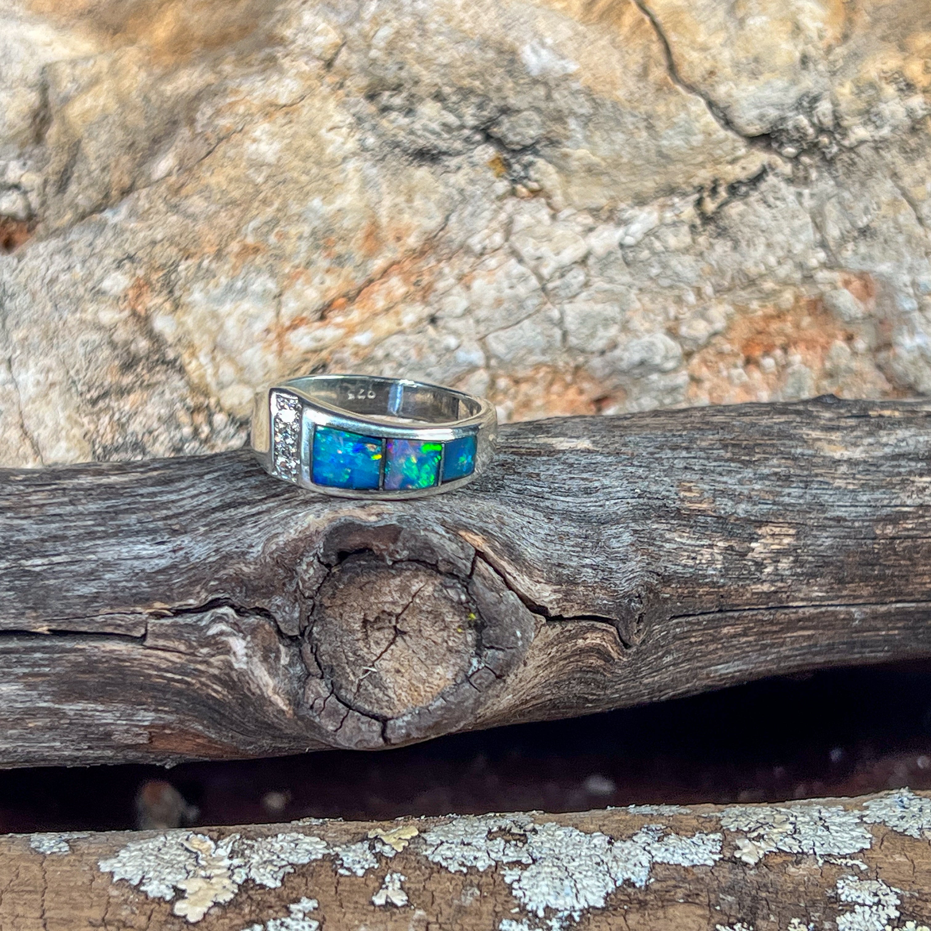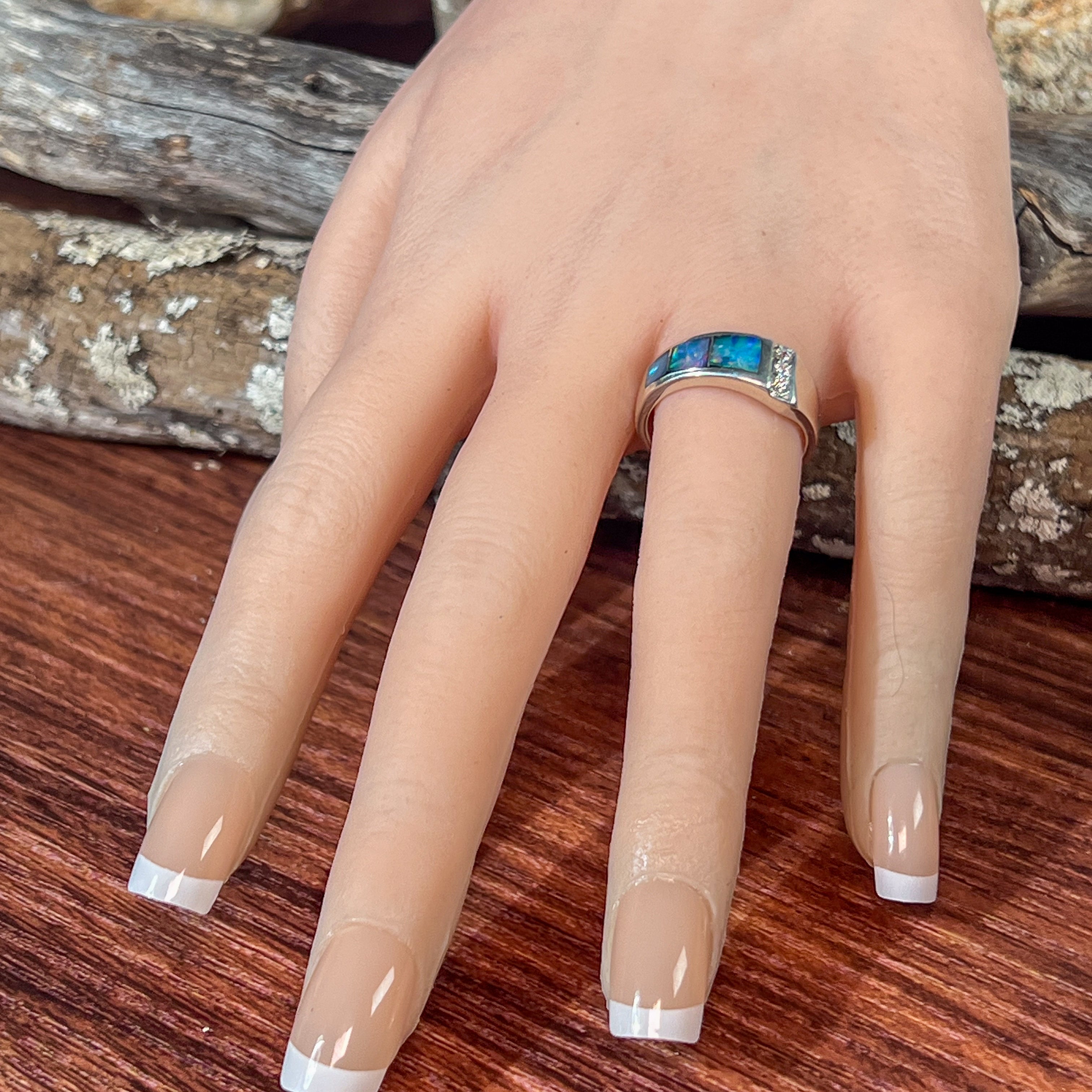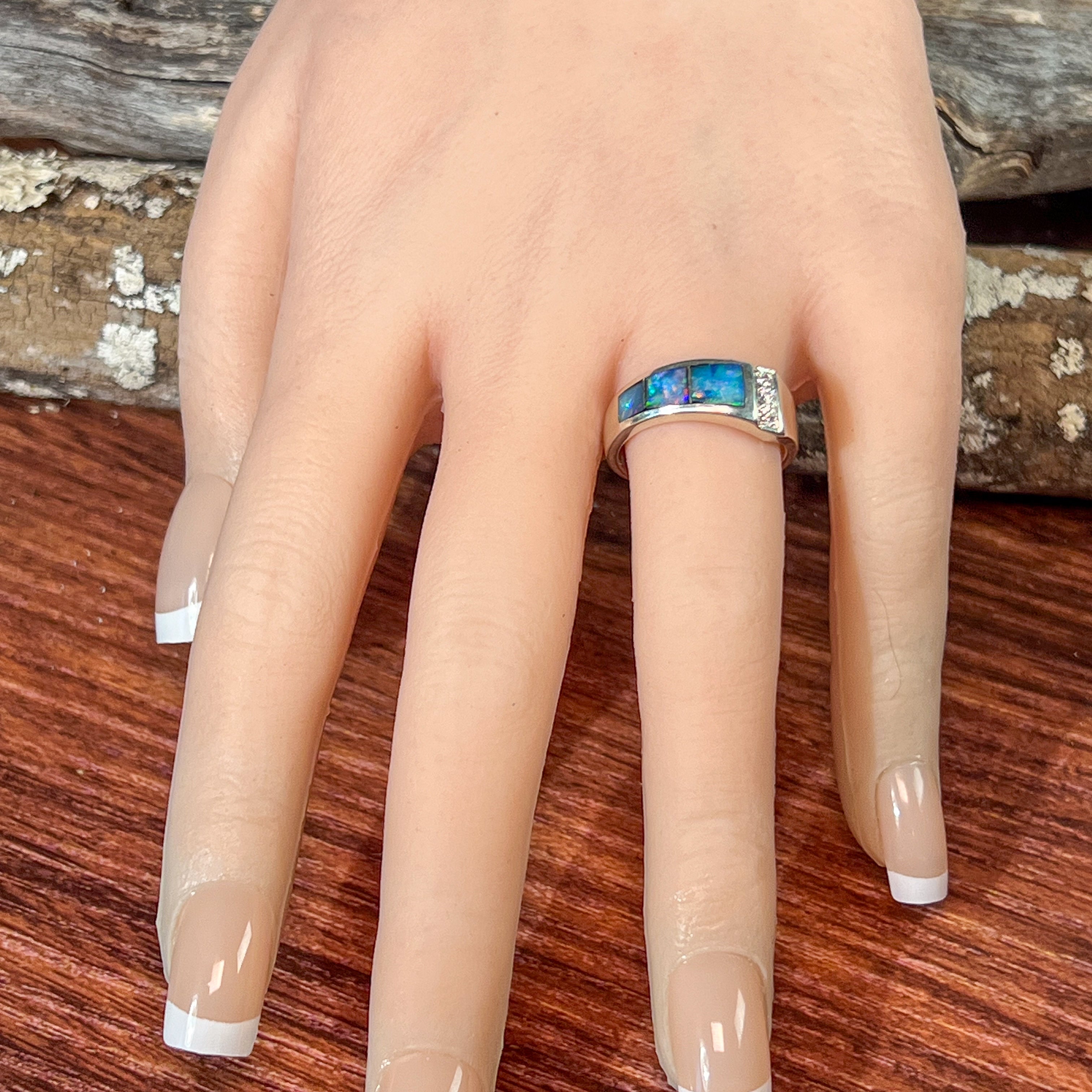 This sterling silver ring features a sleek, modern design with a unique natural opal inlay. The combination of polished silver and vibrant opal creates an elegant piece that stands out for its refined simplicity and lasting quality. Perfect for those seeking a contemporary accessory with a touch of natural beauty.