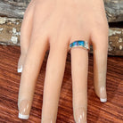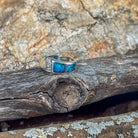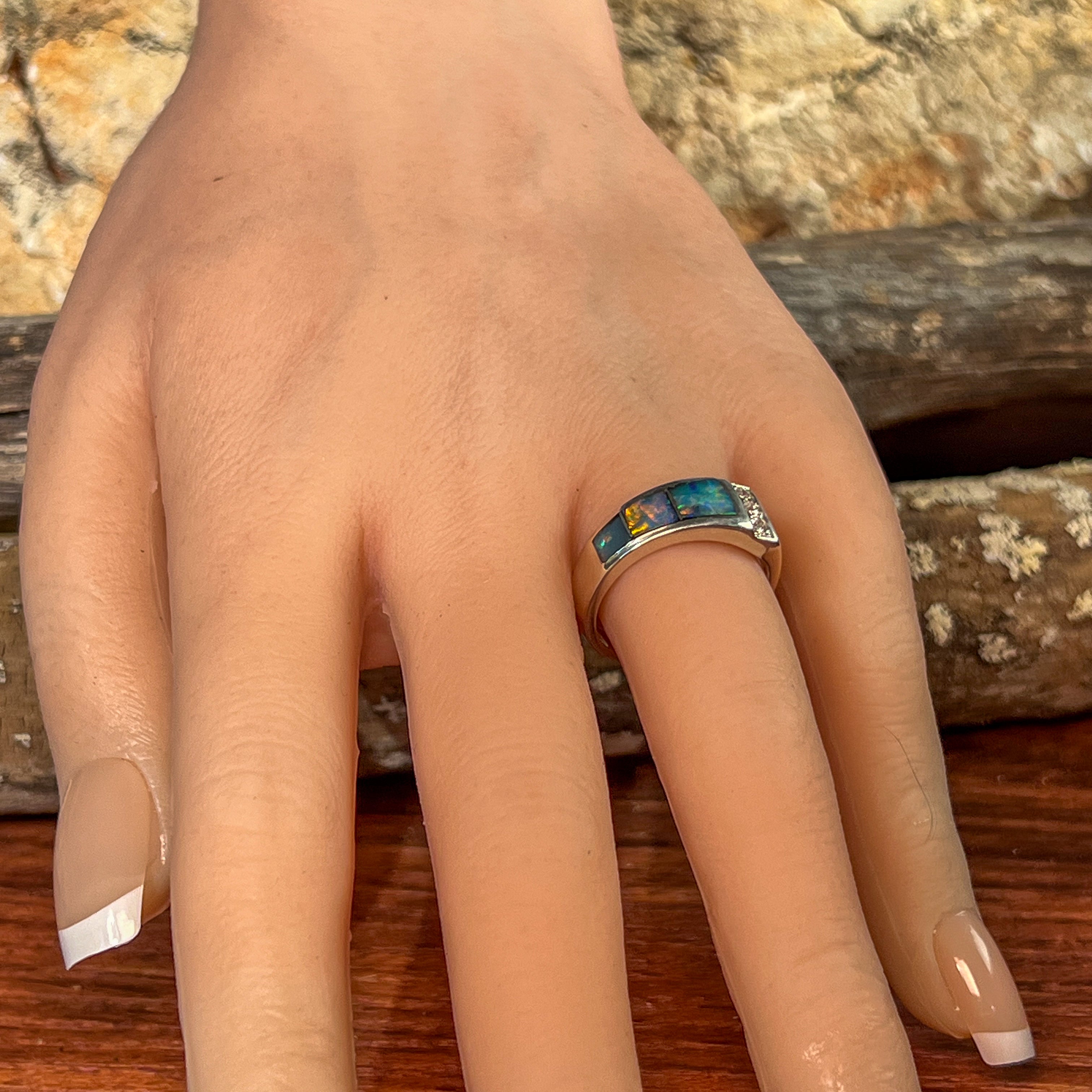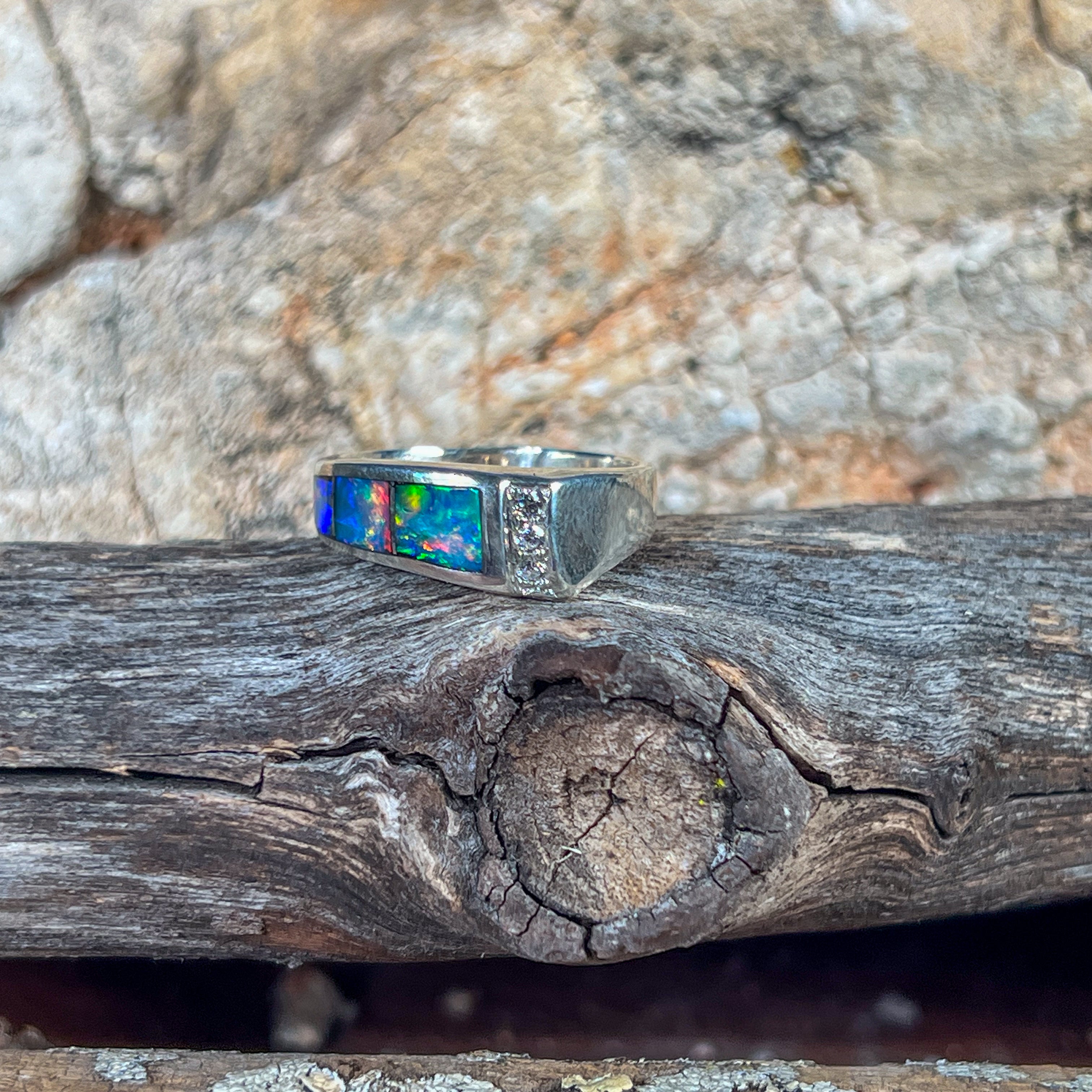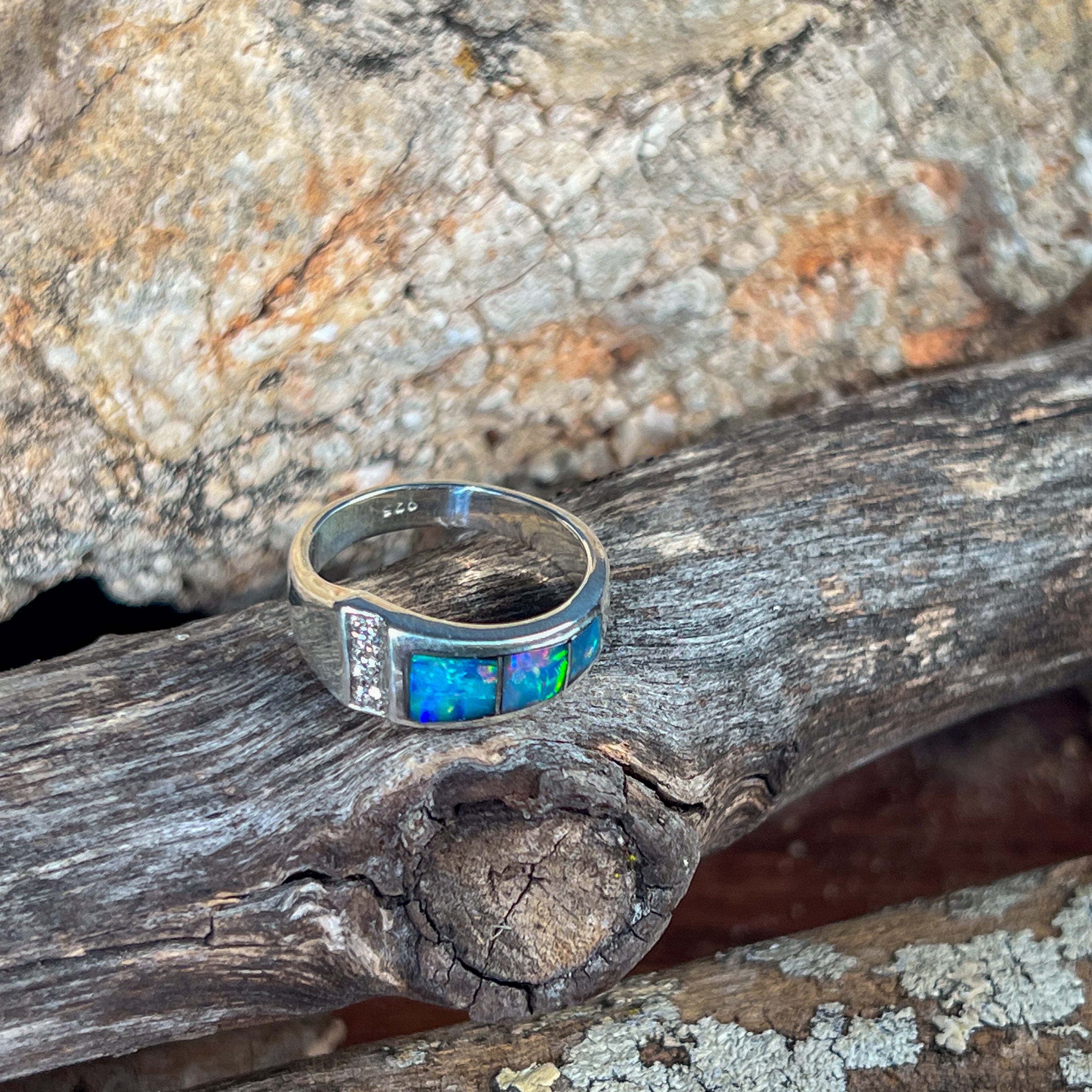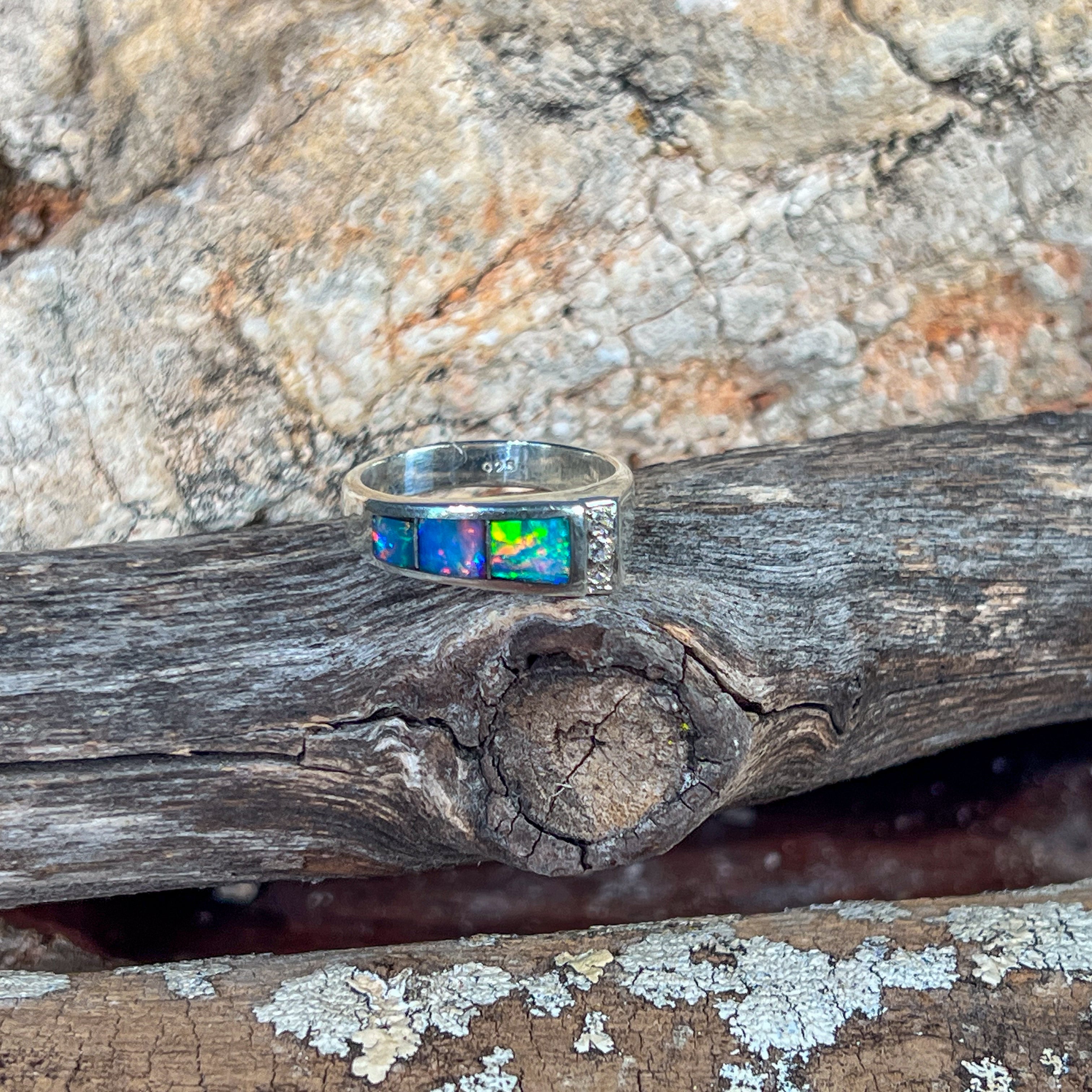 This sterling silver ring features a sleek, modern design with a unique natural opal inlay. The combination of polished silver and vibrant opal creates an elegant piece that stands out for its refined simplicity and lasting quality. Perfect for those seeking a contemporary accessory with a touch of natural beauty.
