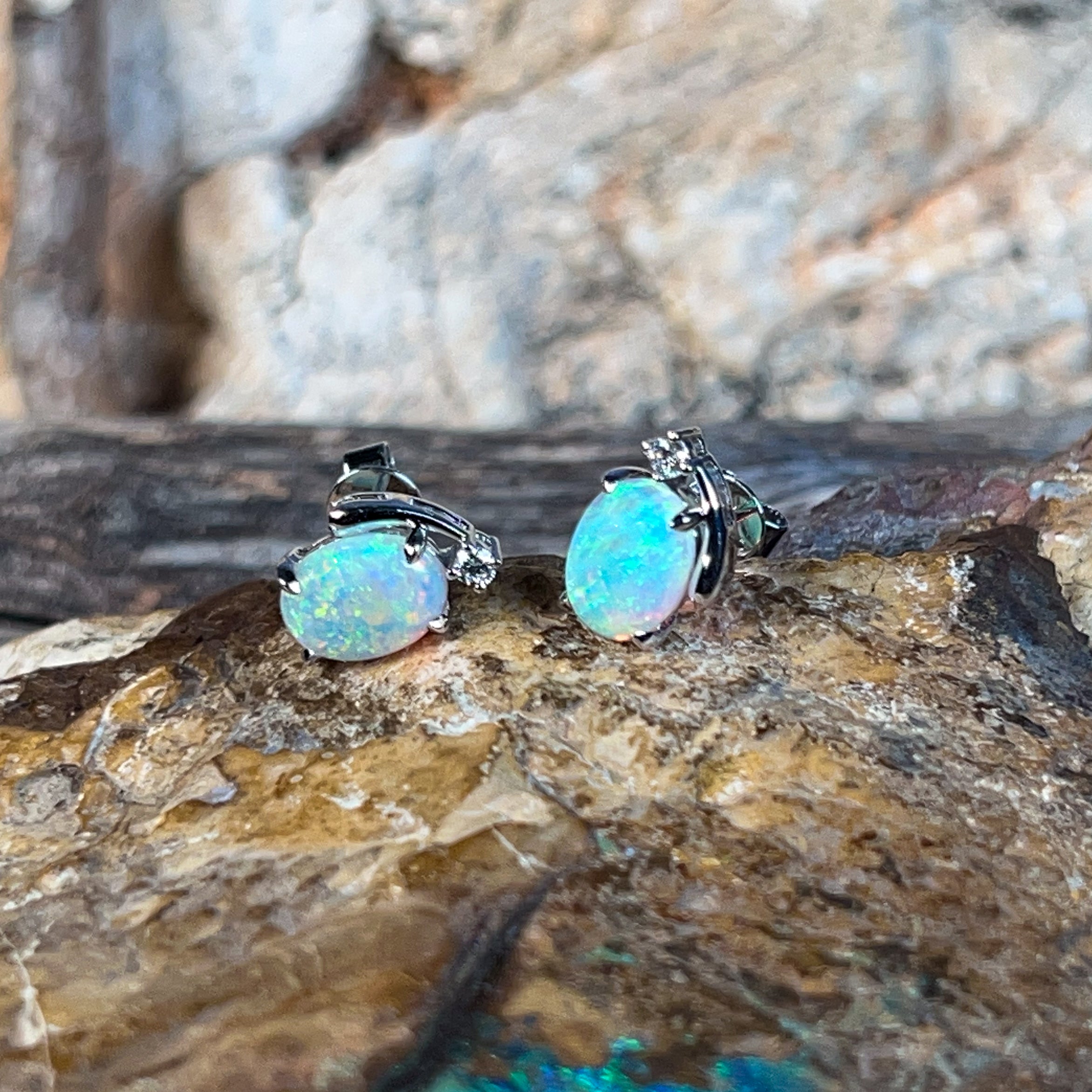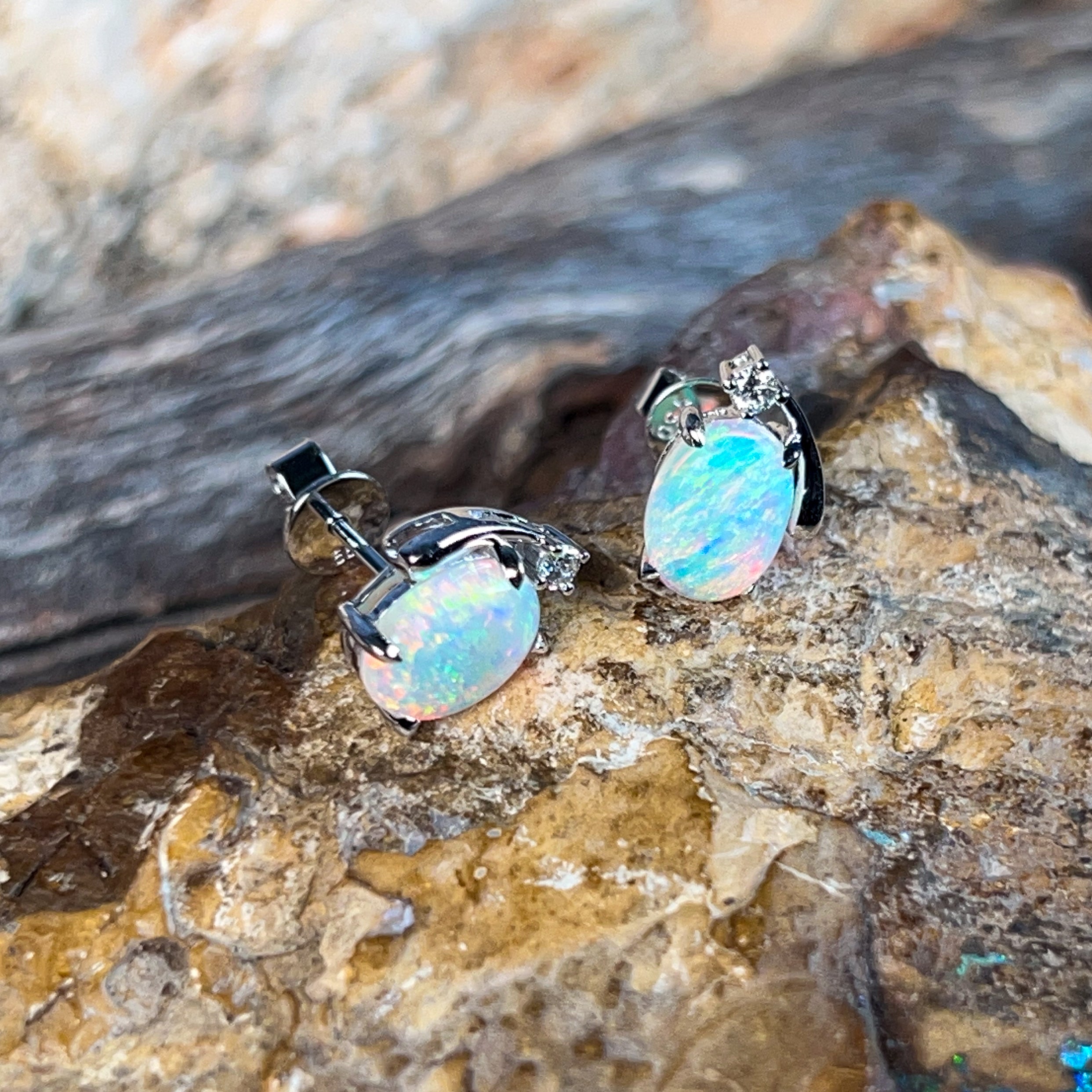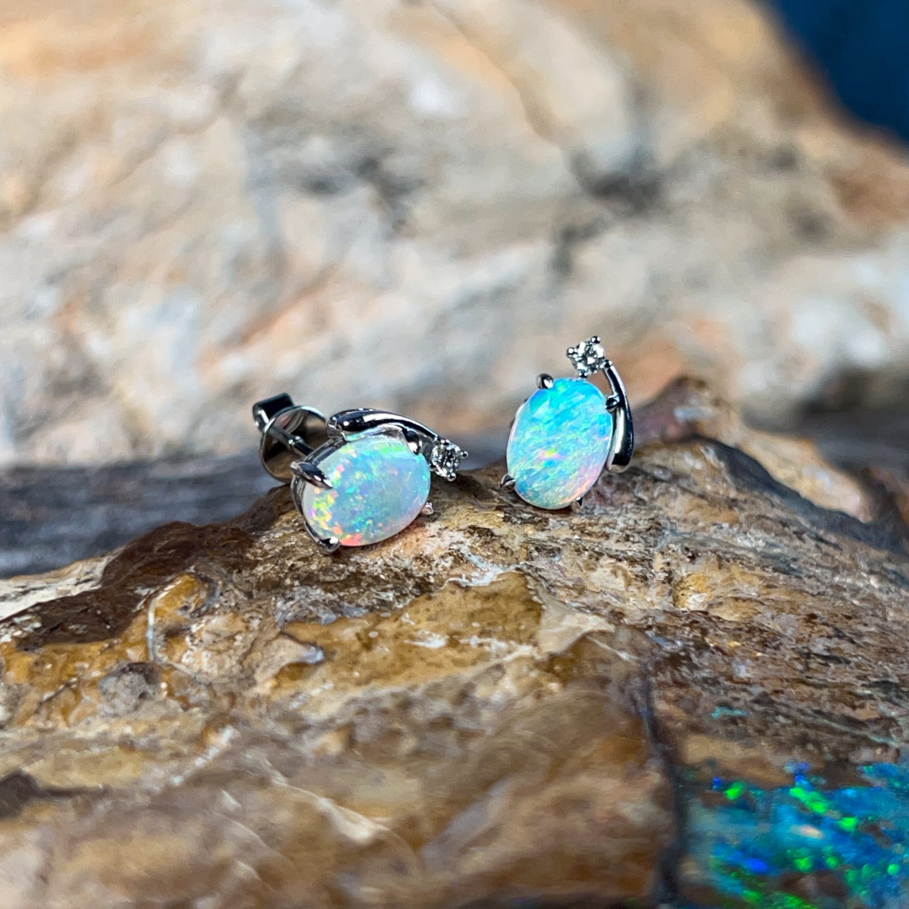 Sparkle with joy in these delightful 18kt white gold studs! Each pair features a radiant 8x6mm crystal opal that dances with bright, mesmerizing colours—think fiery reds, vibrant blues, and sunny yellows all swirling together. Framed by shimmering diamonds, these little treasures catch the light beautifully and add a pop of personality to any look. Perfect for opal lovers who want everyday elegance with a cheerful twist.