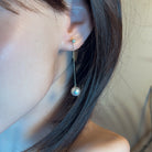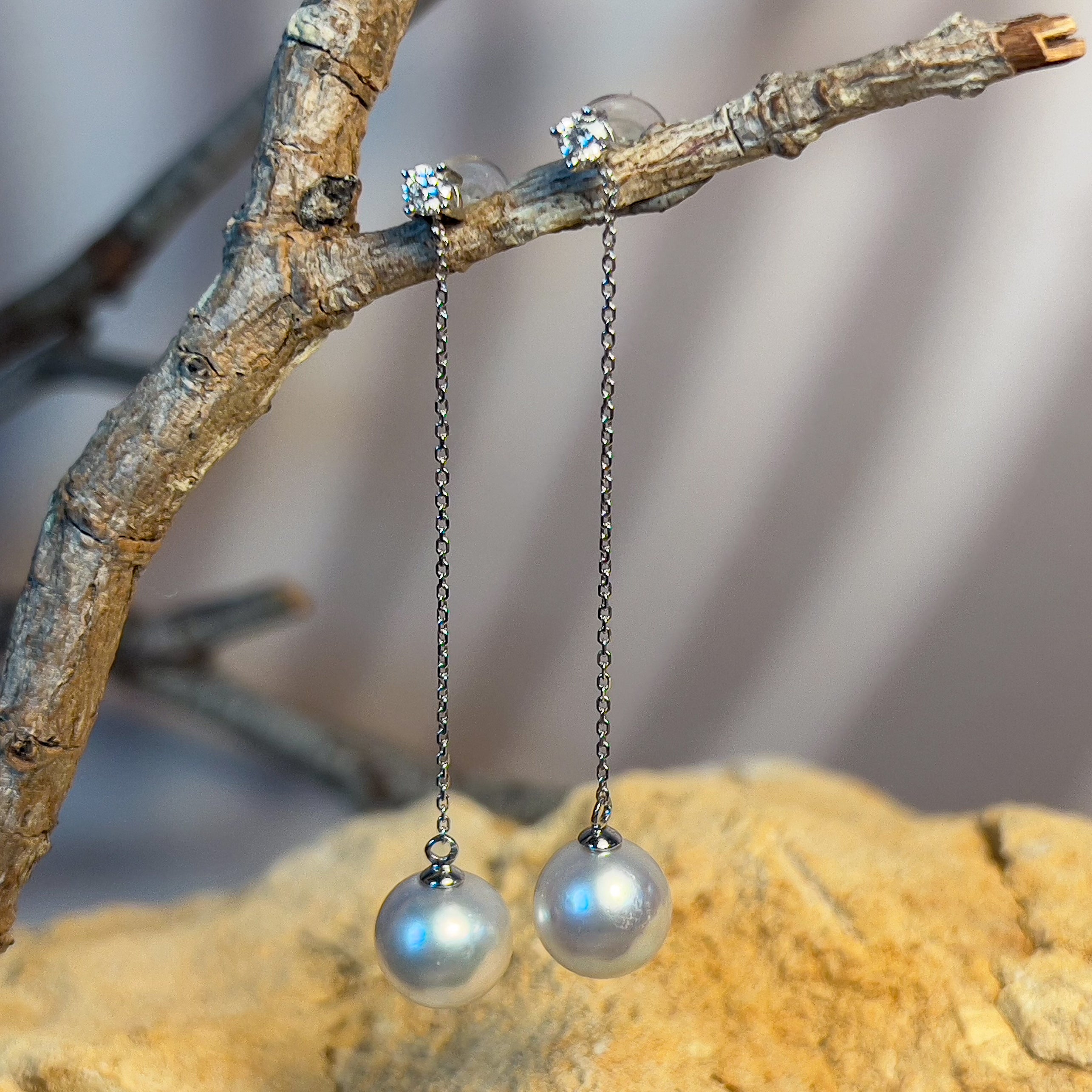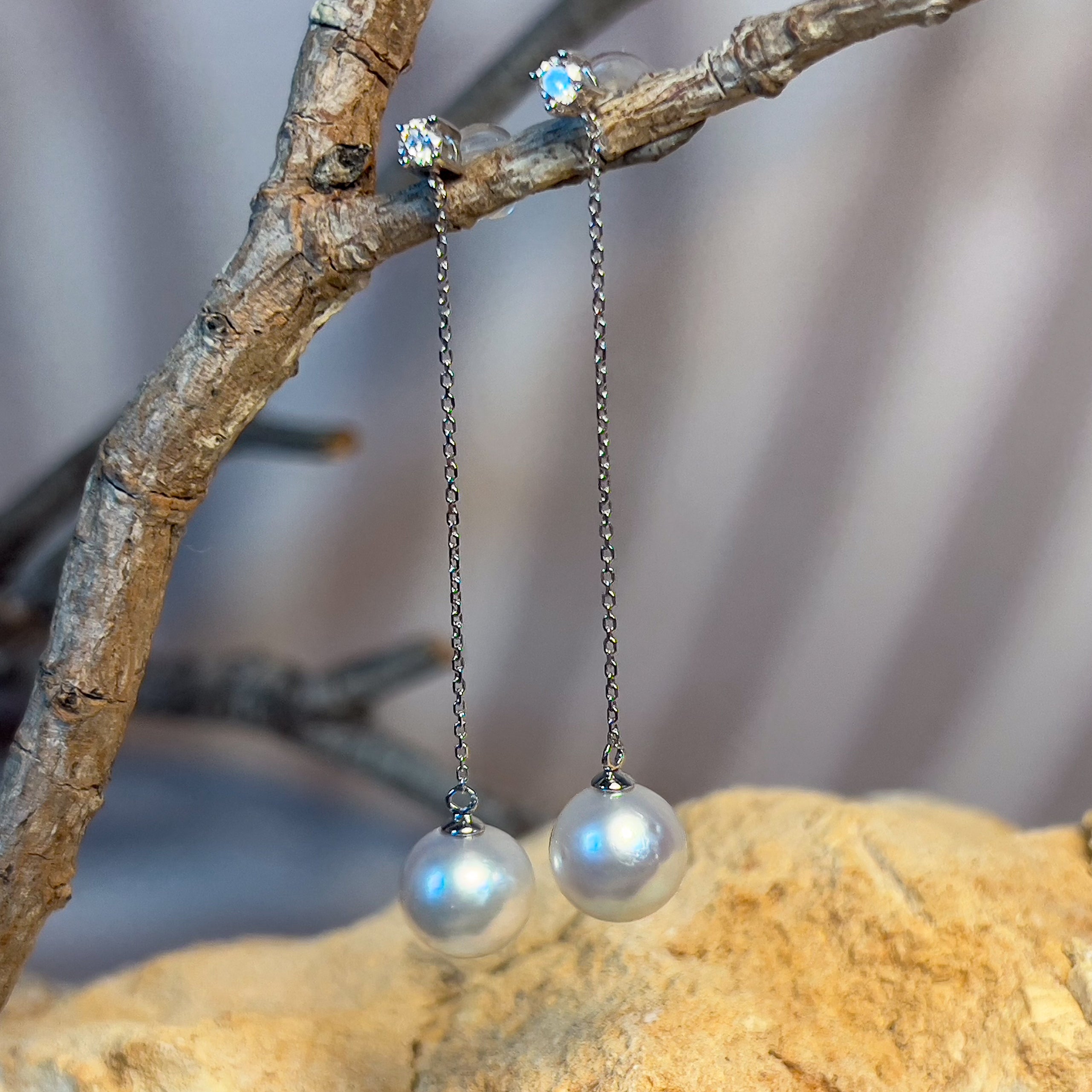 Indulge in ultimate luxury with our 18kt White Gold dangling earrings featuring 8.5-9mm South Sea pearls and dazzling diamonds. Allow the elegant white pearls to drop and sway with every step, making a statement of sophistication and exclusivity. Elevate any outfit to new heights with these exquisite pearl earrings.