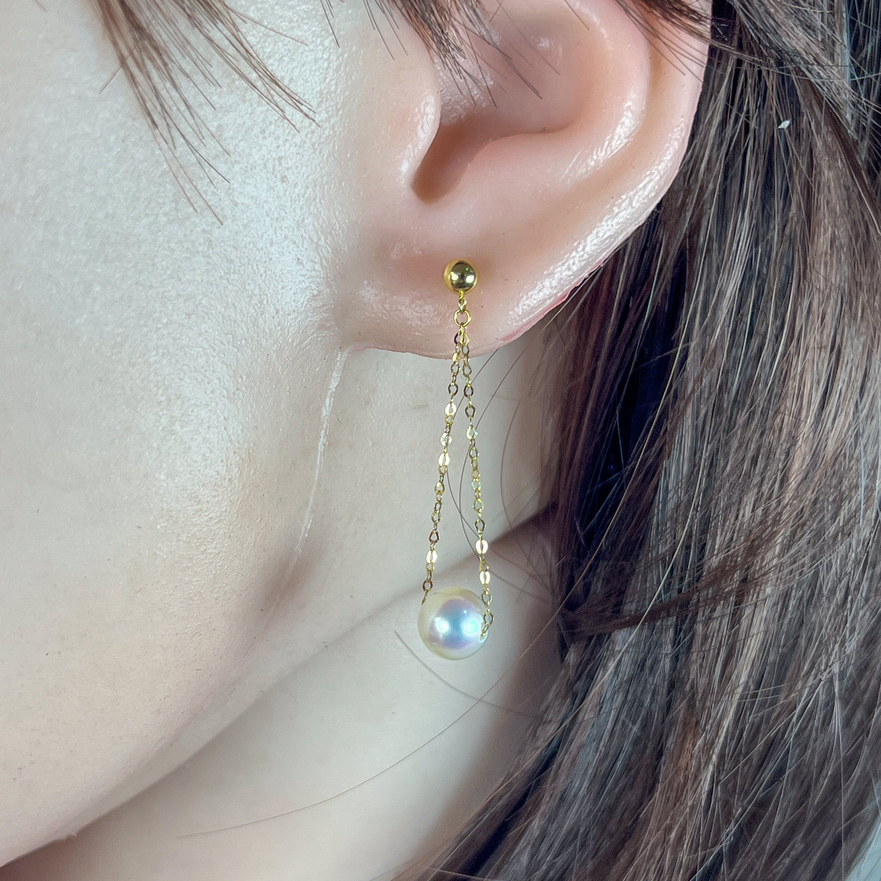 Elevate your elegance with these 18kt yellow gold earrings featuring lustrous Akoya pearls measuring 7-7.5mm. Their delicate dangling design offers a modern, refined touch that complements both everyday wear and special occasions with understated sophistication.