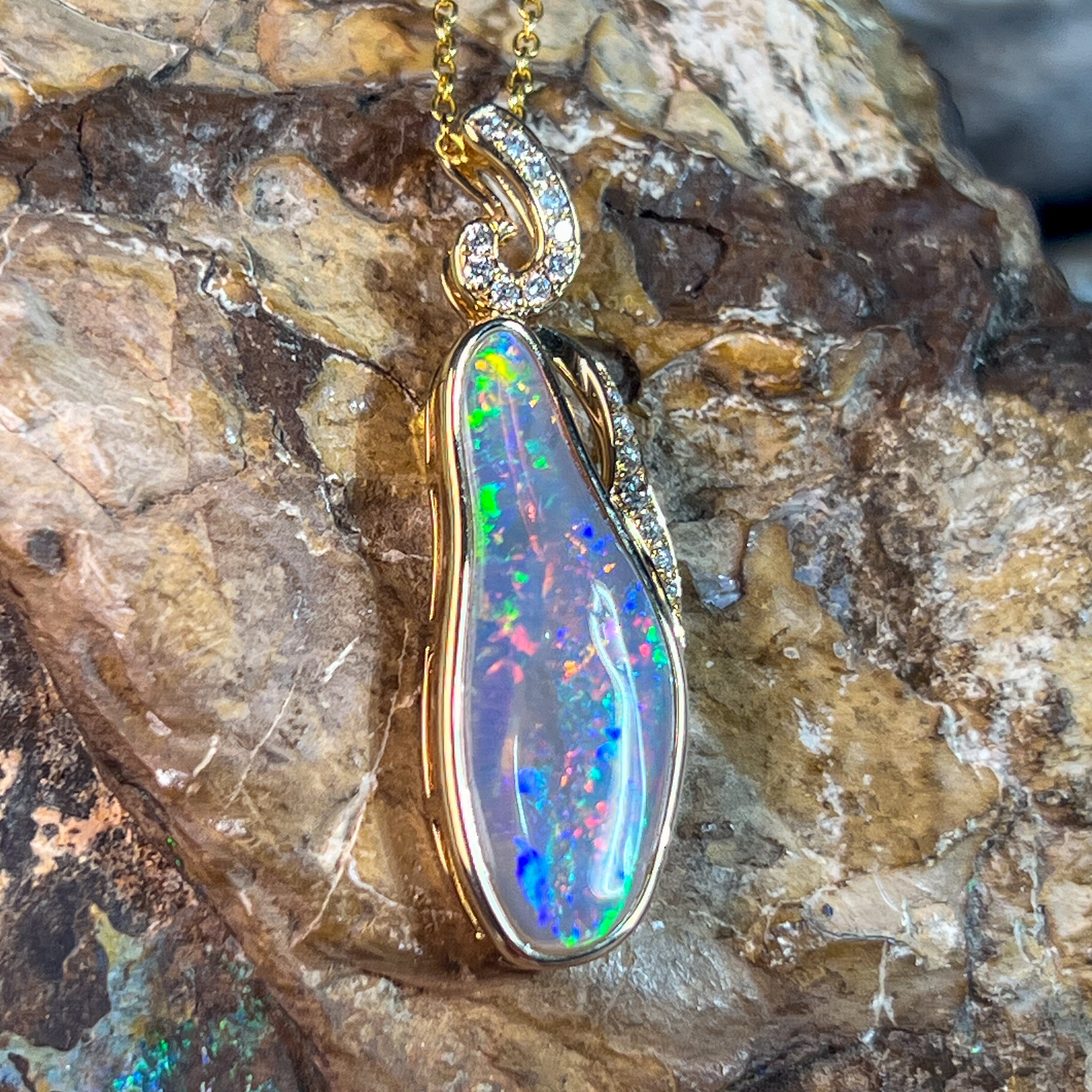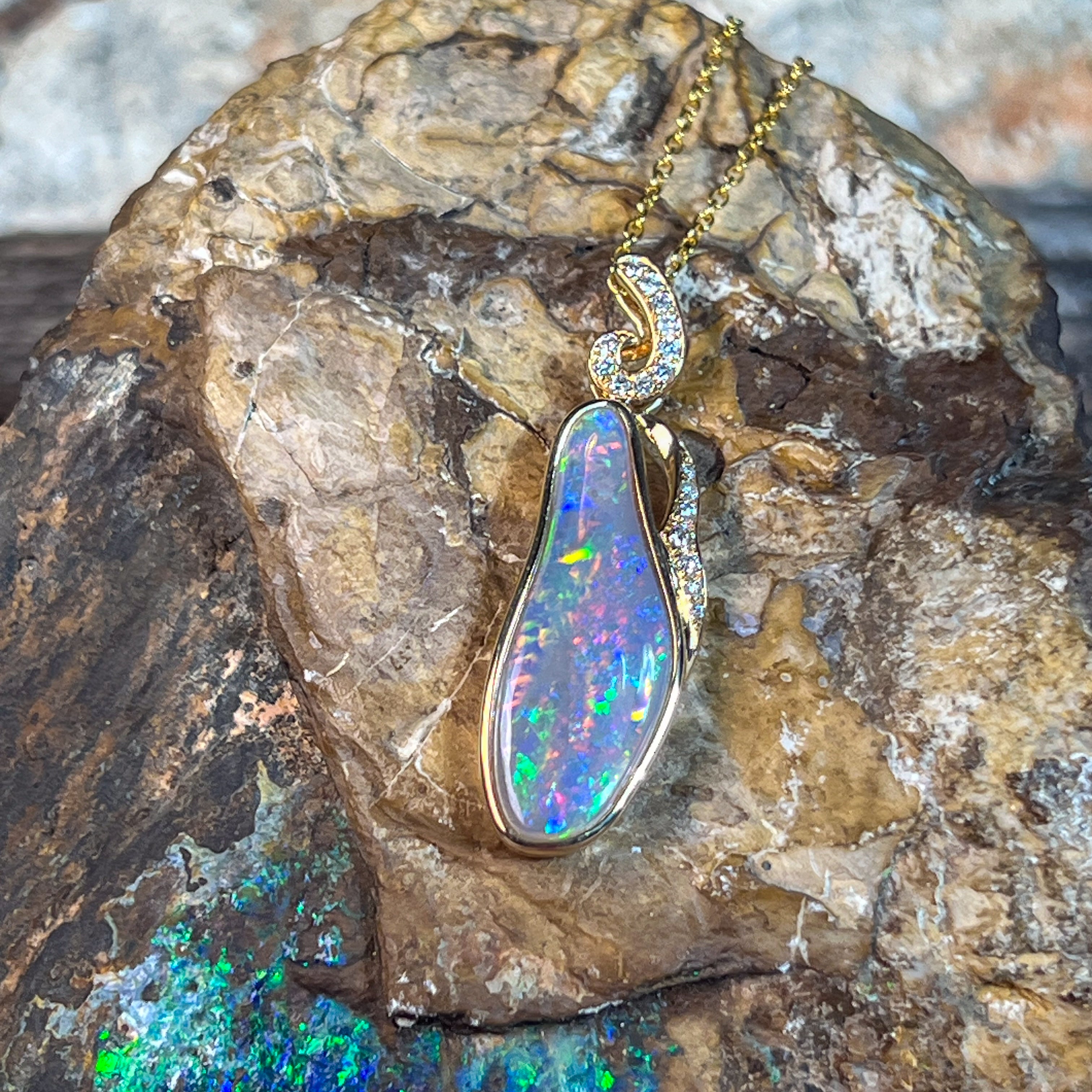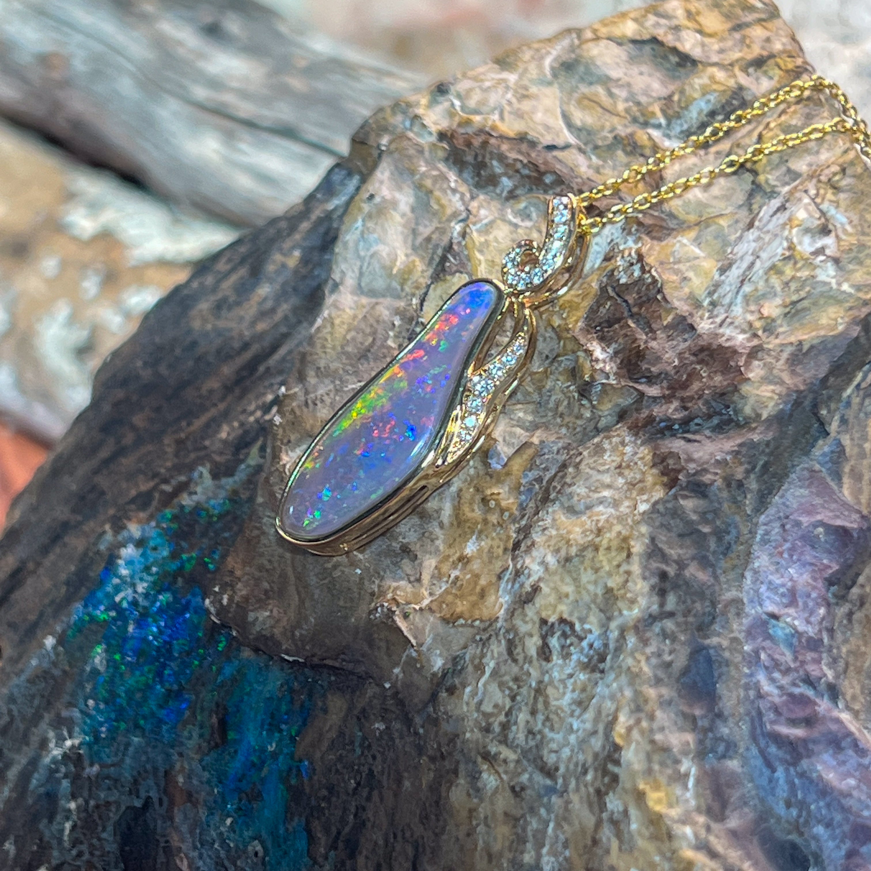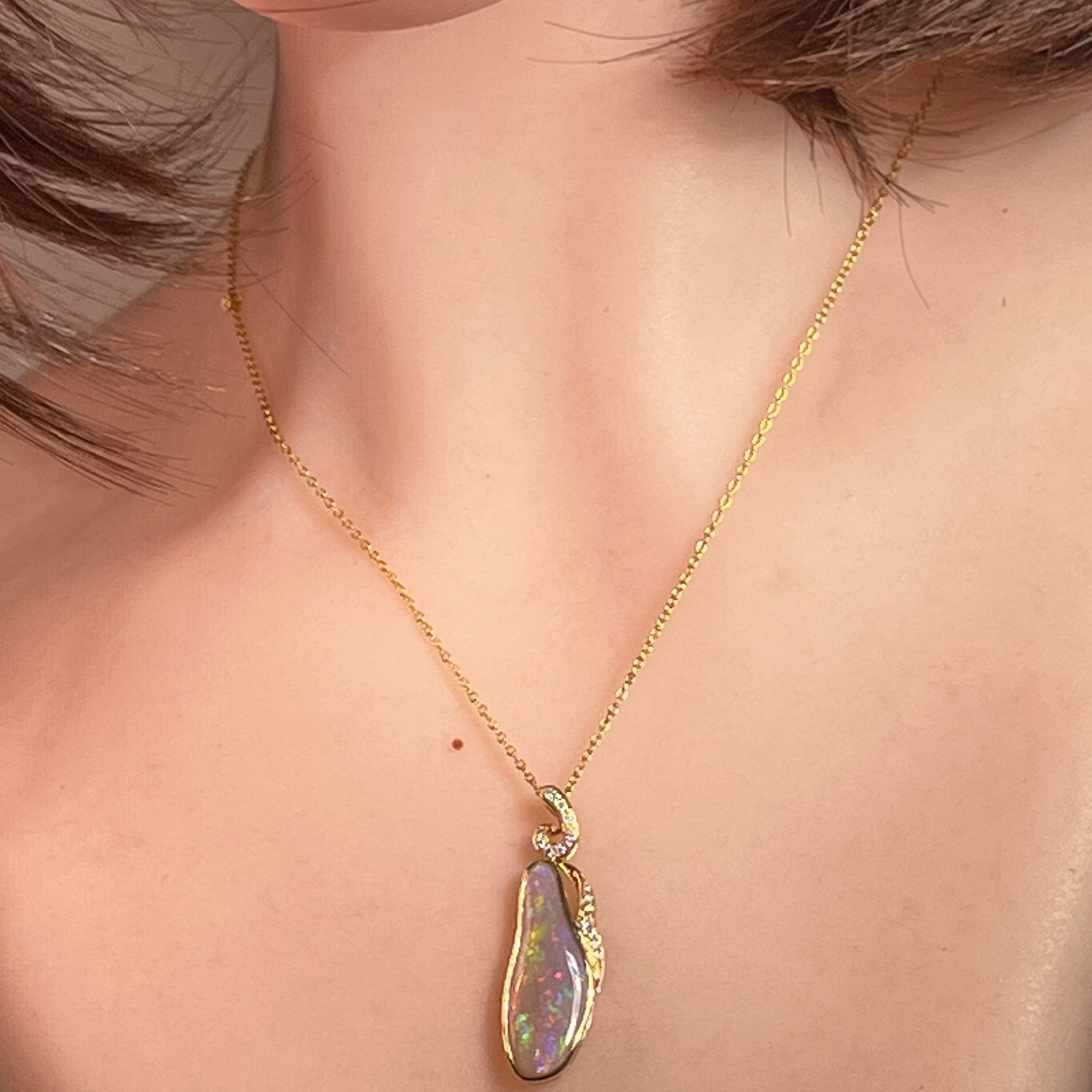 18kt Yellow Gold Red Purple Crystal Opal and diamond pendant