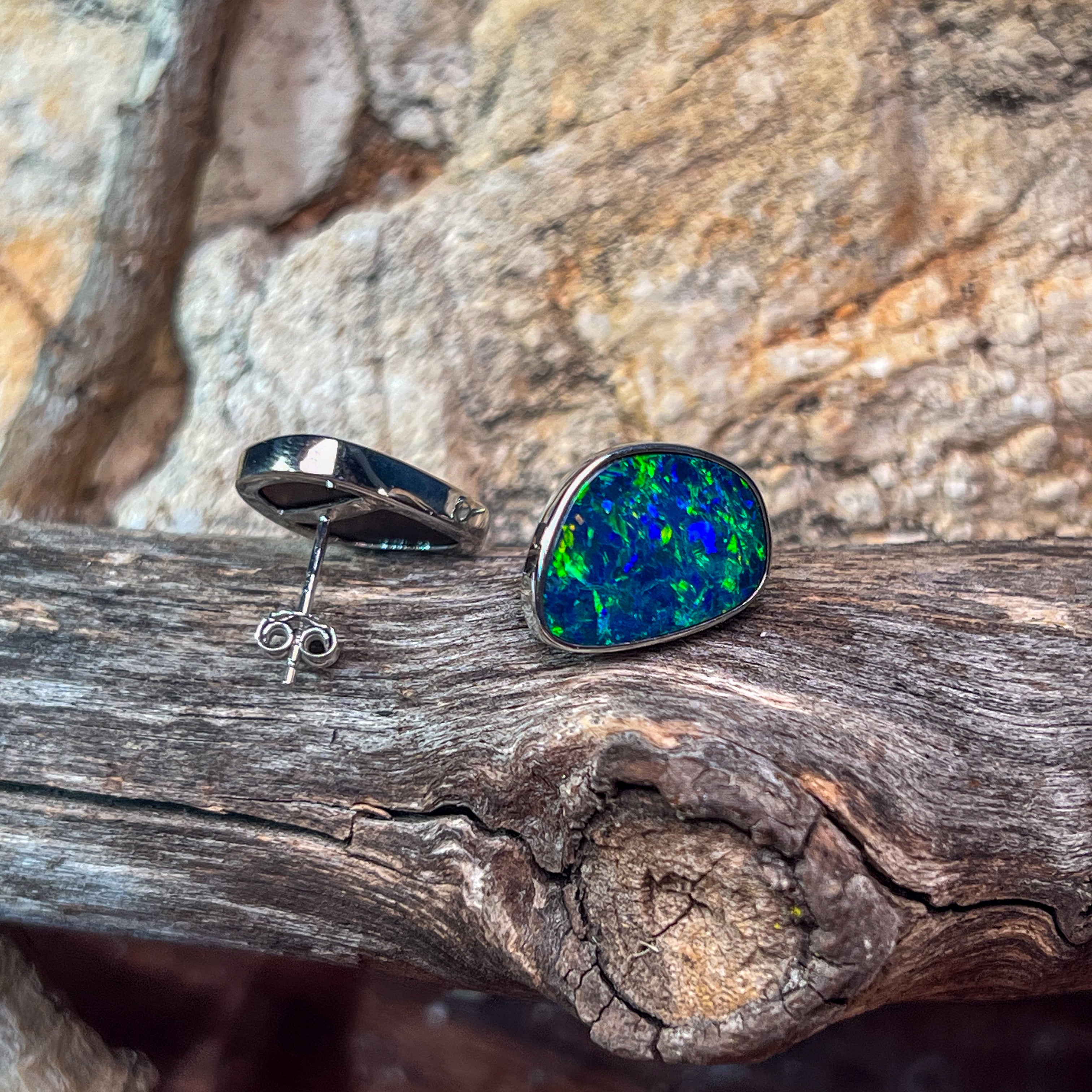 Add a splash of bold elegance with these sterling silver large studs featuring rectangular freeform-shaped opal doublets. Their deep, classic colors catch the light with every move, making your ears the life of the party. Perfect for those who love a playful twist on timeless style!