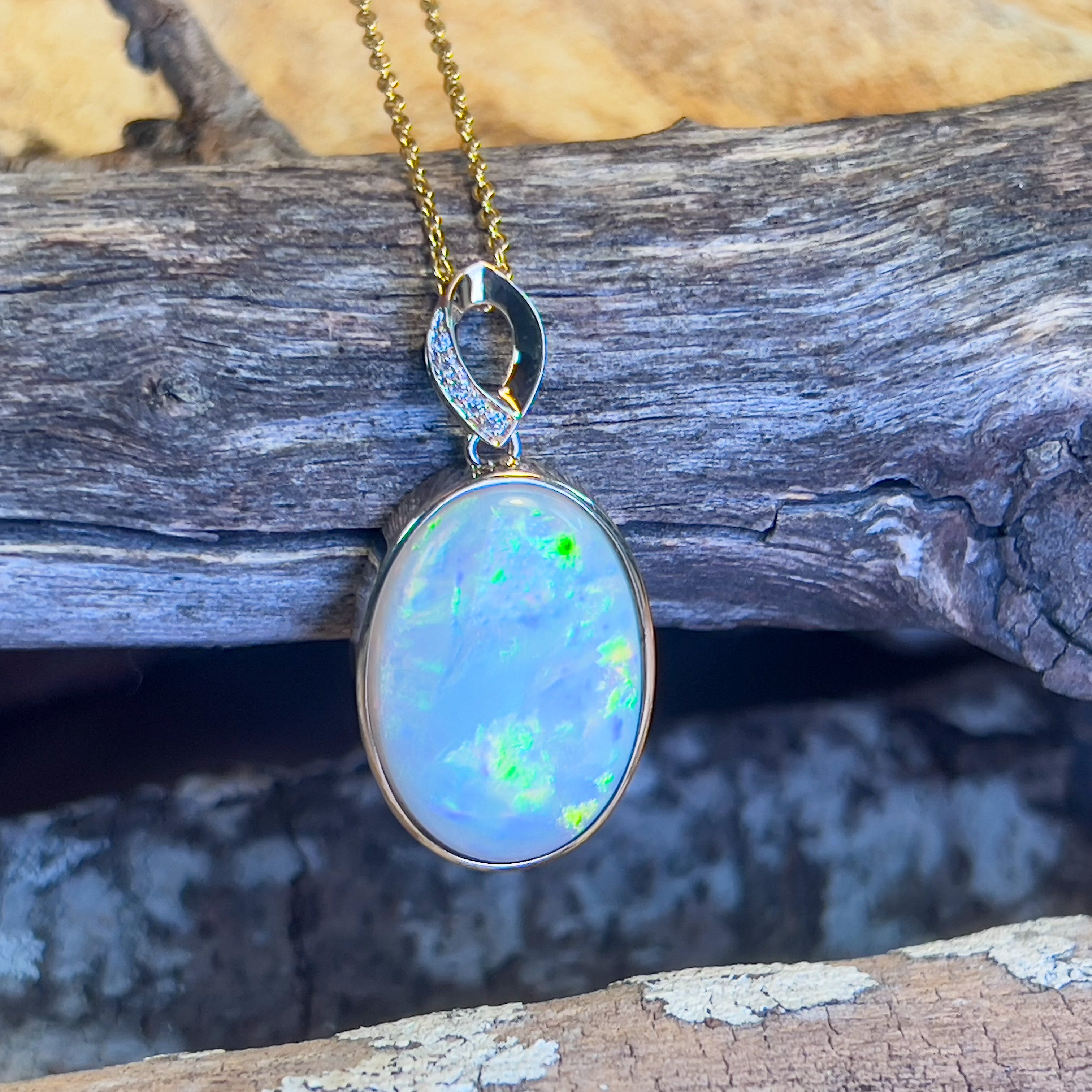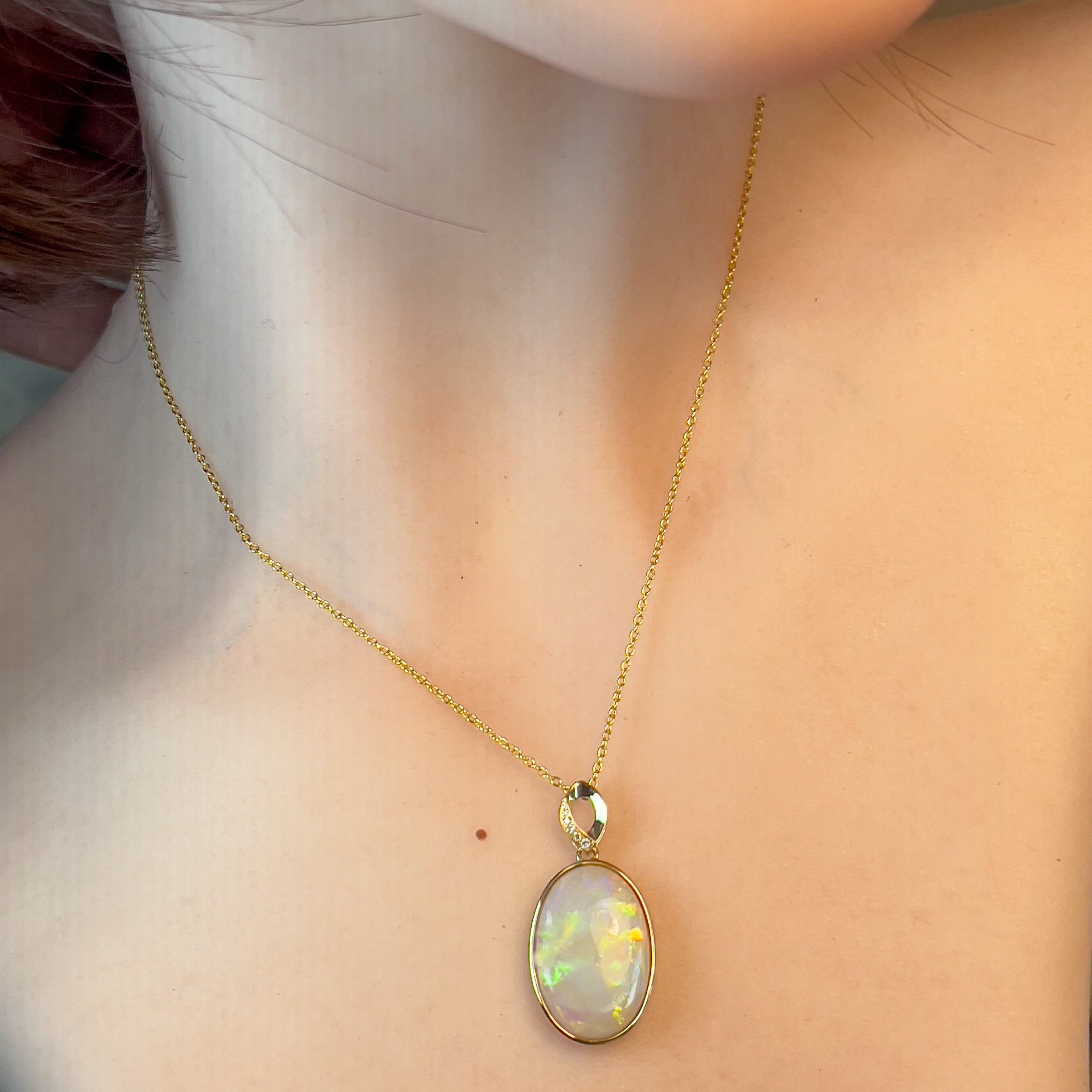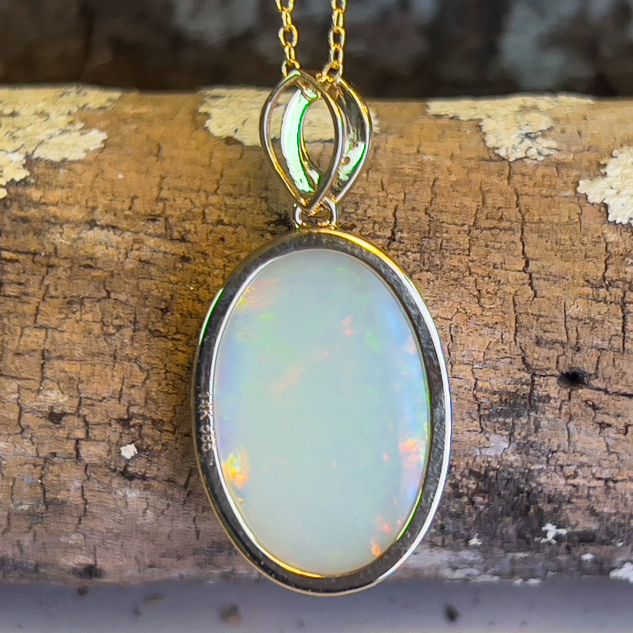 Shine bright with our 14kt Yellow Gold Large Opal Pendant. The 11.26ct oval shape opal showcases an array of stunning colors, perfect for adding a pop of fun to any outfit. Bezel set in yellow gold, this classic white opal pendant is a must-have addition to your jewelry collection.