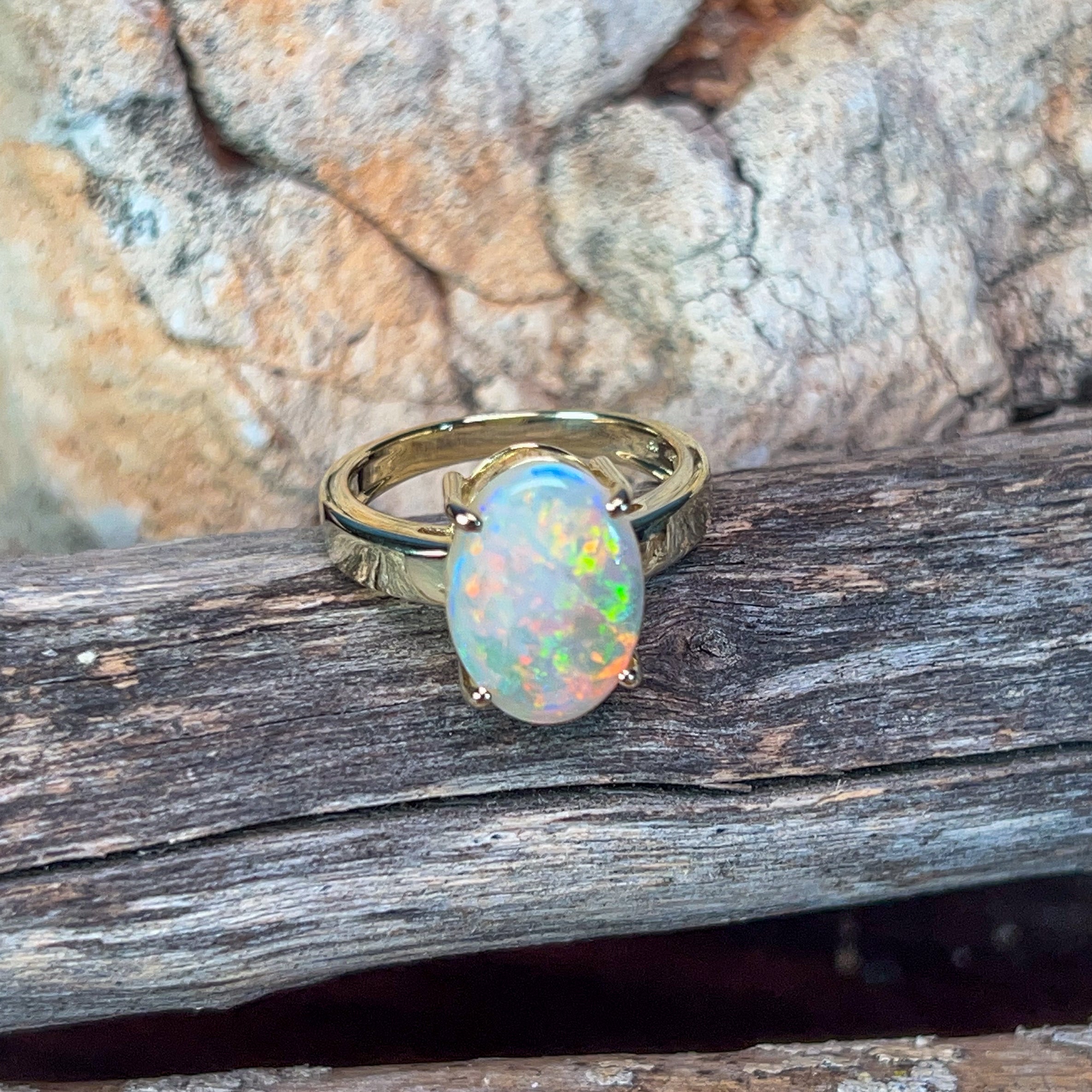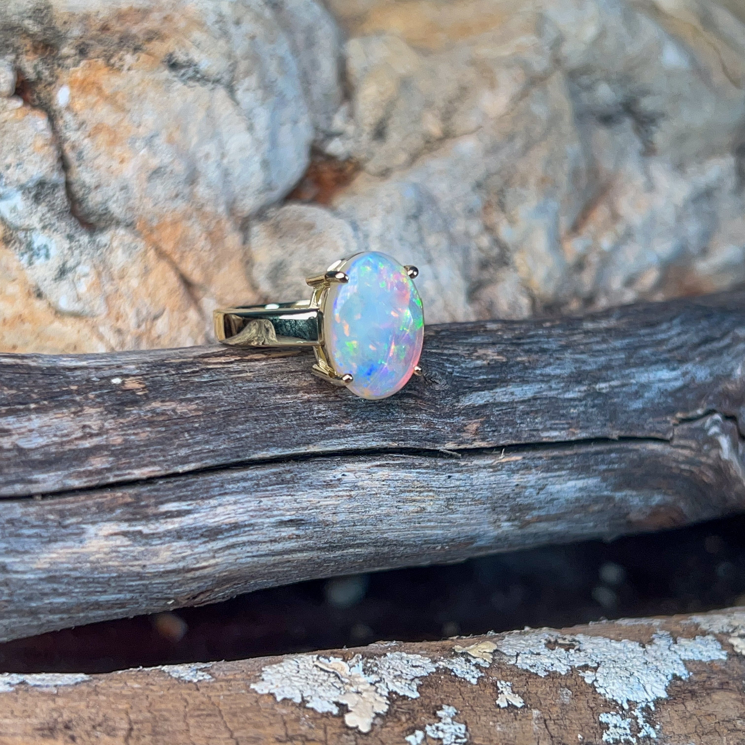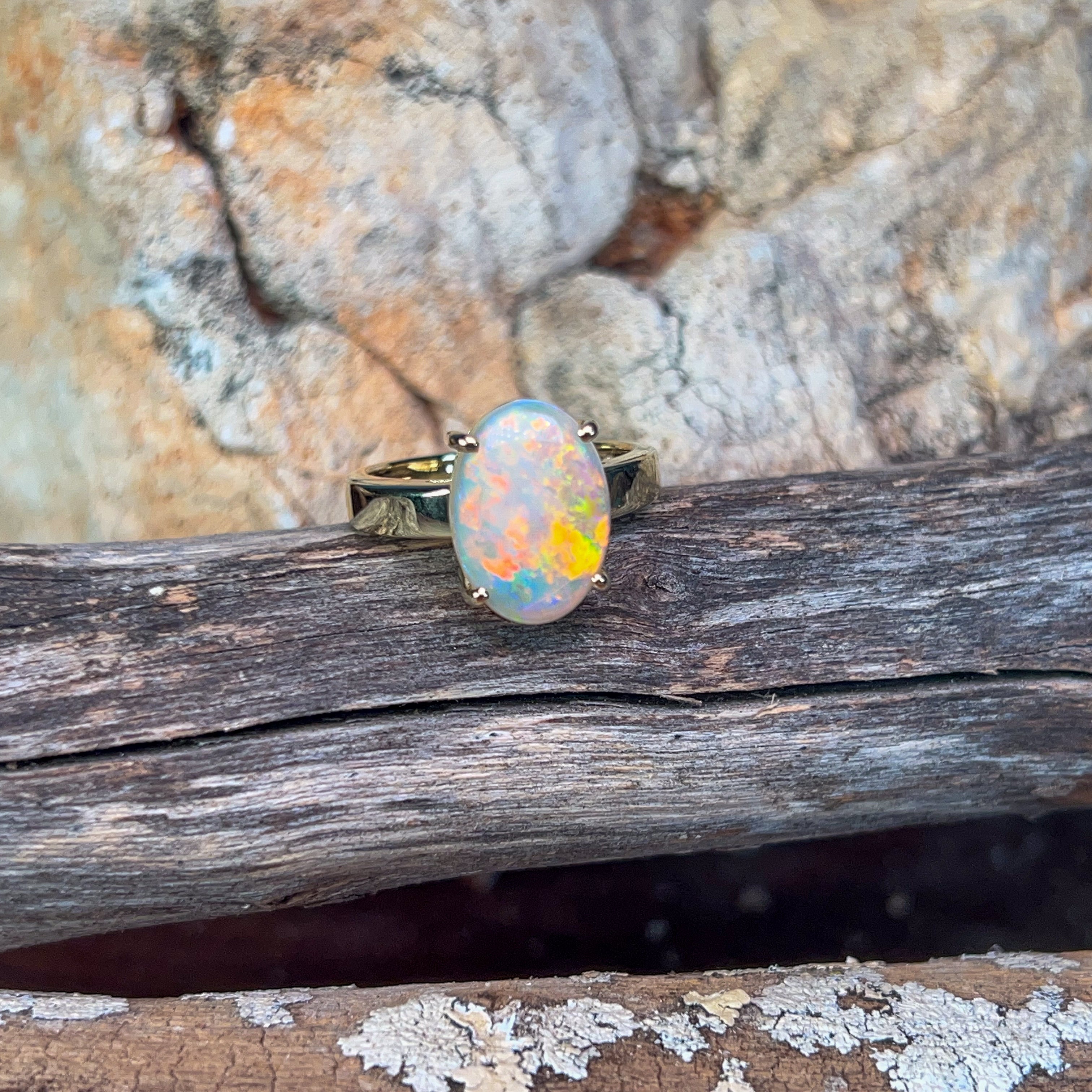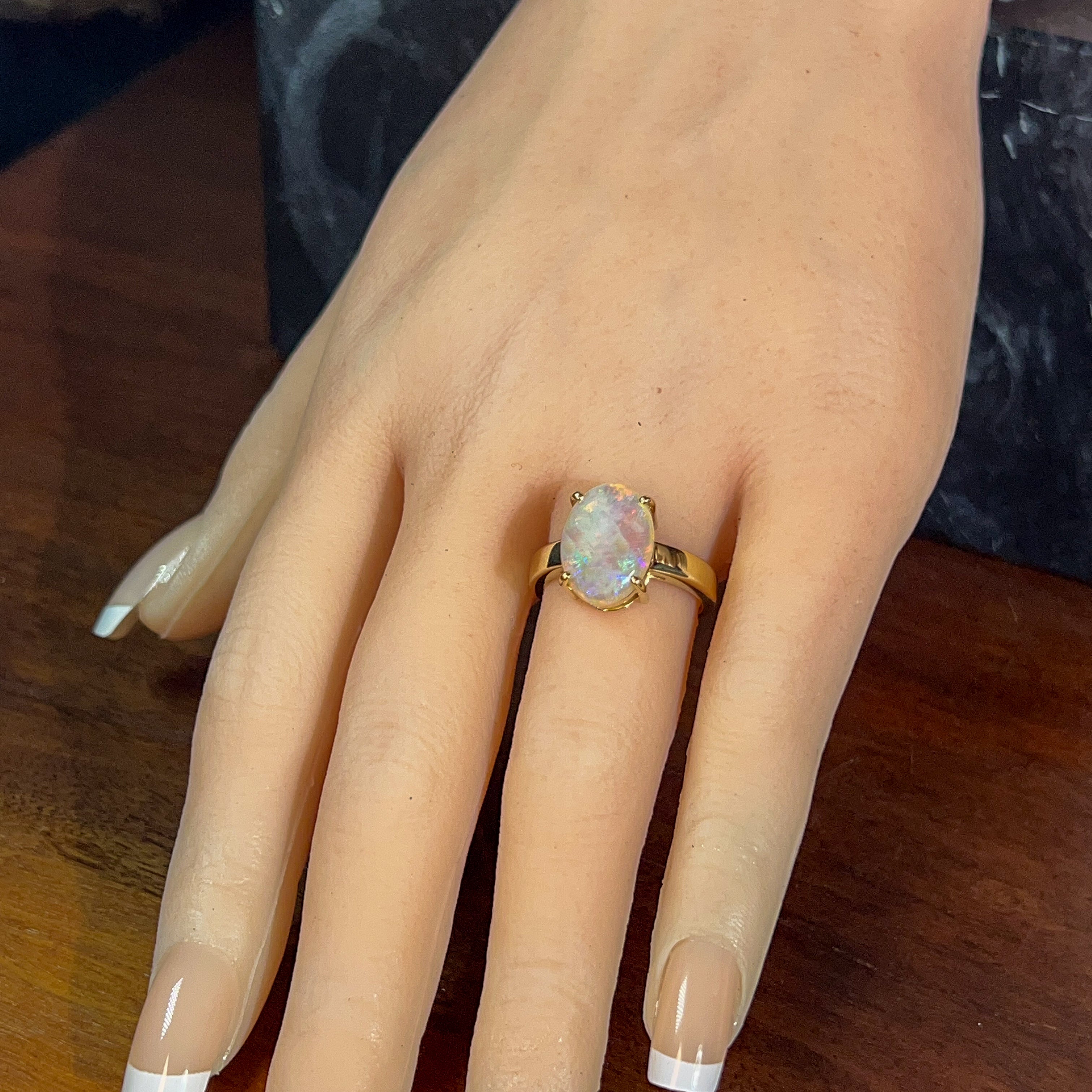 This stunning 14kt yellow gold solitaire ring features a magnificent 2.81ct Australian light opal that commands attention with its spectacular play of fire. The oval opal (14x10mm) displays a vibrant spectrum of colours—pink, red, yellow, blue, and green—creating a mesmerising statement piece that catches the light from every angle. Expertly set in a classic claw setting, this ring showcases the opal's natural beauty while the secure mounting ensures lasting wear. Perfect for those who appreciate bold, colourful gemstones that make a lasting impression. Ring size O 1/2, weighing 4.85g.