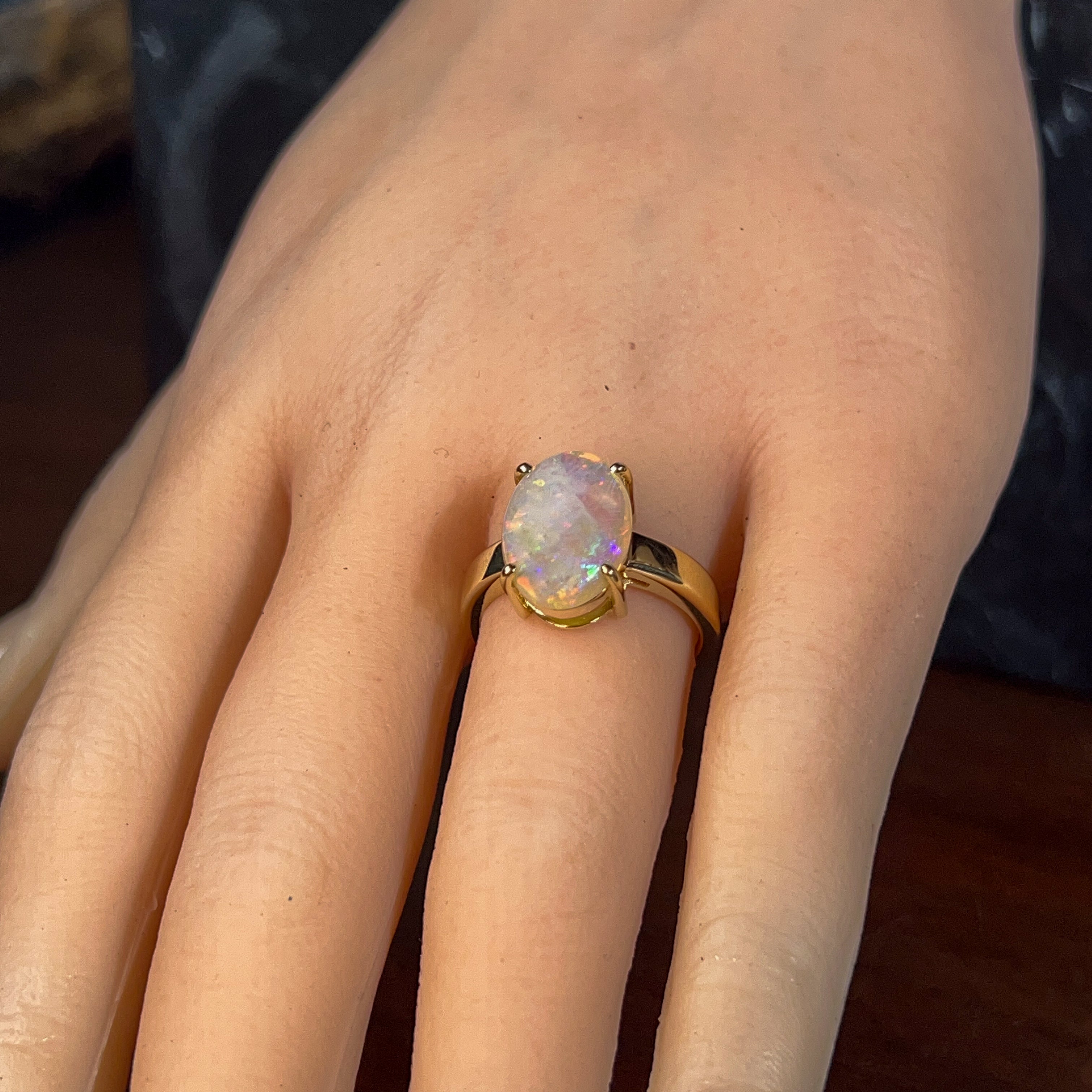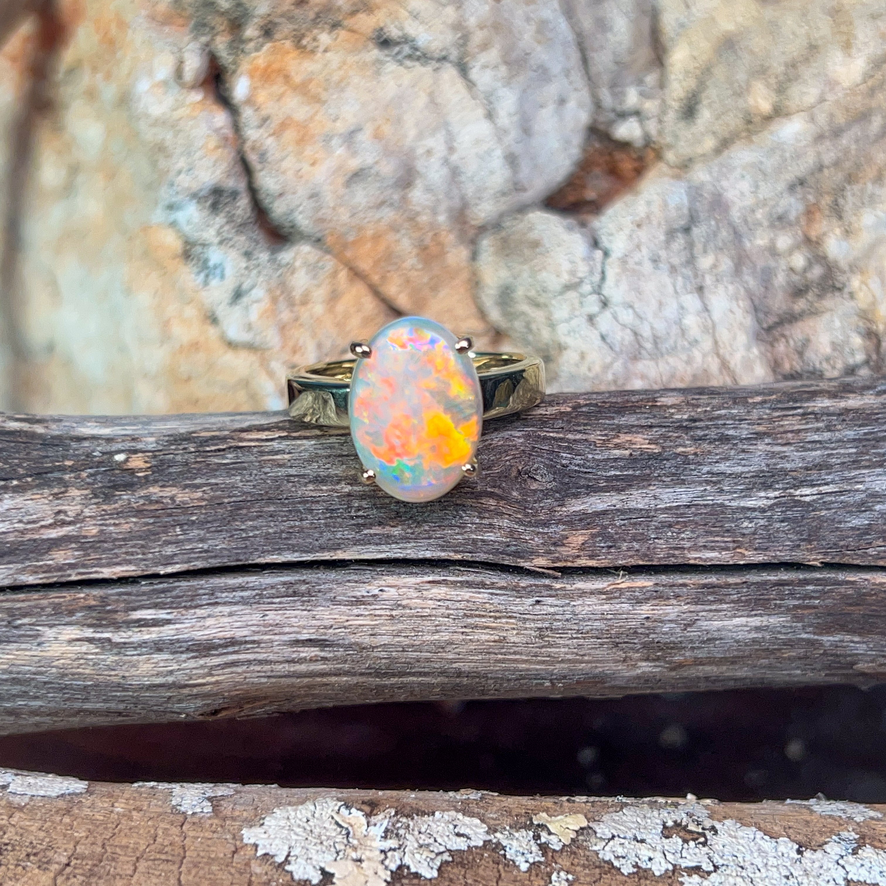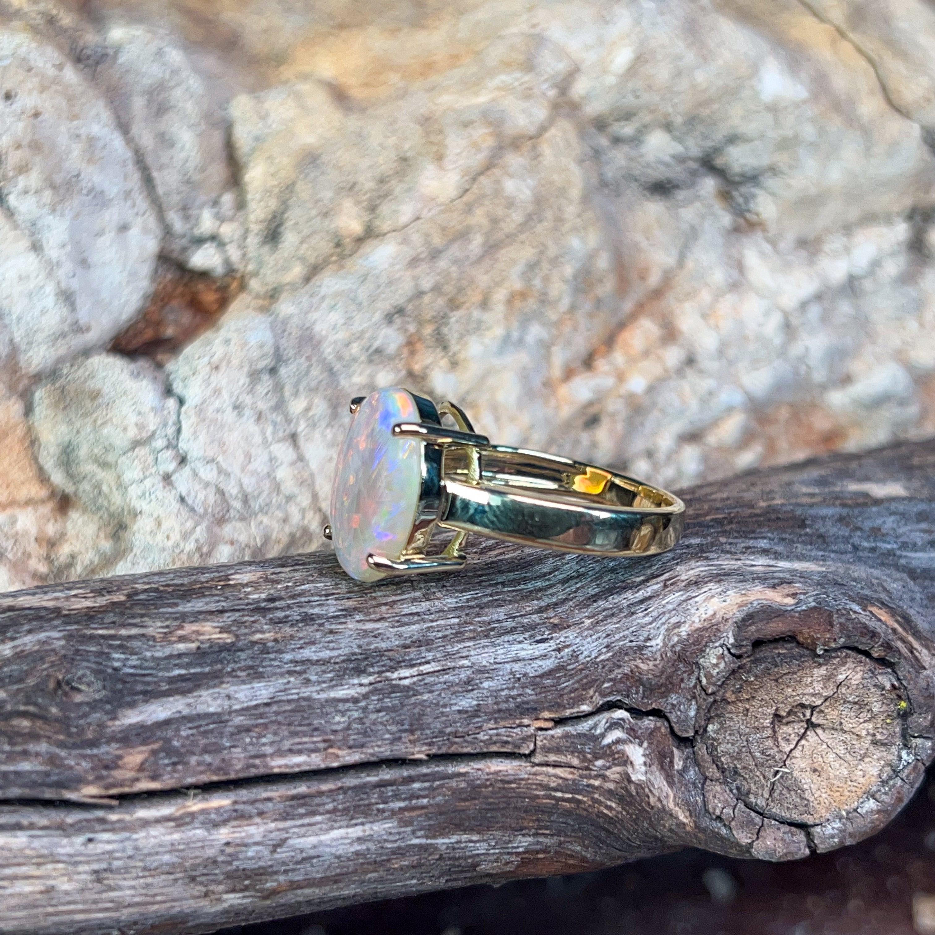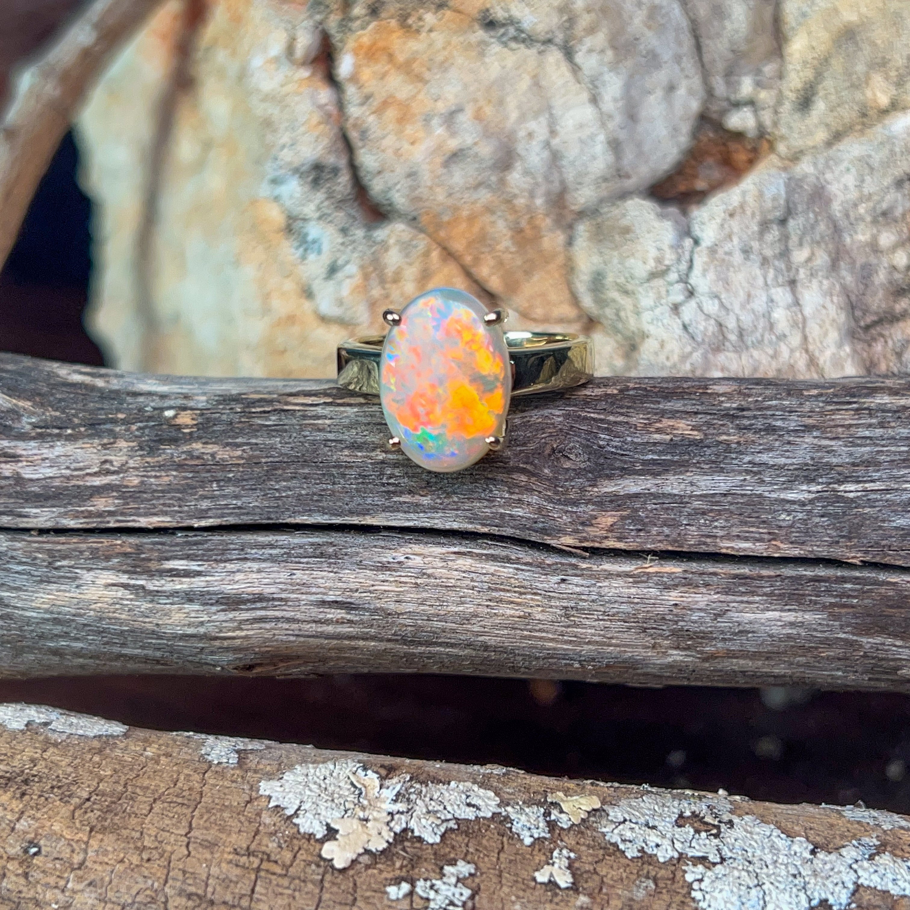 This stunning 14kt yellow gold solitaire ring features a magnificent 2.81ct Australian light opal that commands attention with its spectacular play of fire. The oval opal (14x10mm) displays a vibrant spectrum of colours—pink, red, yellow, blue, and green—creating a mesmerising statement piece that catches the light from every angle. Expertly set in a classic claw setting, this ring showcases the opal's natural beauty while the secure mounting ensures lasting wear. Perfect for those who appreciate bold, colourful gemstones that make a lasting impression. Ring size O 1/2, weighing 4.85g.