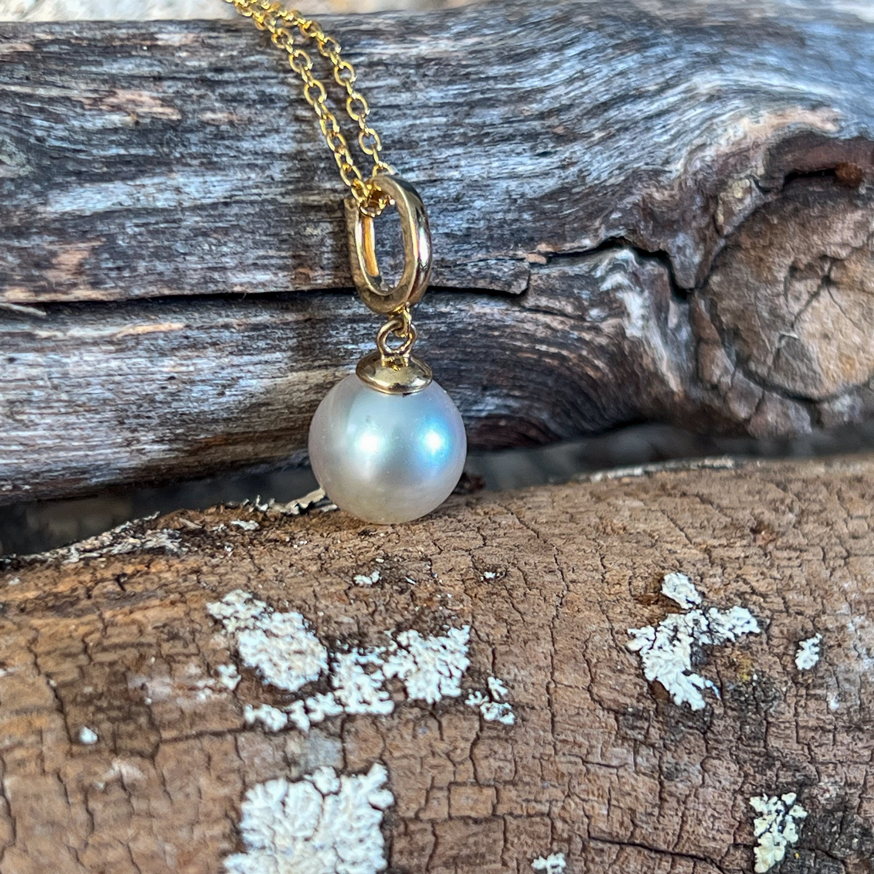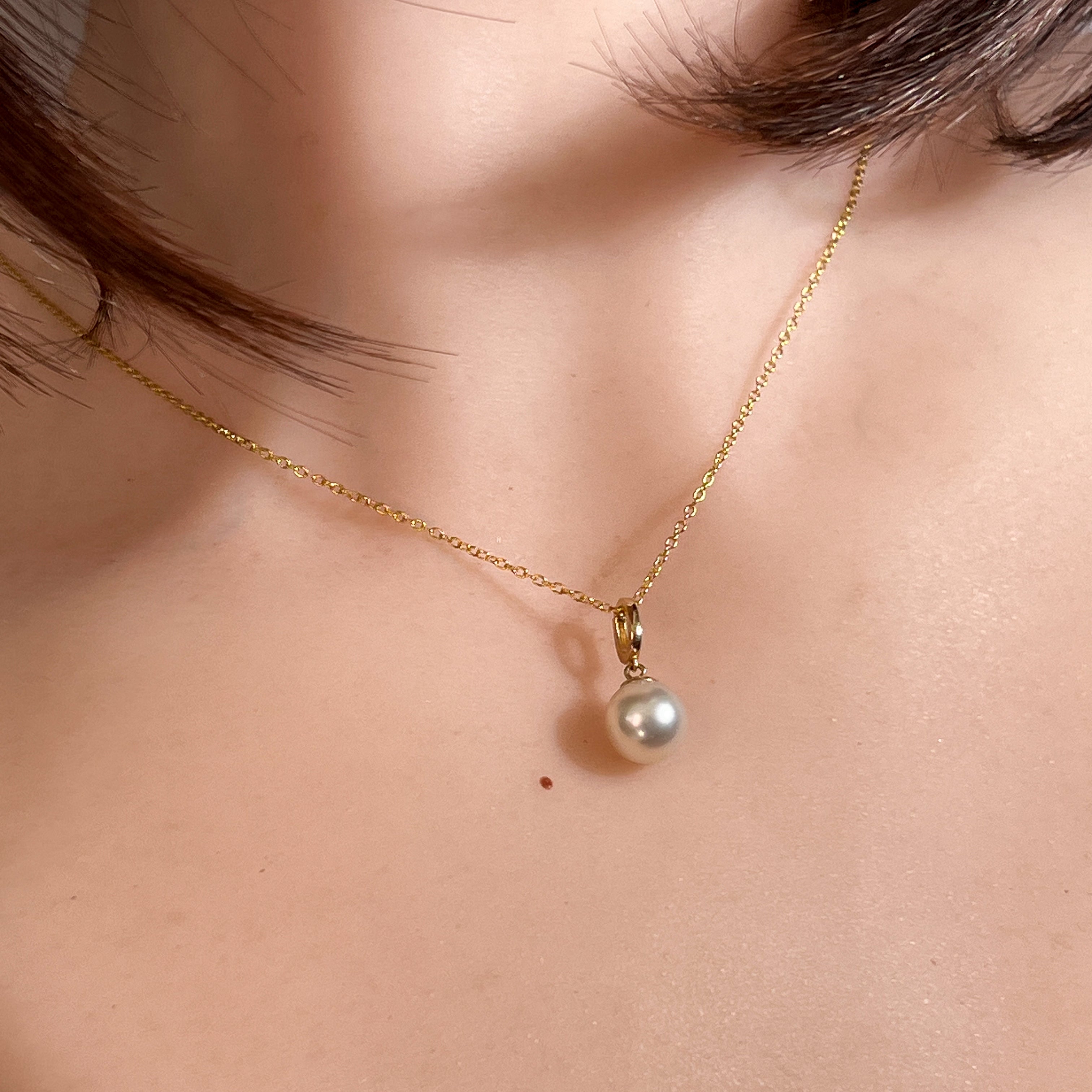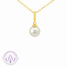 One 14kt Yellow Gold South Sea Pearl solitaire classic pendant featuring one Australasian South Sea Pearl, 8.5-9mm off round in white colour. This timeless piece measures 19mm in length and weighs 1.2g, offering elegant simplicity with the lustrous beauty of a premium South Sea pearl set in warm yellow gold.