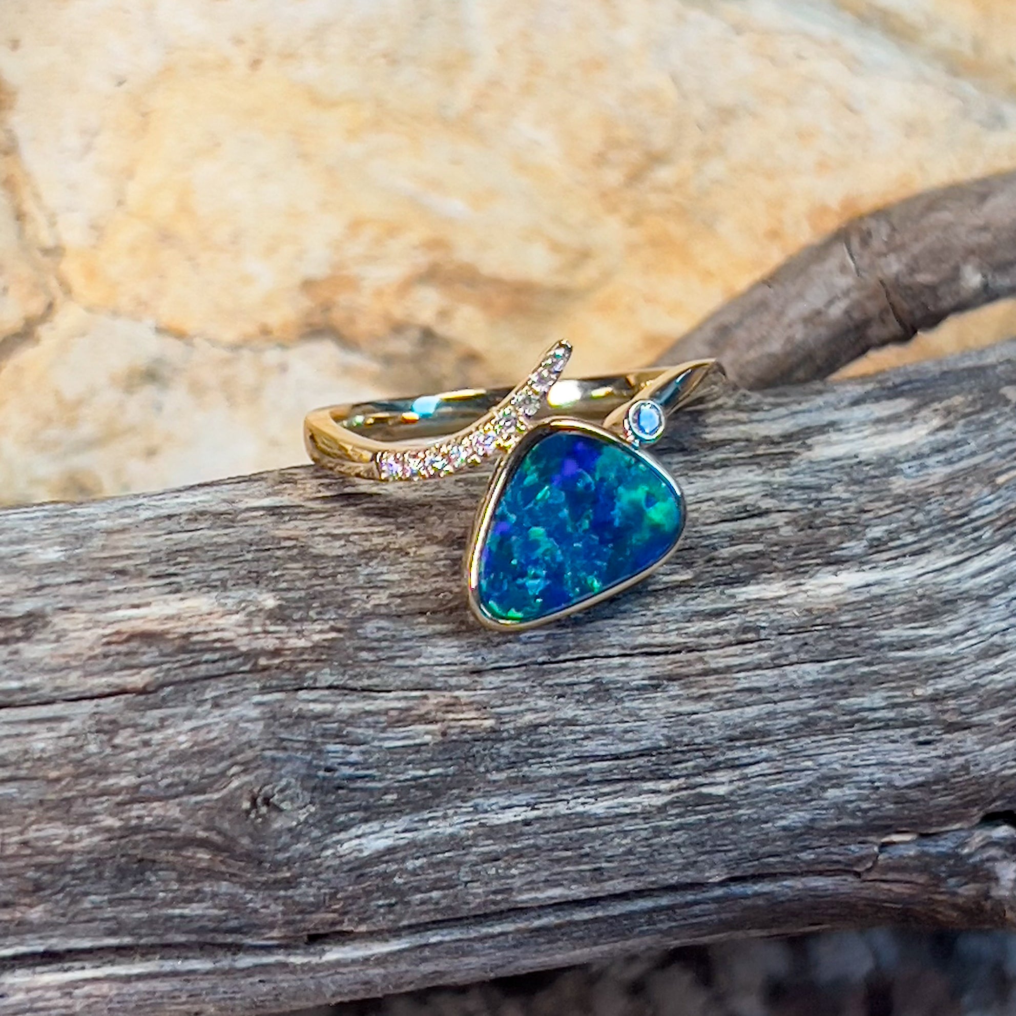 14kt Yellow Gold split shank Opal 1.37ct doublet and diamond ring