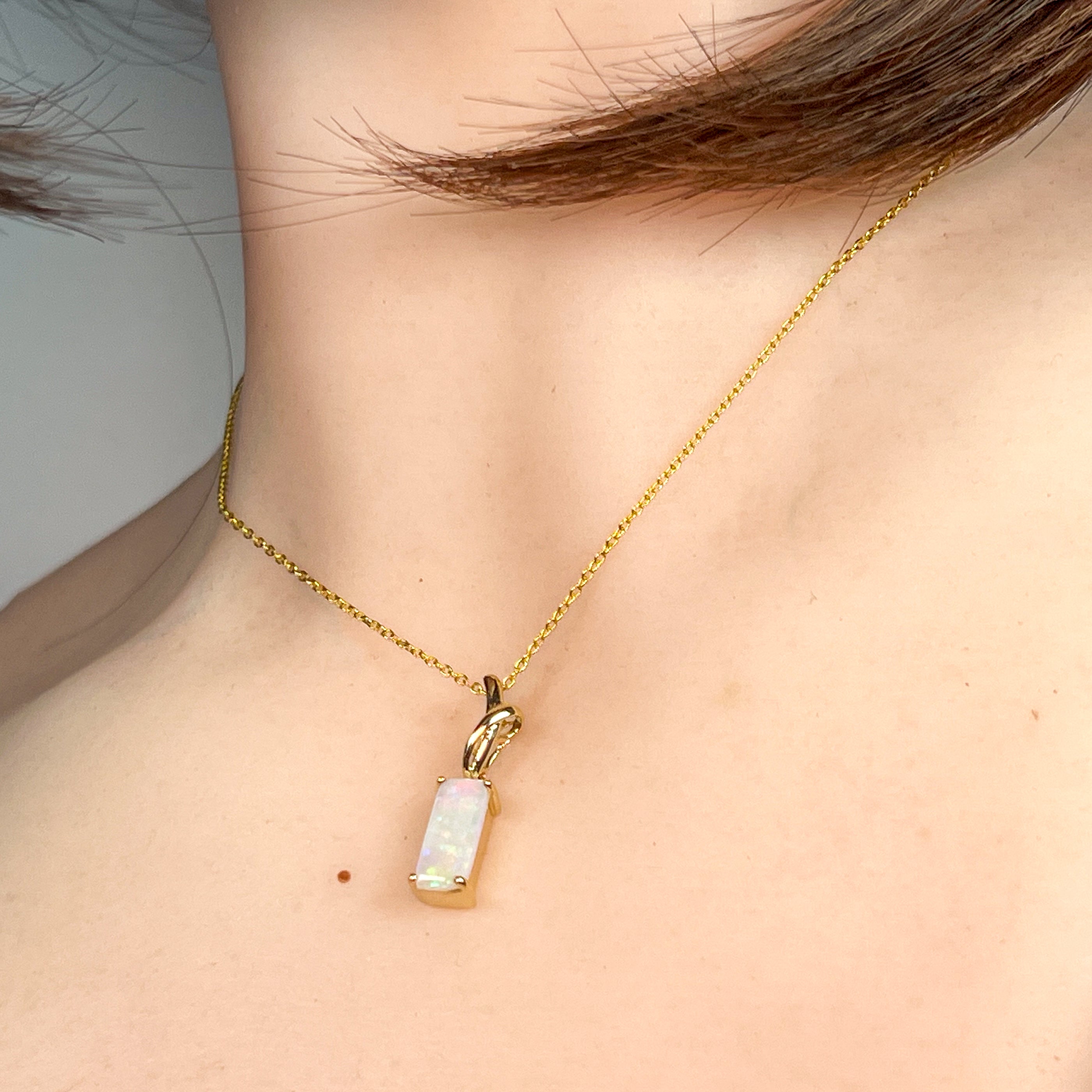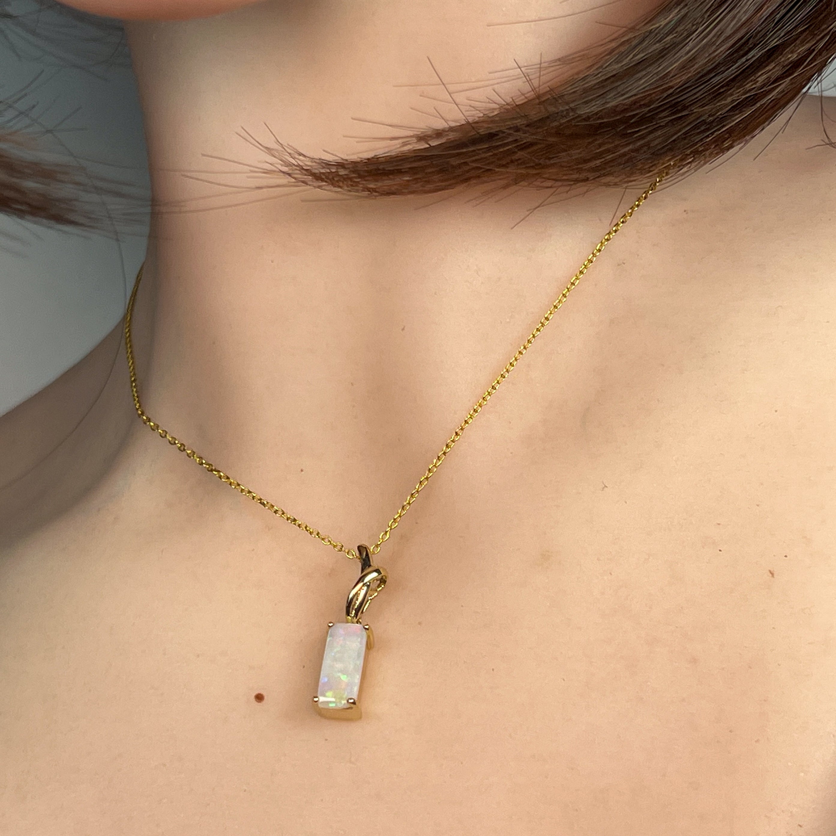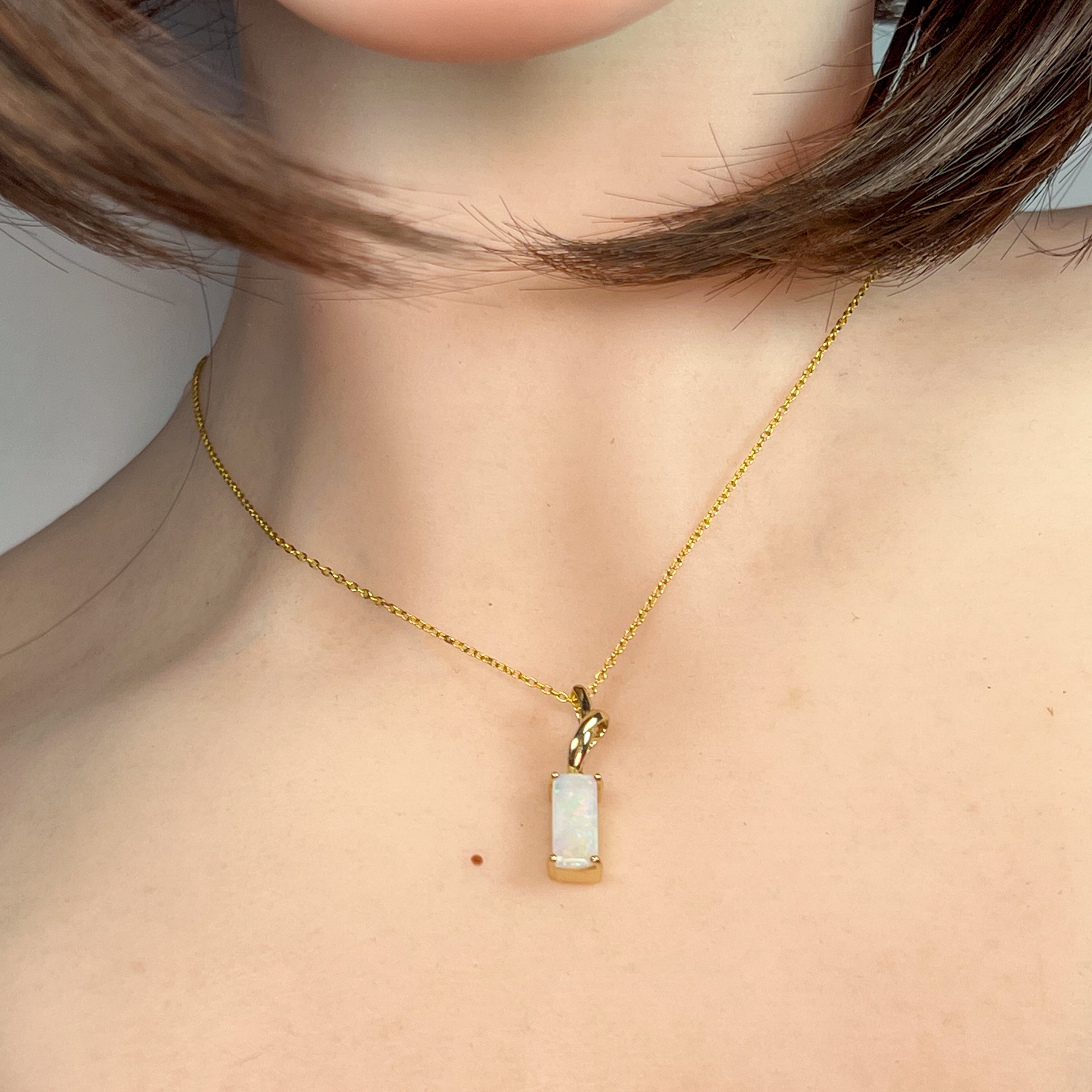 Elevate your elegance with this delicate 14kt yellow gold pendant featuring a stunning 1.38ct rectangular cut white opal. Its subtle yet radiant glow adds a refined touch to any outfit, perfect for everyday wear or special occasions. The dainty design offers timeless beauty that effortlessly complements your style.