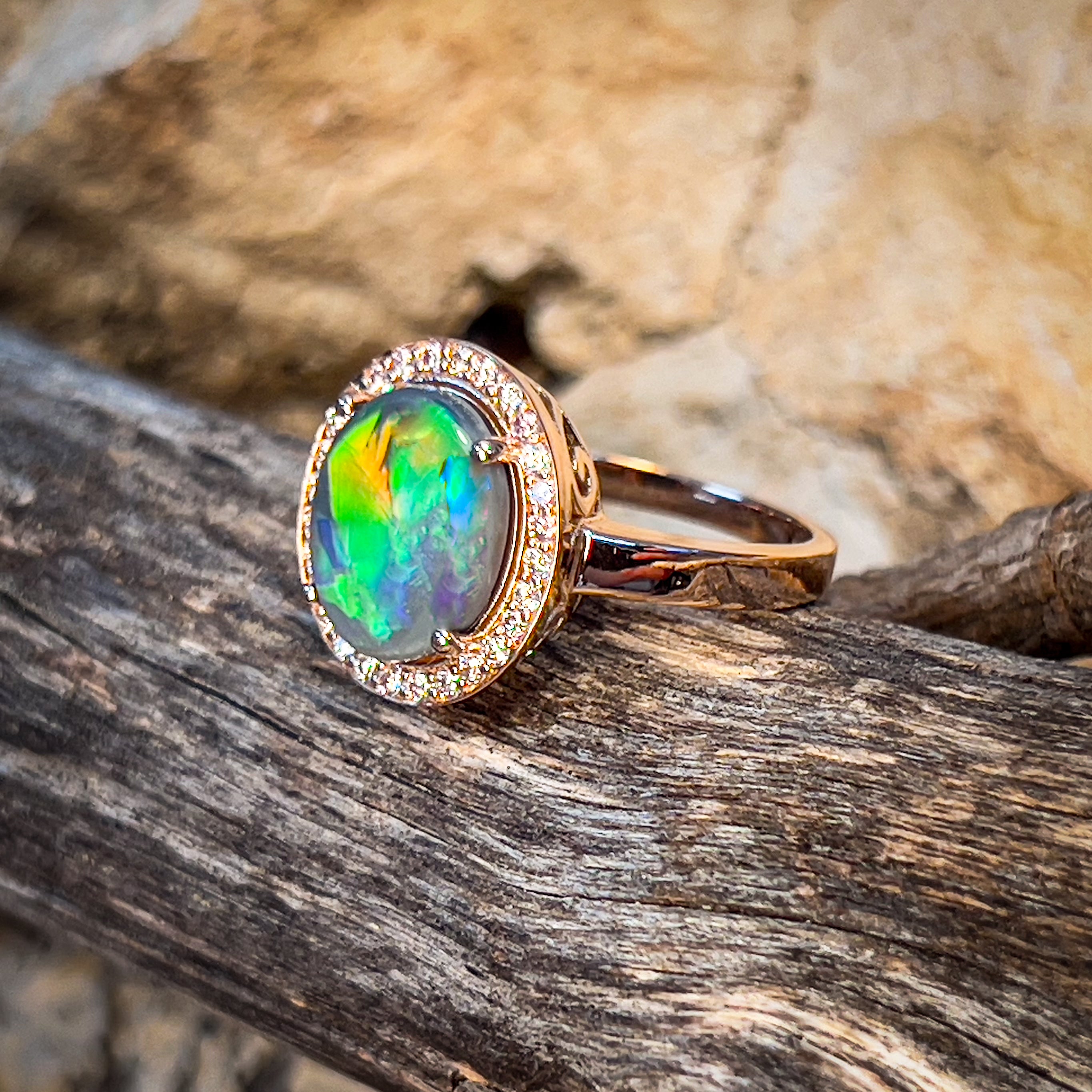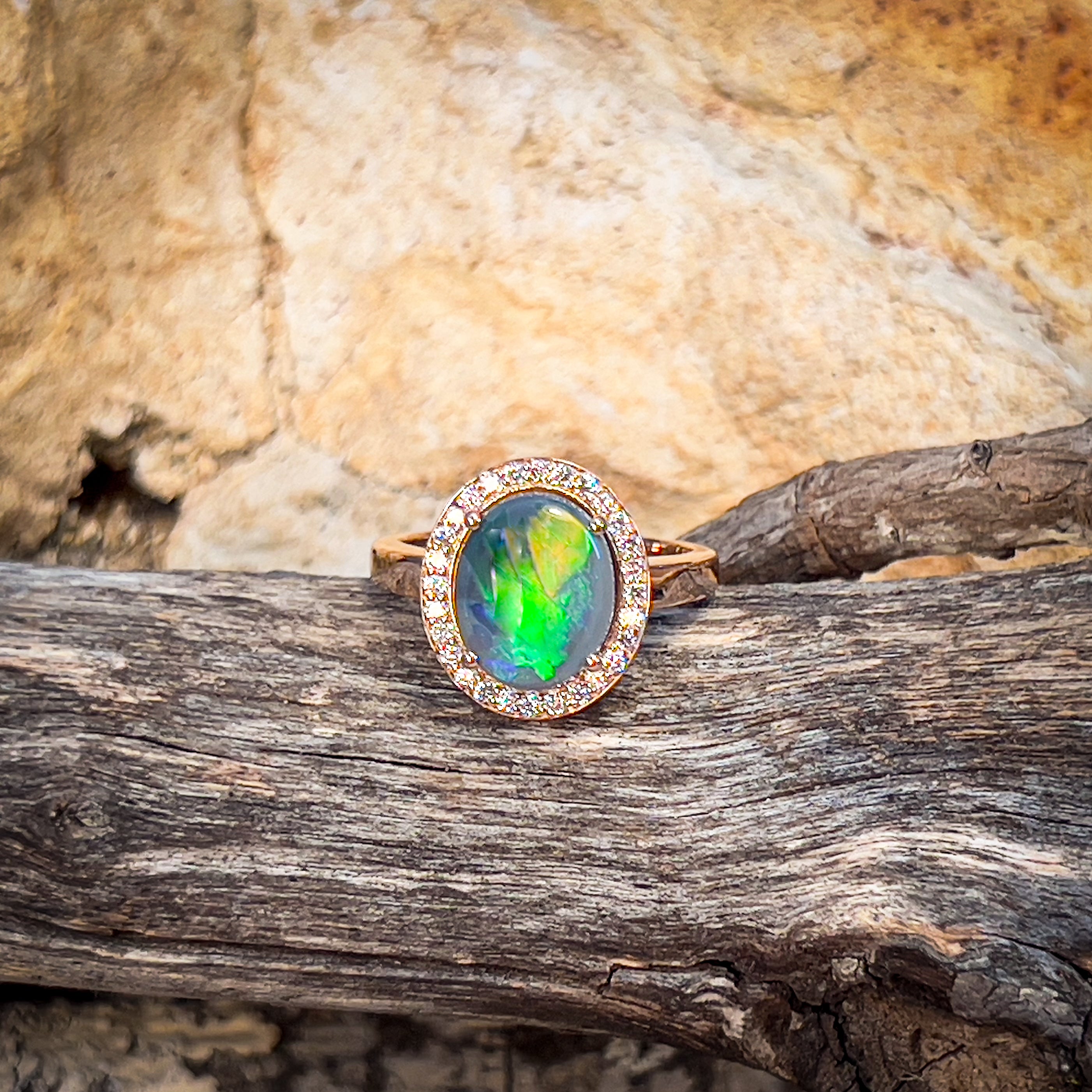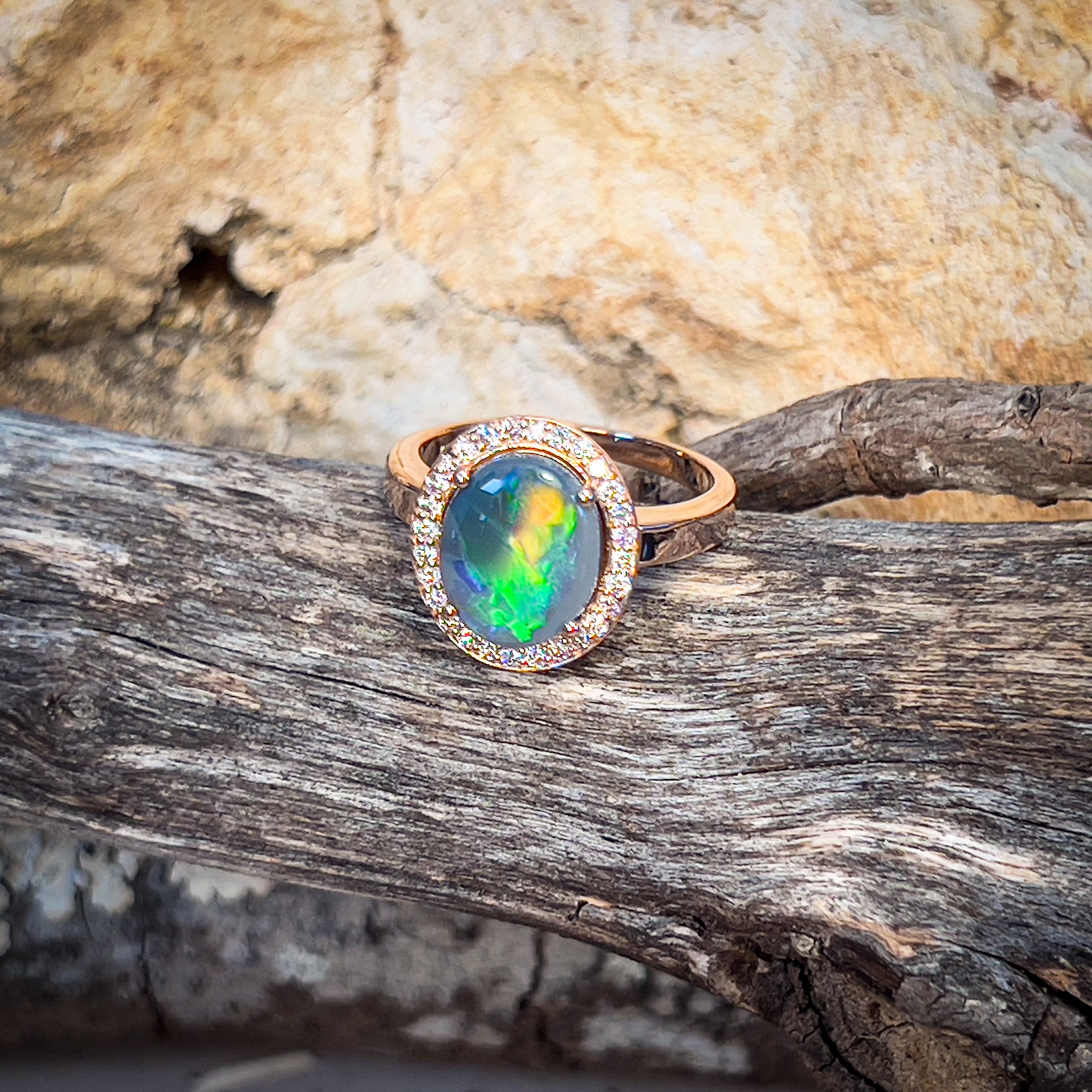 18kt Rose Gold Black Opal 2.13ct Light pink diamonds 0.28ct halo ring