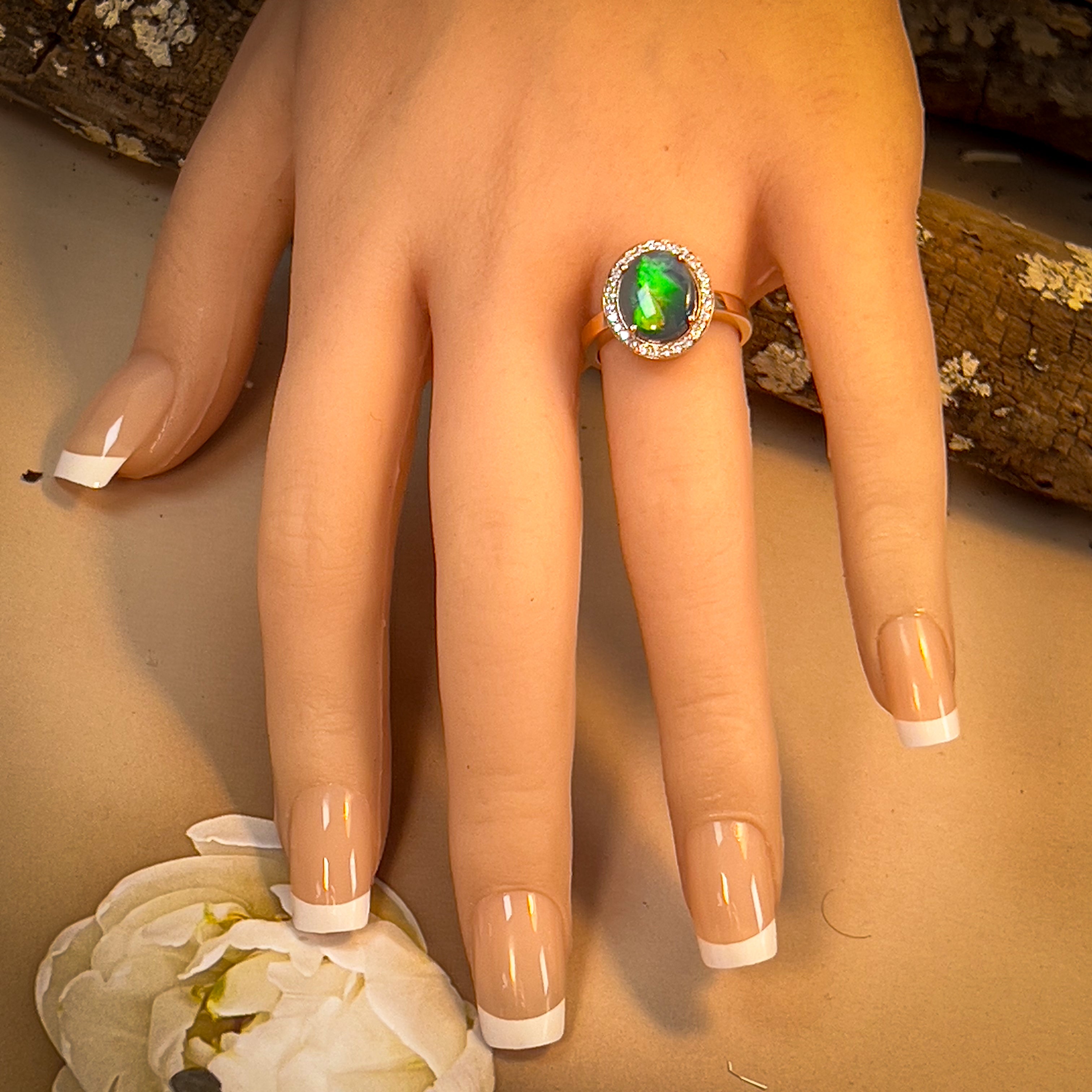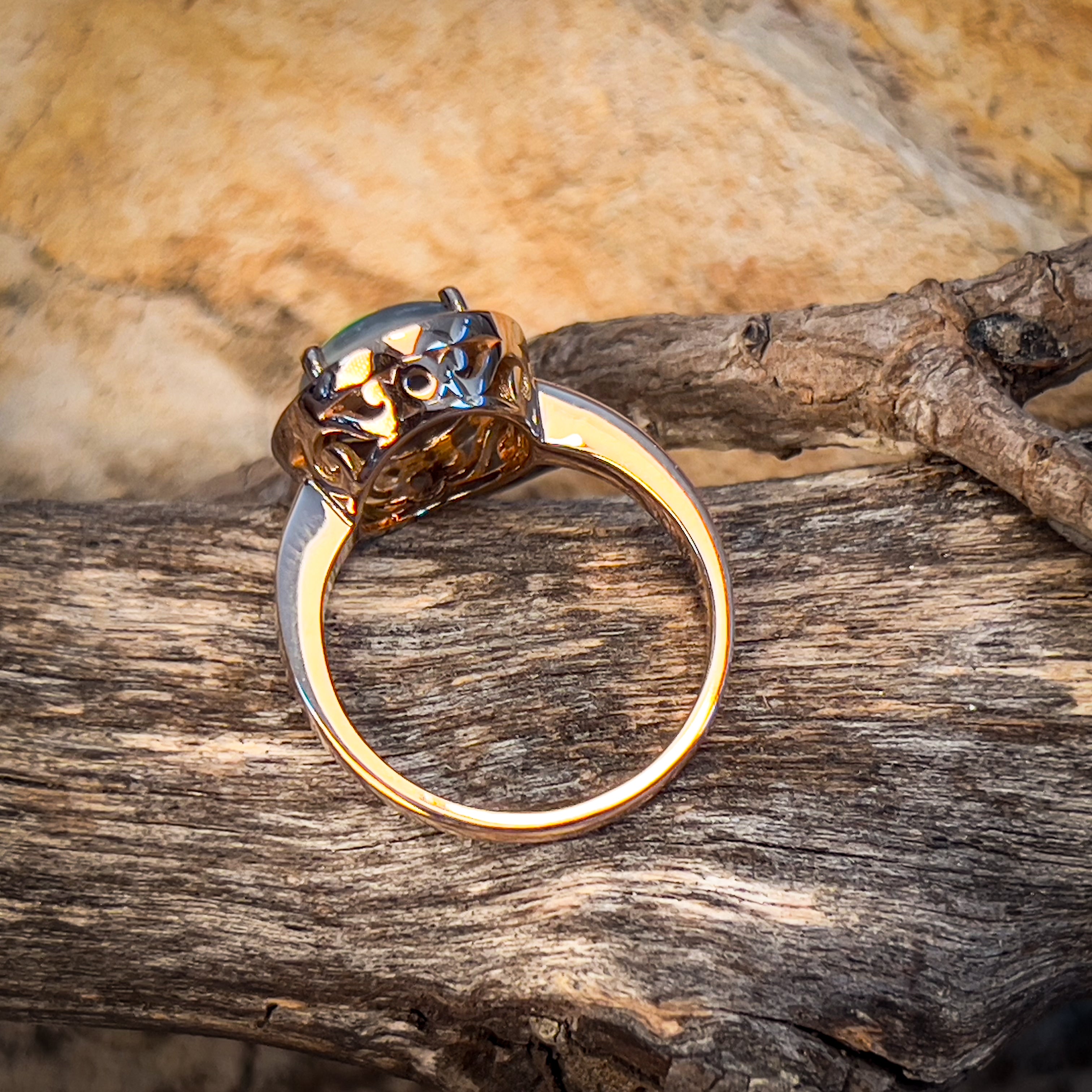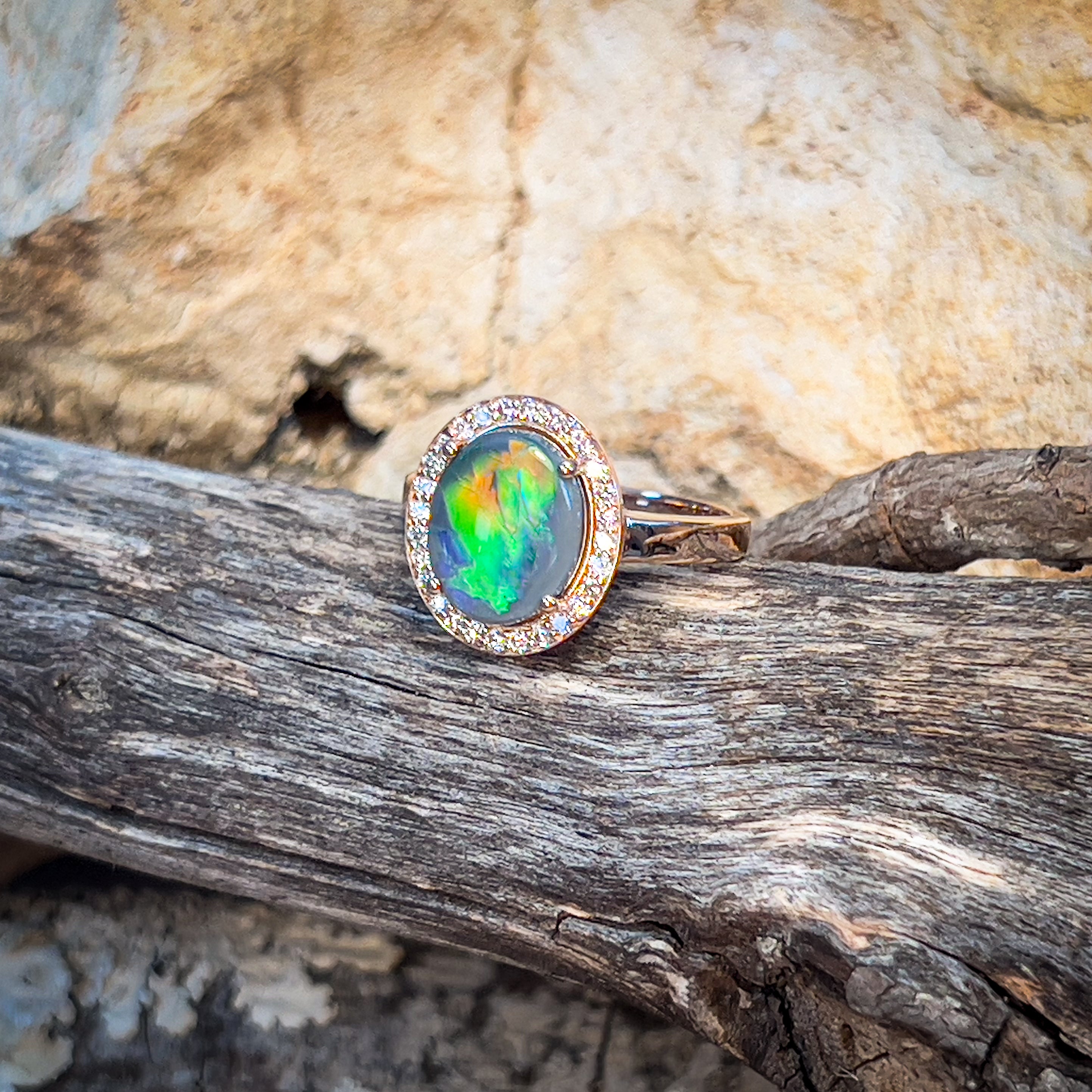 18kt Rose Gold Black Opal 2.13ct Light pink diamonds 0.28ct halo ring