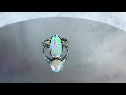 Indulge in the rare beauty of our 18kt White Gold Crystal Opal 2.01ct and 0.18ct Diamonds ring. This elegant piece features a stunning freeform crystal opal shell adorned with sparkling diamonds. Experience luxury and sophistication with this exclusive ring, perfect for any special occasion.