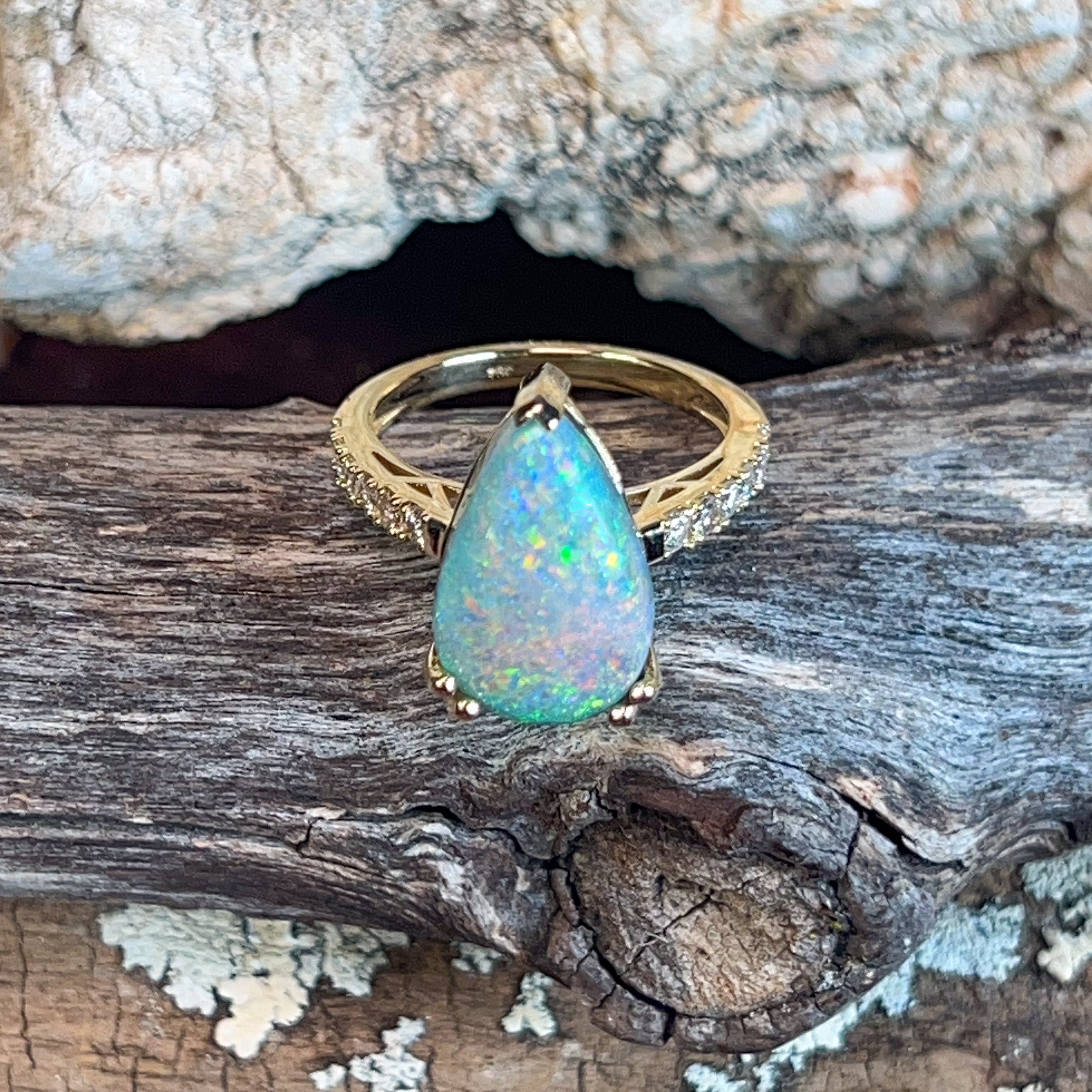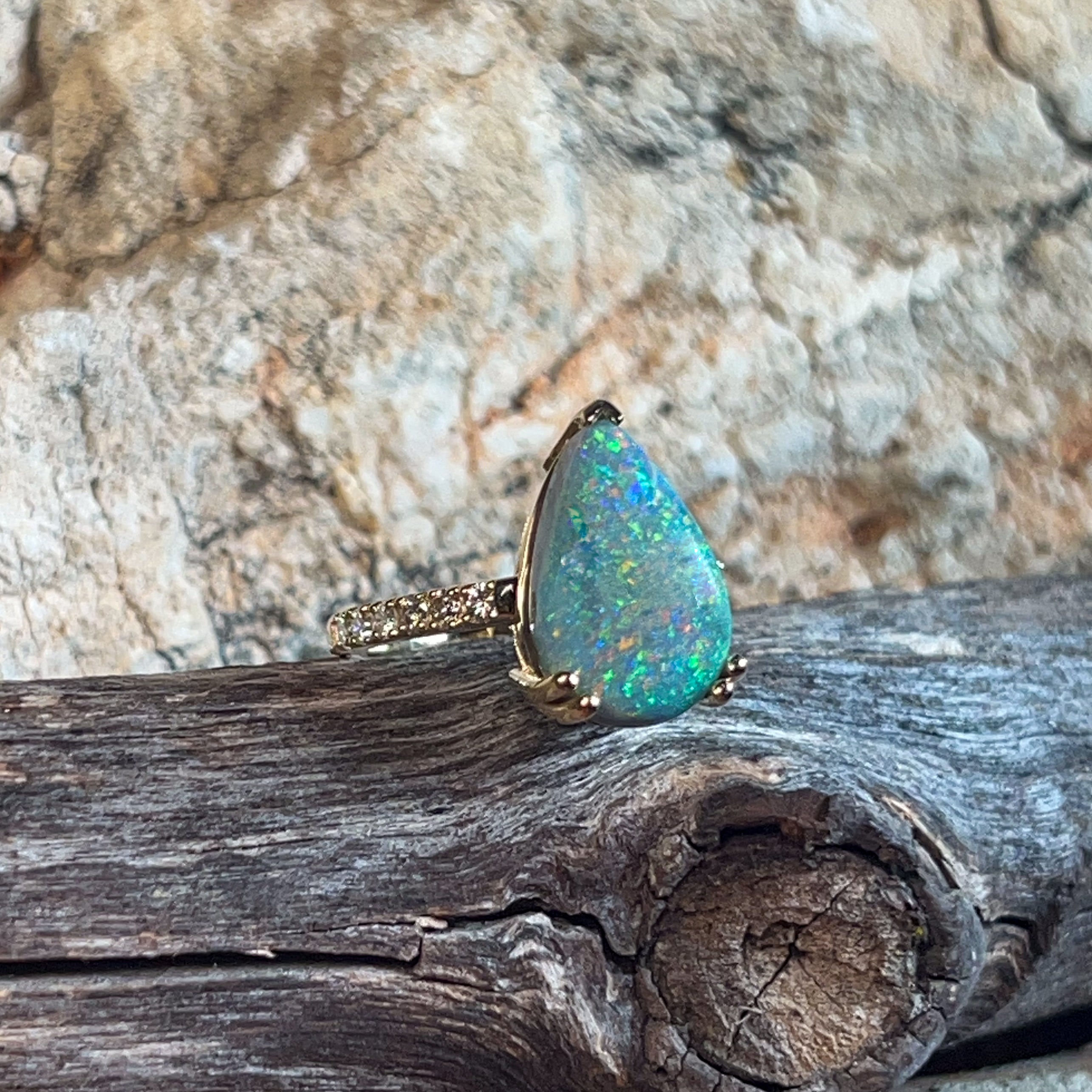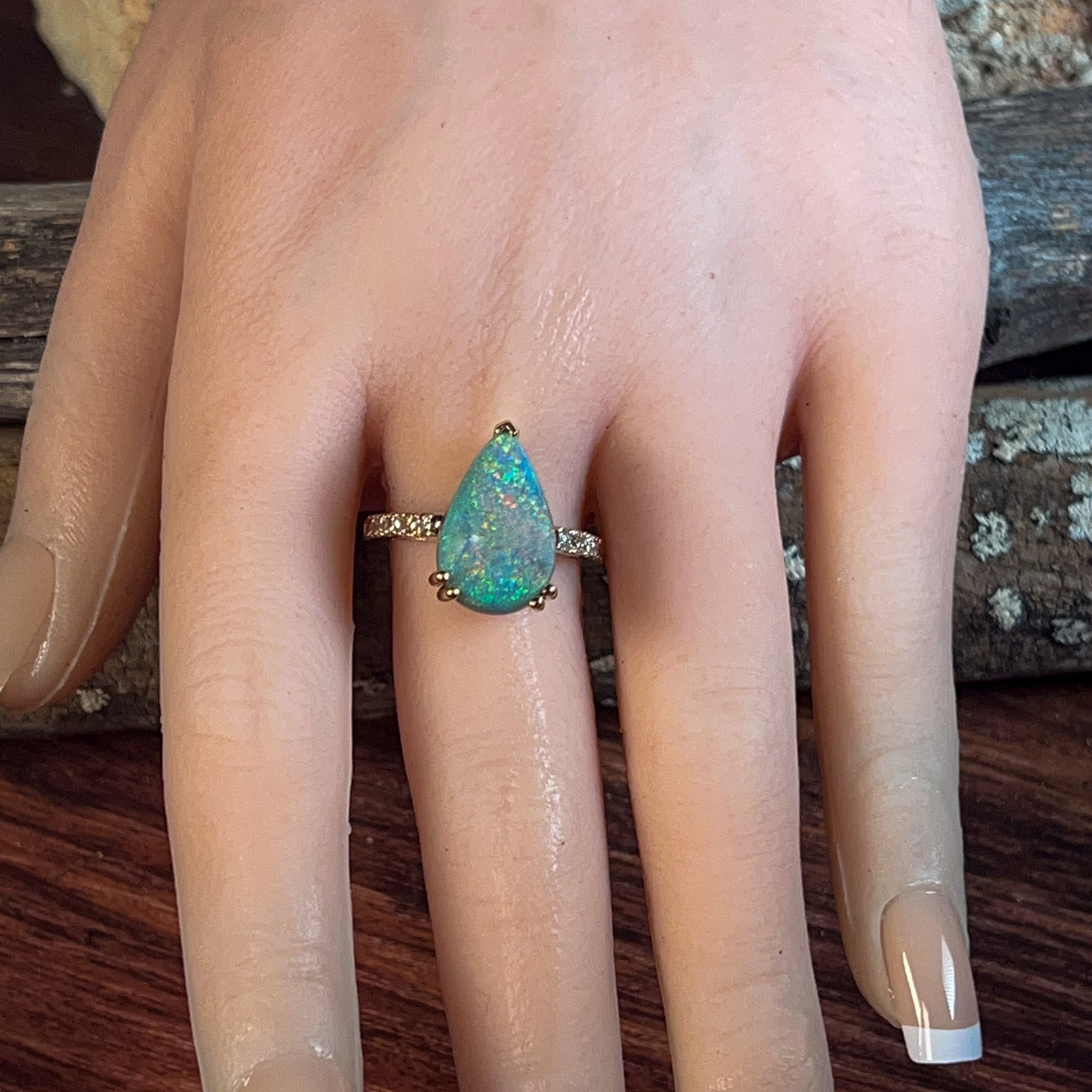 18kt Yellow Gold Black Opal Pear shape 6.8ct and diamond ring