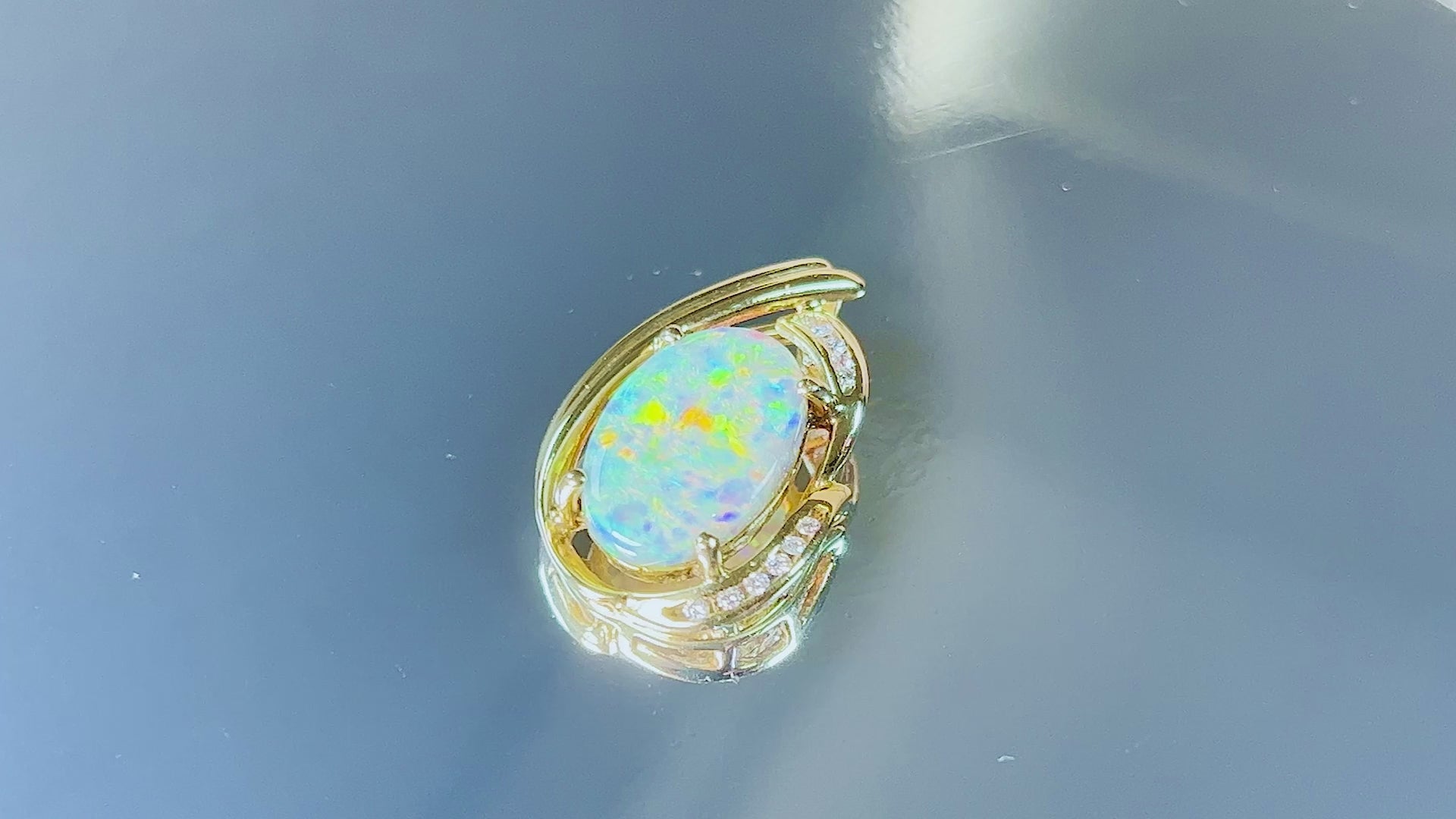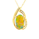 This timeless 18Kt yellow gold pendant is the perfect gift for a special woman in your life. Show her just how much you care by gifting her this beautiful necklace with a unique 5.39ct black opal and diamond design. The vivid and vibrant colors of the lightning ridge black opal combined with the sparkle of the gold and diamonds make this an exquisite piece of jewelry that is sure to be treasured for years to come.