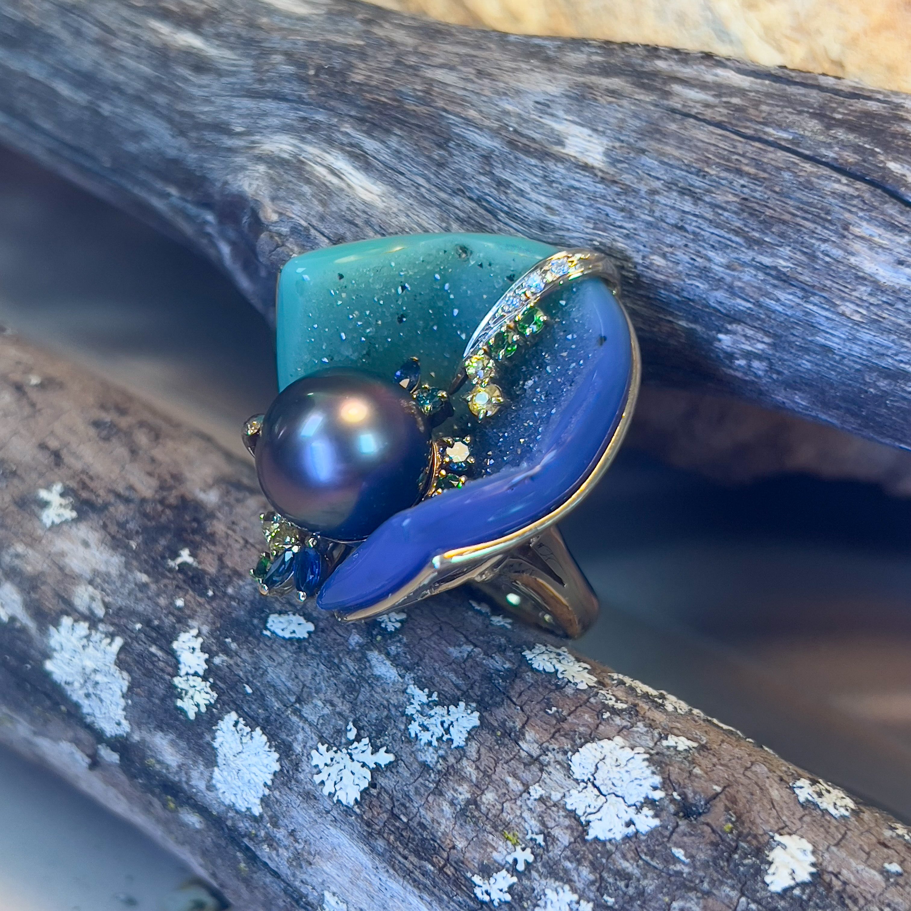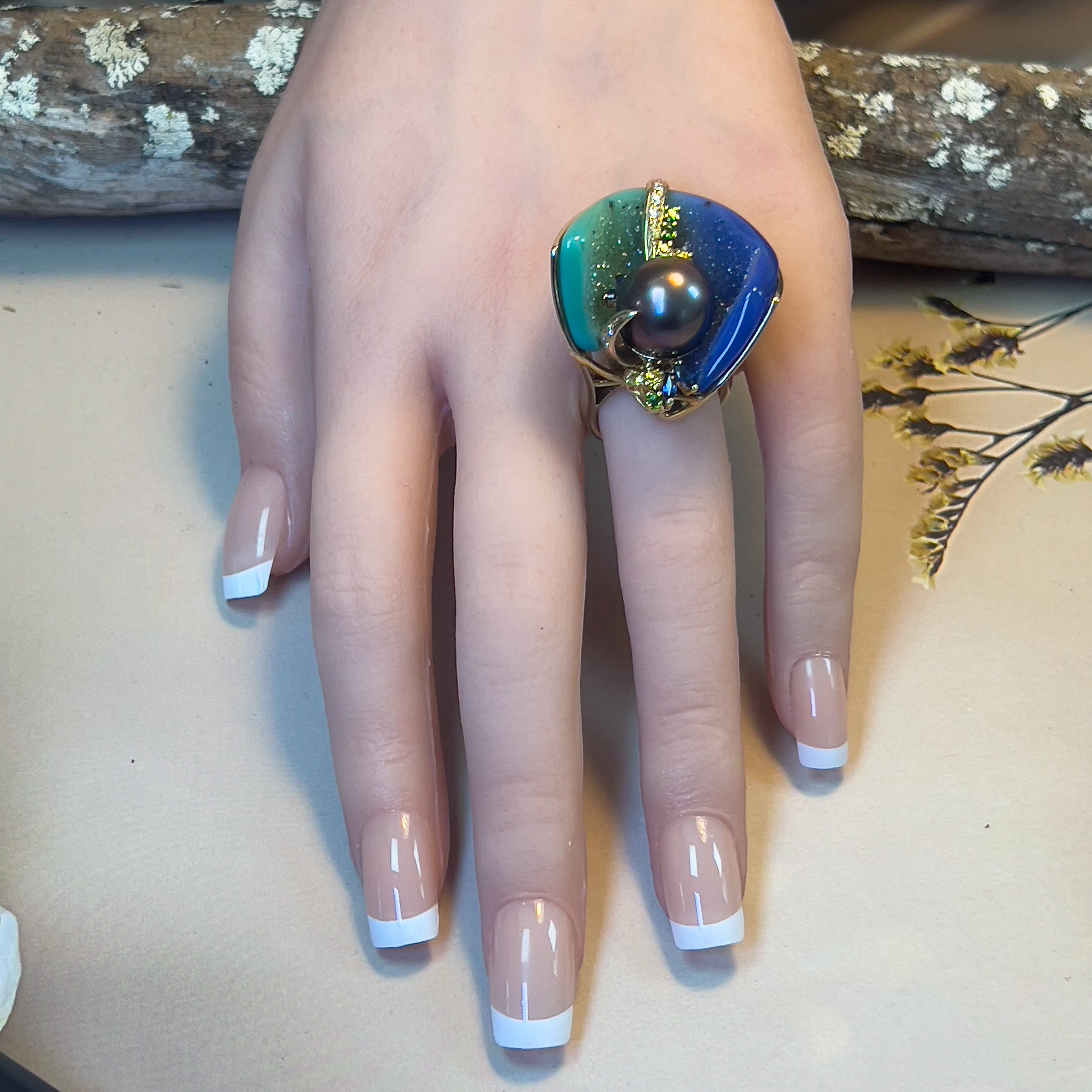 18kt Yellow Gold Tahitian Pearl ,Agate, diamond and sapphire ring