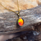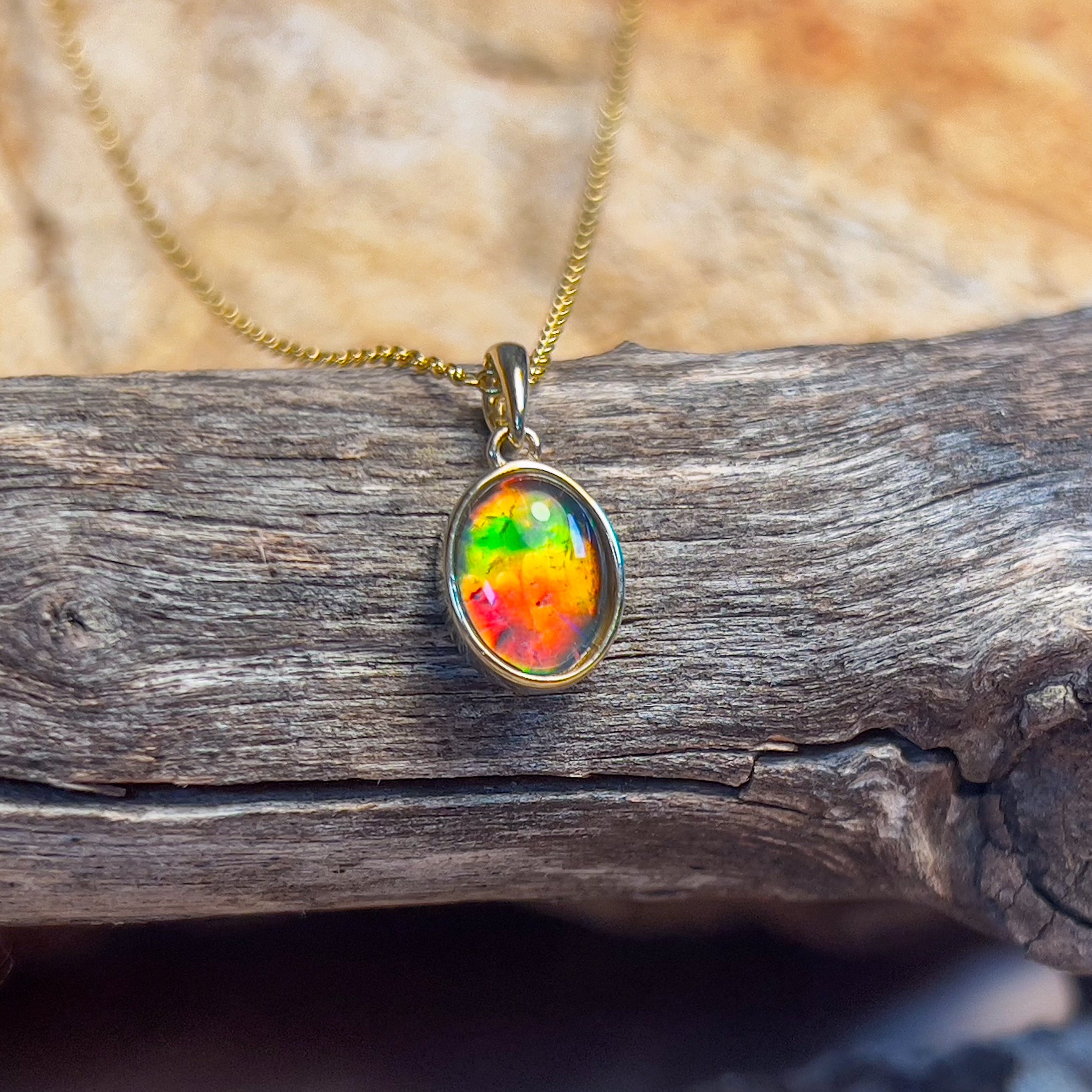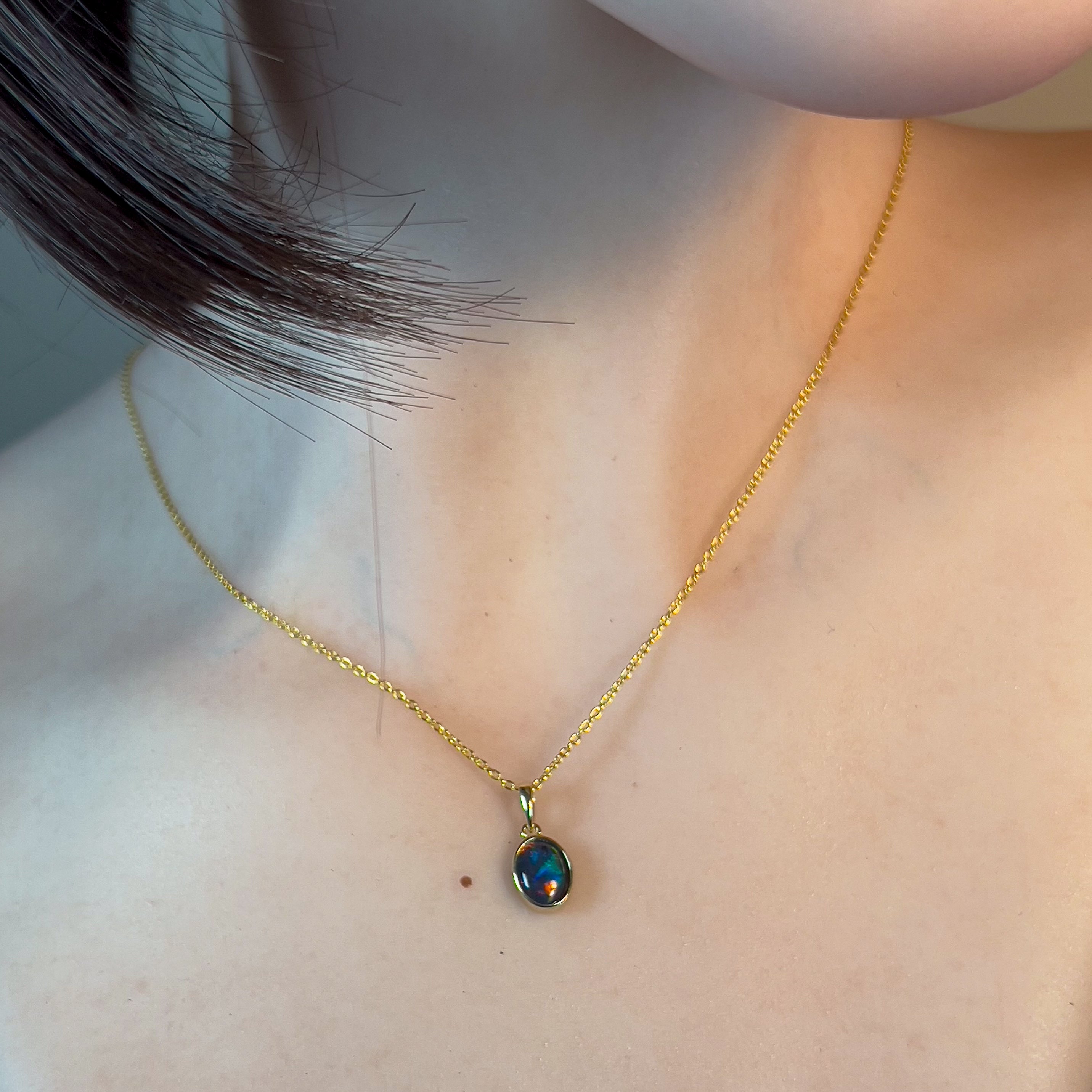 Add a touch of elegance to your jewelry collection with our 9kt Yellow Gold Opal Triplet Pendant. The 9x7mm bezel set opal triplet adds a pop of color and the gold chain creates a classic and timeless look. Hand-crafted with care and sophistication, this necklace is perfect for any occasion.