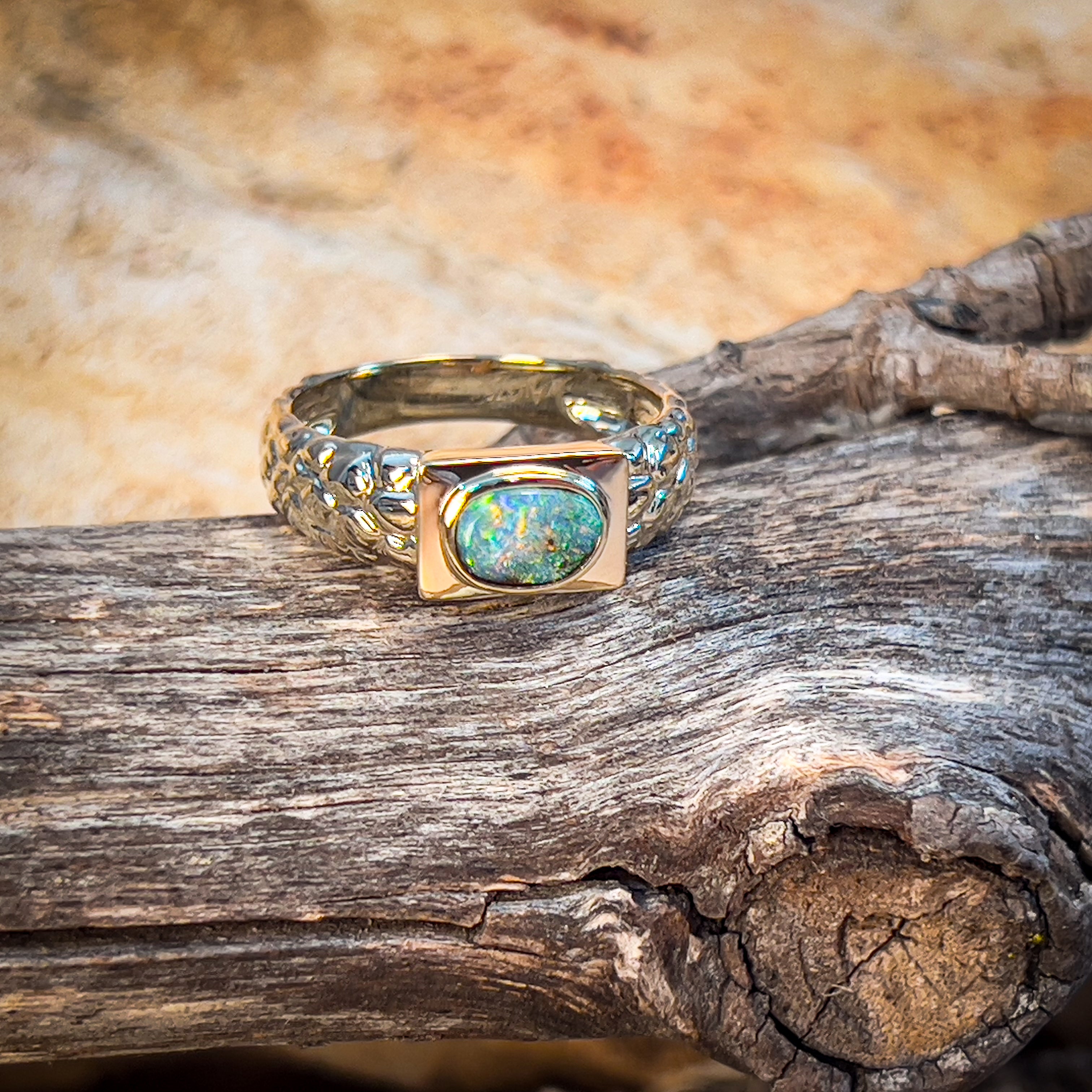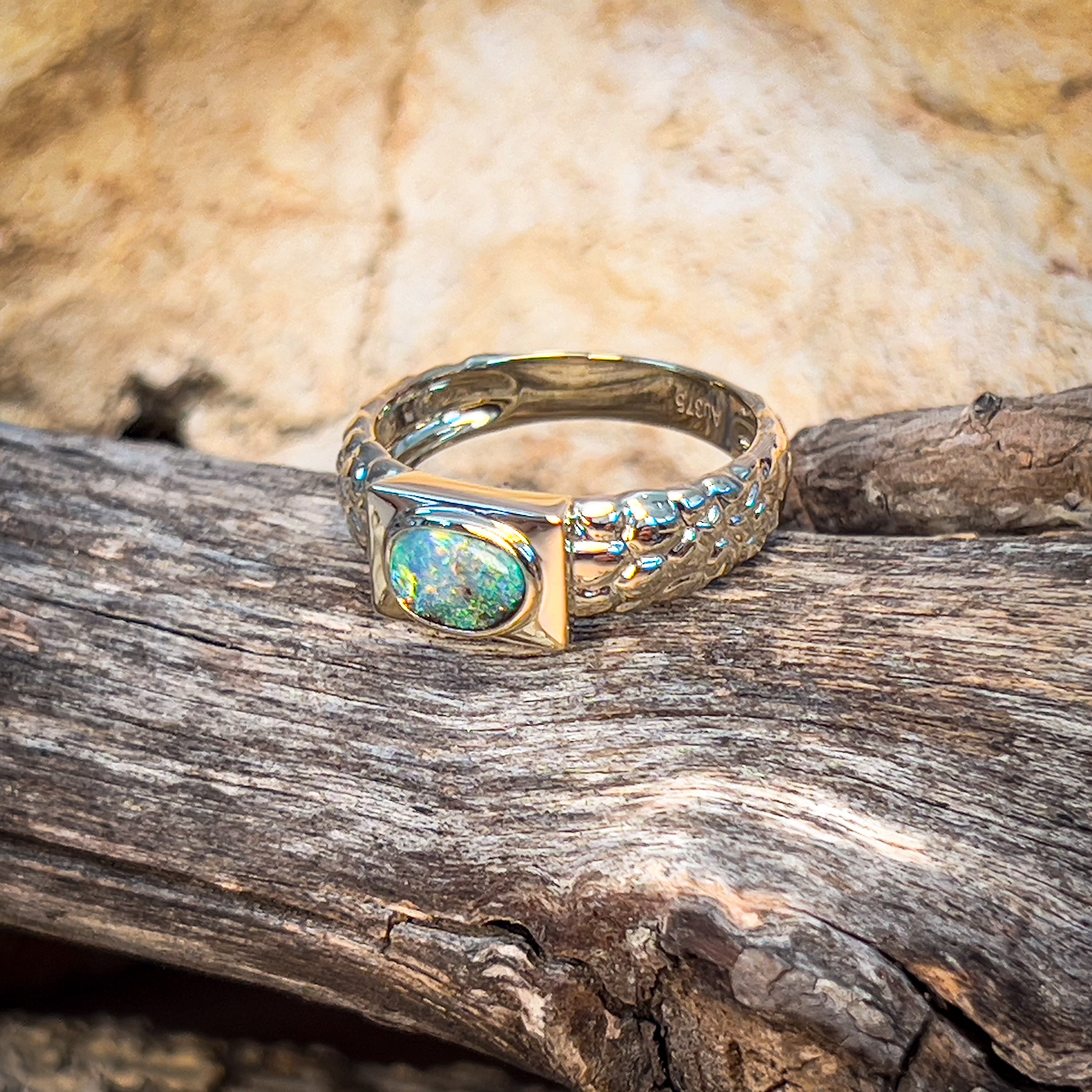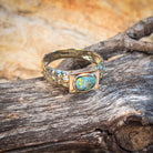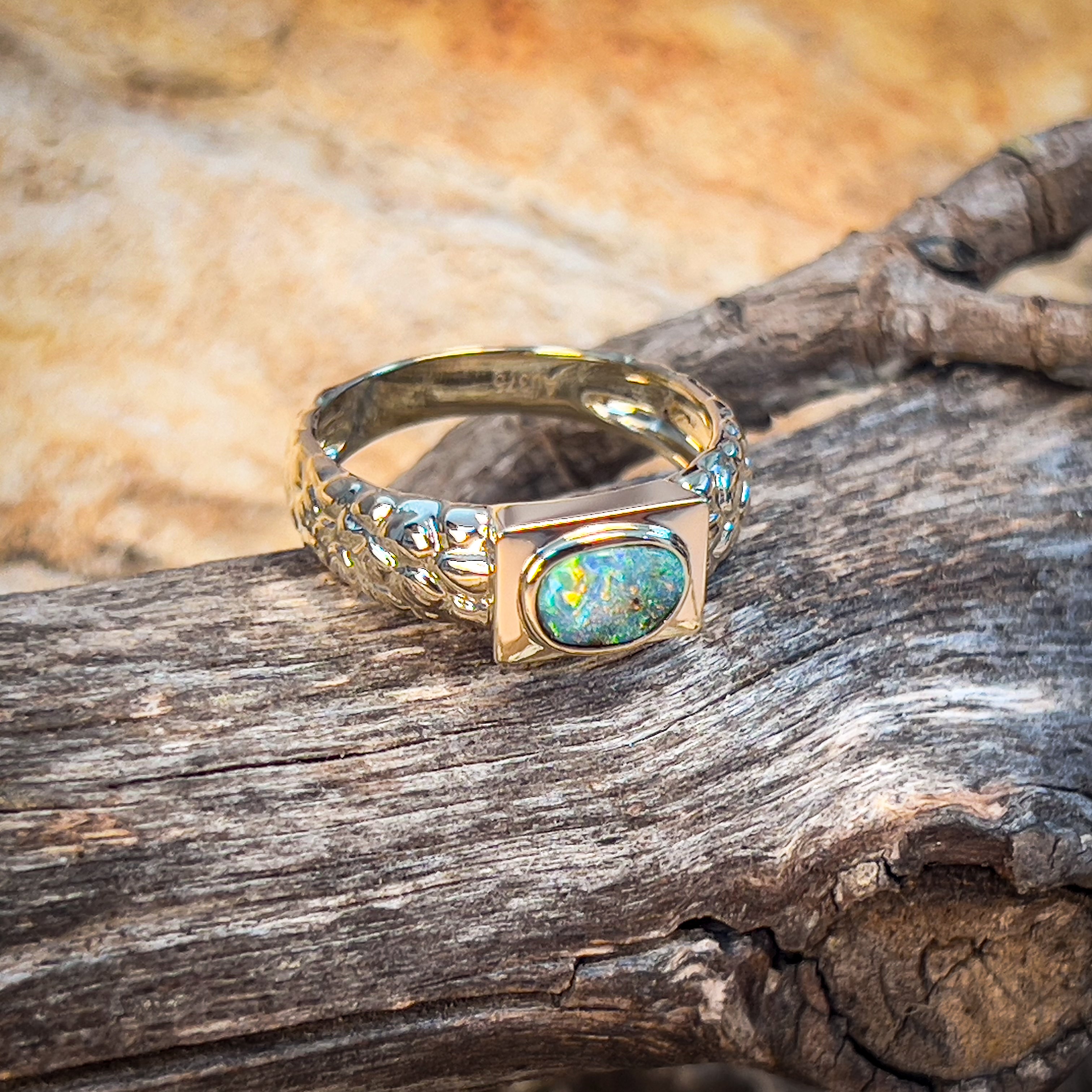 Get ready to rock some serious style with this 9kt yellow gold nugget look boulder opal ring! Unisex and boasting a stunning 0.39ct opal, this ring is the perfect mix of edgy and elegant. Don't miss out on this one-of-a-kind piece.