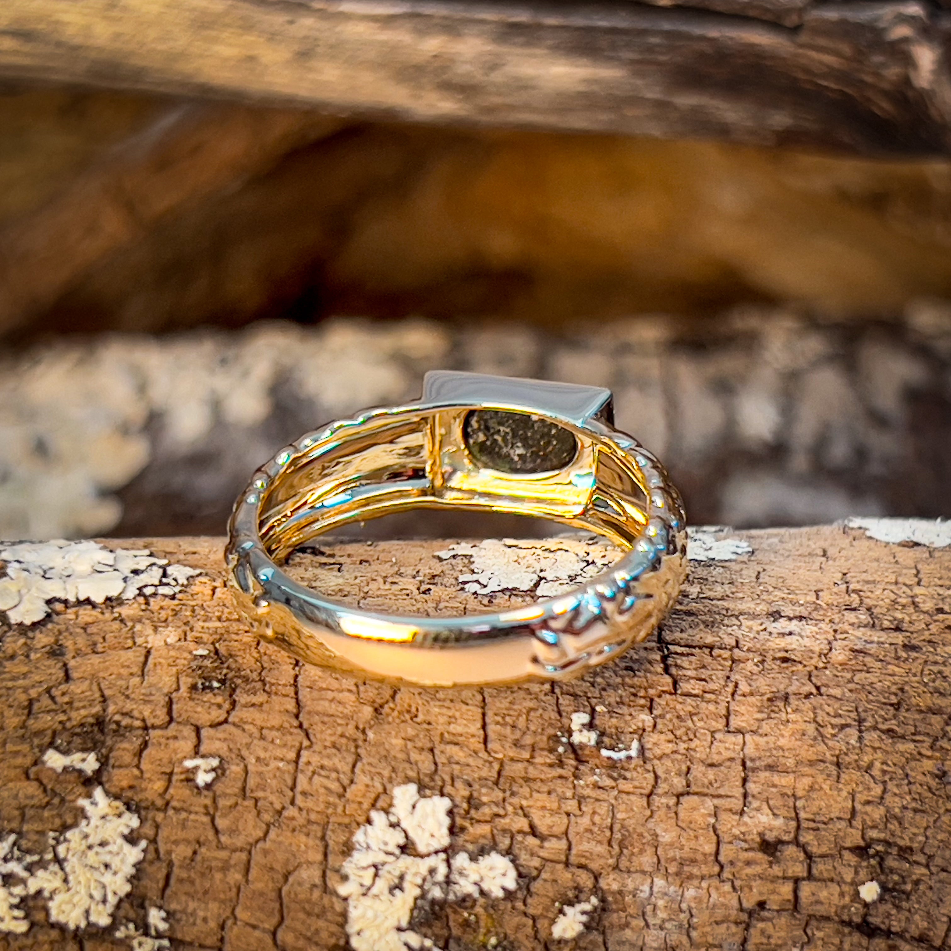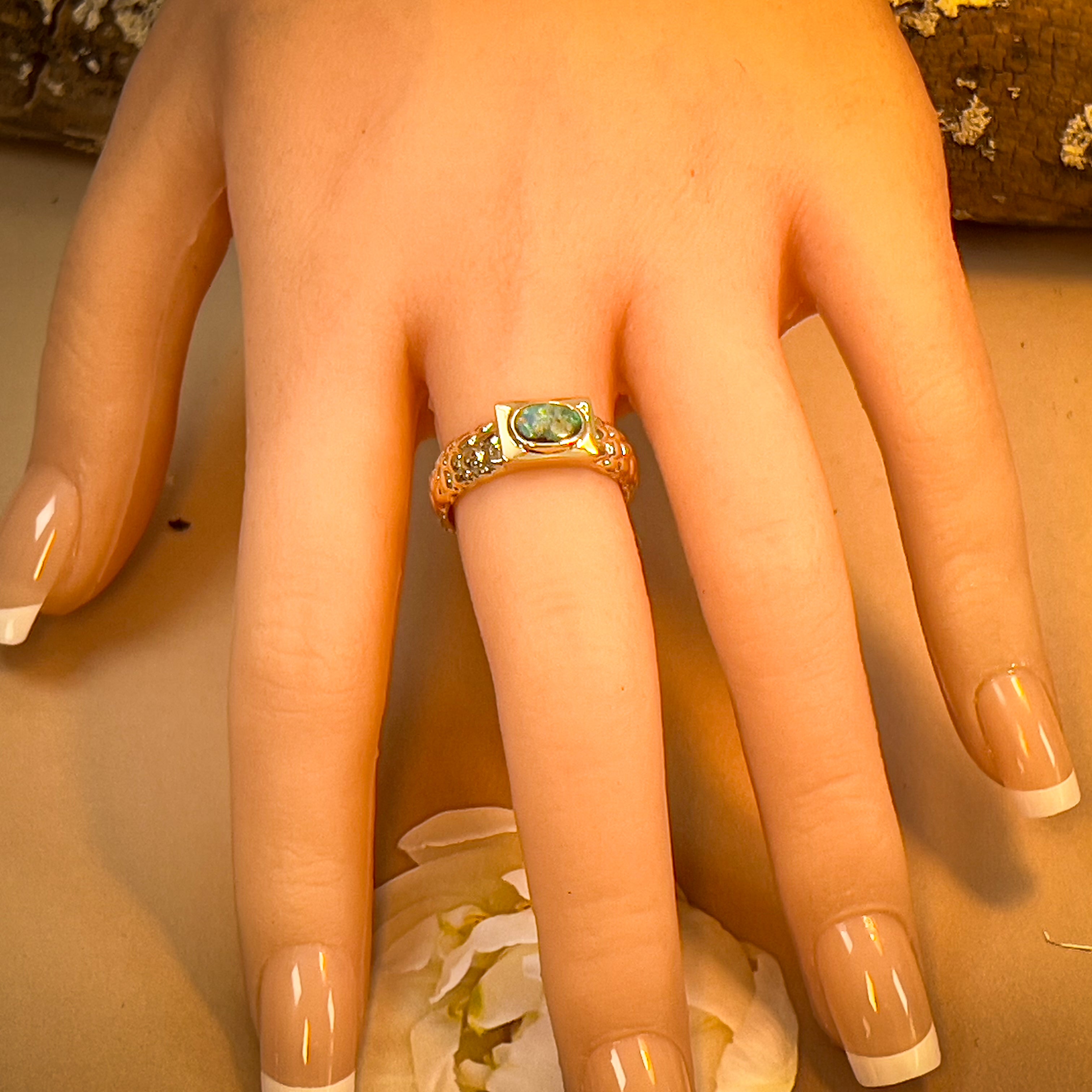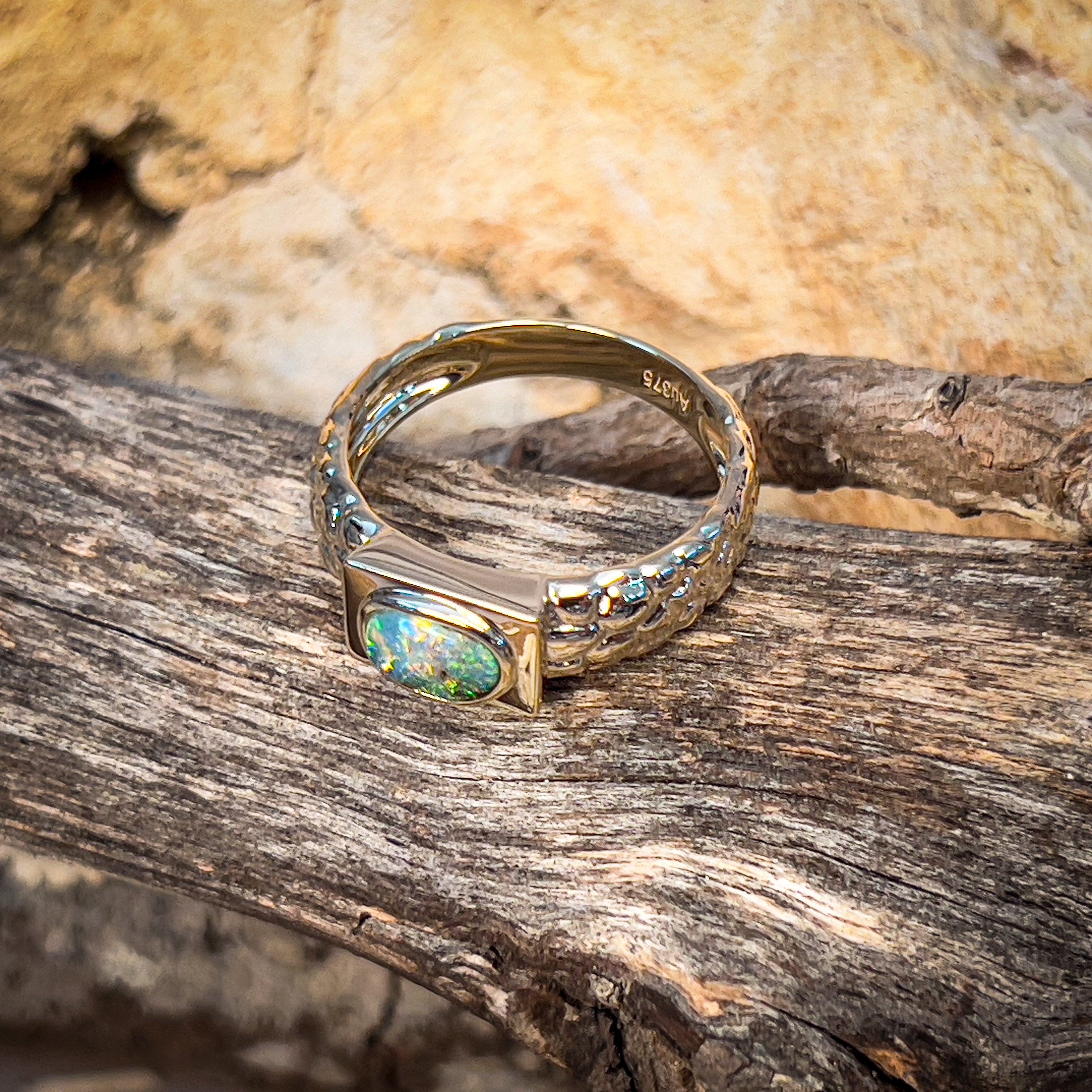 Get ready to rock some serious style with this 9kt yellow gold nugget look boulder opal ring! Unisex and boasting a stunning 0.39ct opal, this ring is the perfect mix of edgy and elegant. Don't miss out on this one-of-a-kind piece.