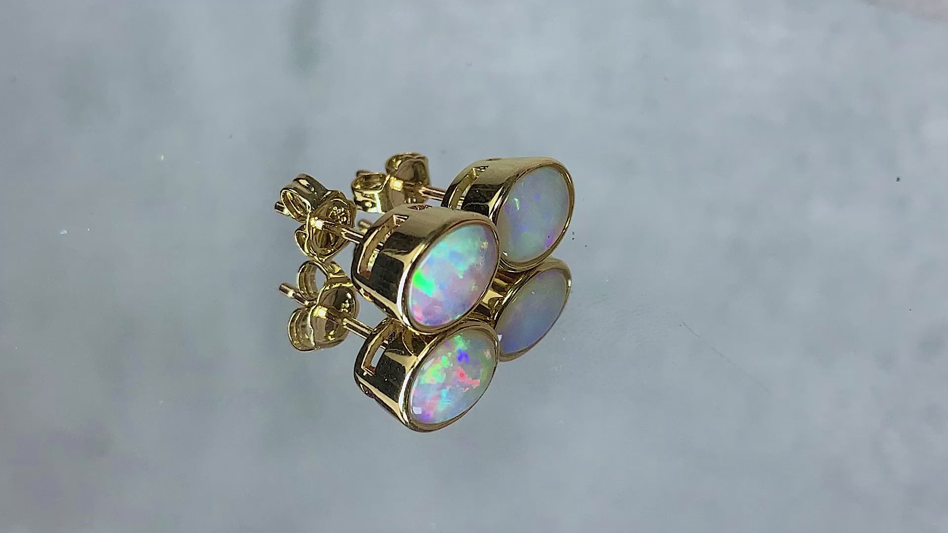 One pair of 9kt Yellow Gold bezel set earrings2 Australian Light Opals 1.36ct oval shape multi colour